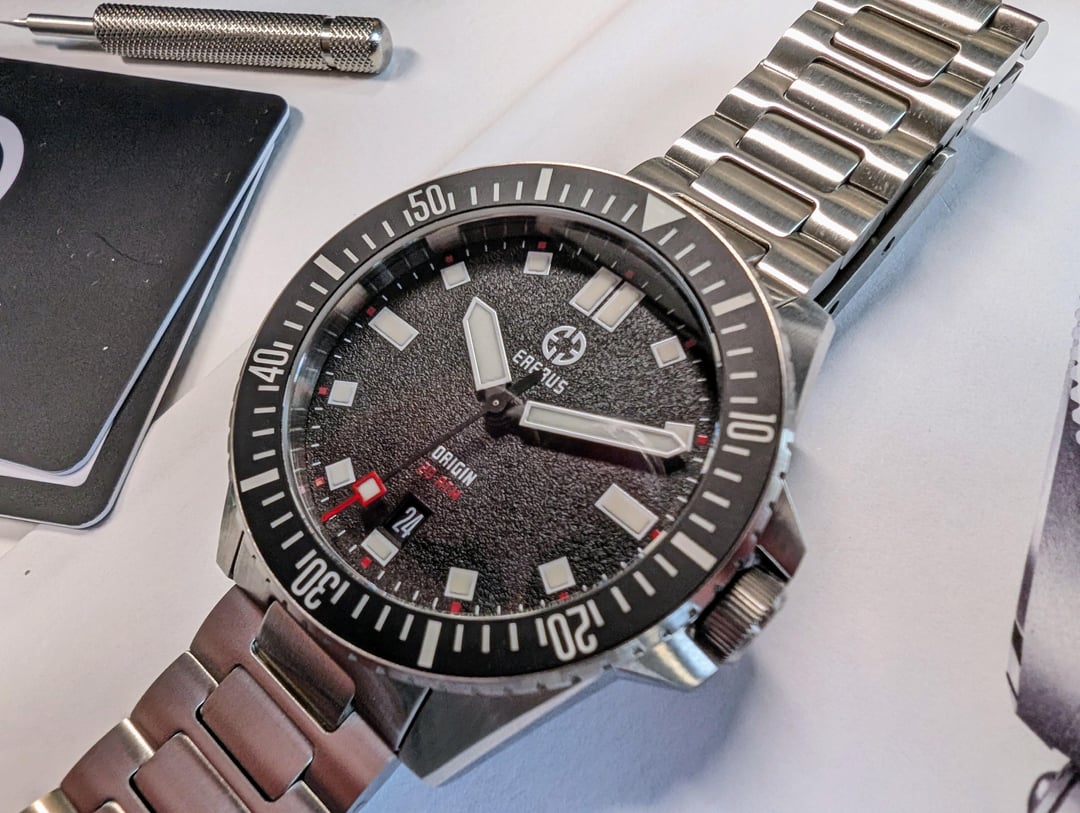 Hi Everyone! Up for sale is a like-new Erebus Origin 41. Purchased as part of Jody's first launch, I've worn it once in the last 2 years and would really like to pass it on to someone who will enjoy it. It is a cracking watch, well built, smooth movement and seems built like a tank. Only selling because it's more of a tool watch and I don't generally wear that style, which is why it hasn't gotten the wrist time it deserves. :) Watch comes with all of the original goodies, cool travel case, warranty card, extra links, etc. The watch case and glass looks flawless, and only a few light desk diving marks. Primarily looking to sell, but would definitely be tempted by an Erebus Ascent in Black Helix if you have one you're looking to swap. Thanks again for taking a look and feel free to message me with questions! Nate