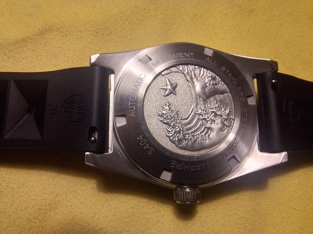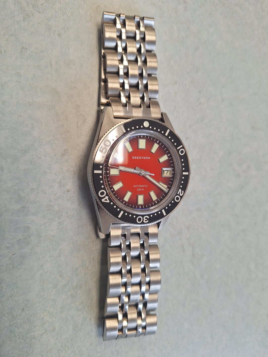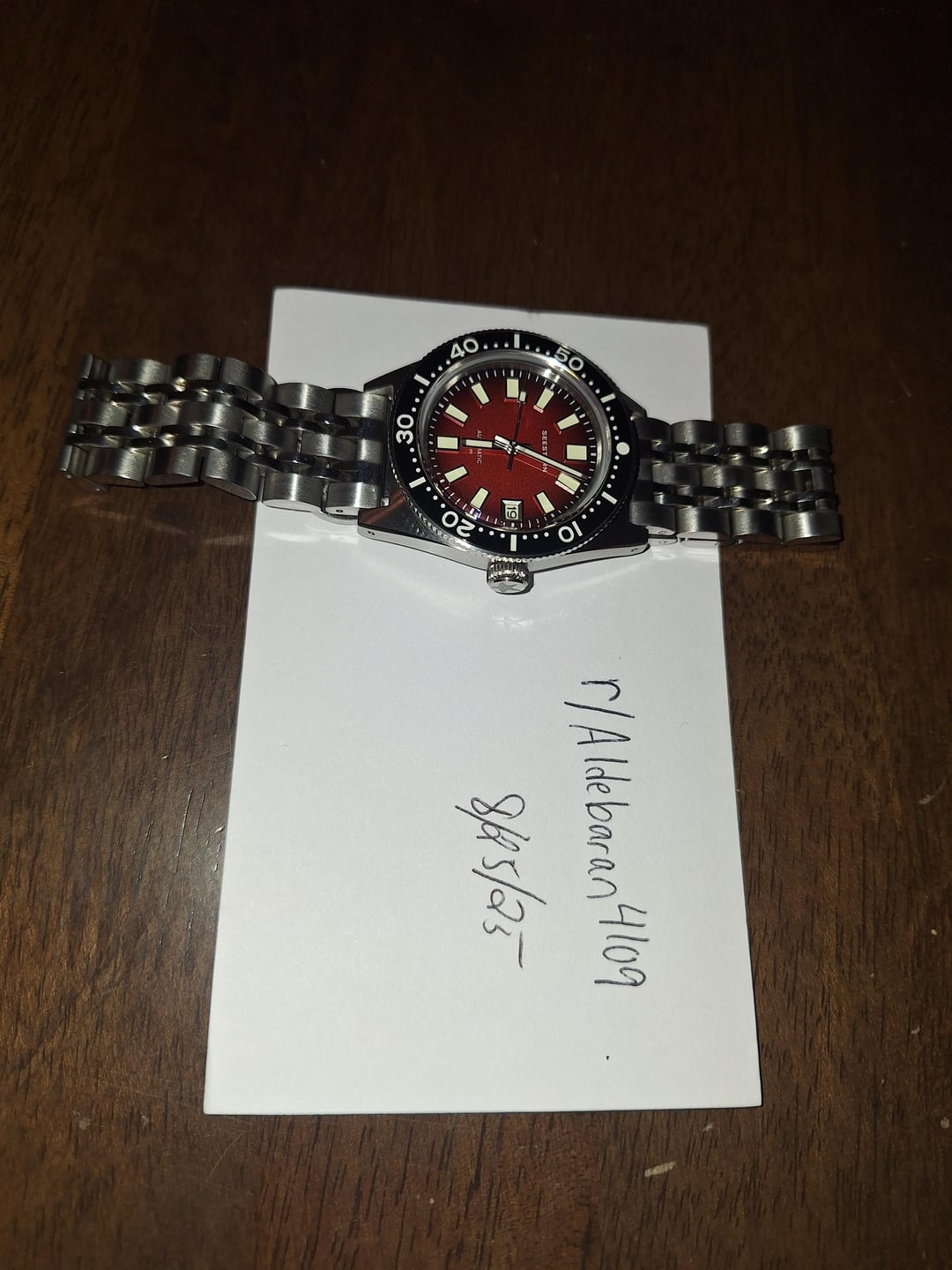 Hi, new to this sub and looking to make my first listing. Price: $129 OBO This is an exceptionally well finished homage to the 62MAS. This watch has brushed and polished surfaces, ceramic lumed bezel, sapphire, great lume including a lumed date wheel and a lovely embossed case back featuring the Seestern wave and starfish logo. The crown is signed and screwed down. It has a period correct compact size with a beautiful red fumé dial and applied indices. It comes with 3 strap options: 1) a Watchdives FKM black rubber strap, 2) a brushed and polished stainless steel bracelet, and 3) brown genuine leather strap with a deployant clasp. The steel buckle on the rubber strap is brushed and signed Seestern. The bezel insert is ceramic has a nice action and aligns perfectly. I have worn this watch a few times but it is in generally excellent condition and keeps great time, powered by the reliable Seiko NH35 within. On the timegrapher, it is yielding +2s/day. Water resistance is 200 meters and comes with papers. It is still available new but the prices have gone pretty high now. On the crown side there is a small scuff on the case near the 2 o'clock position, which could probably be buffed out if it matters. Otherwise everything else is like new.