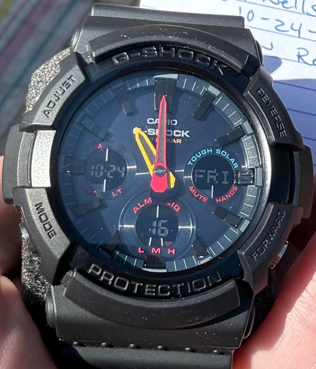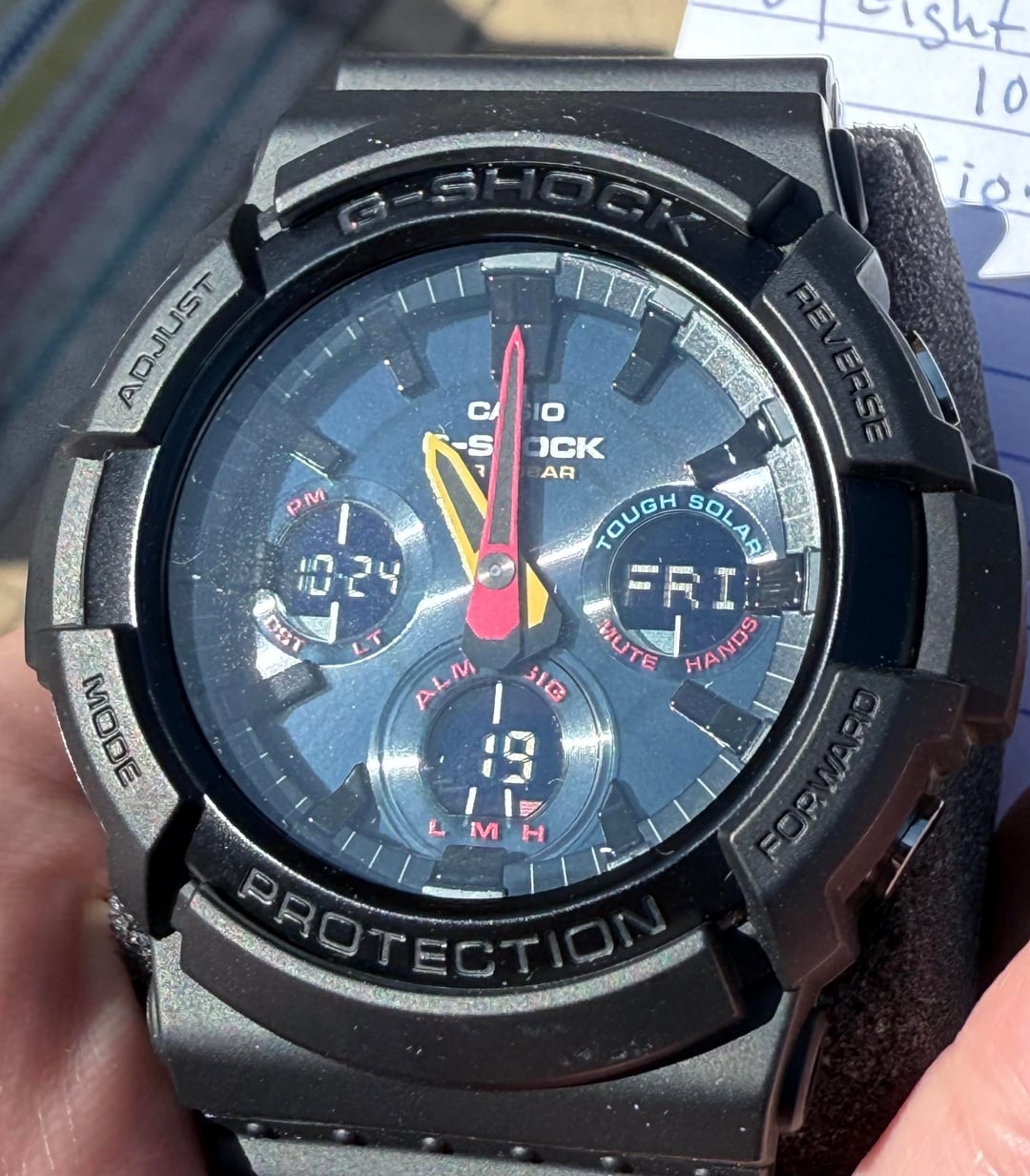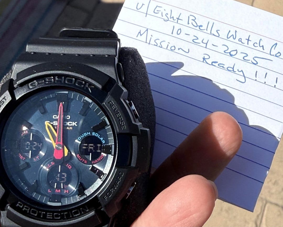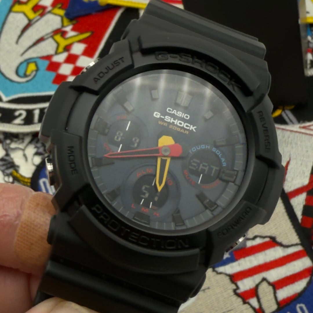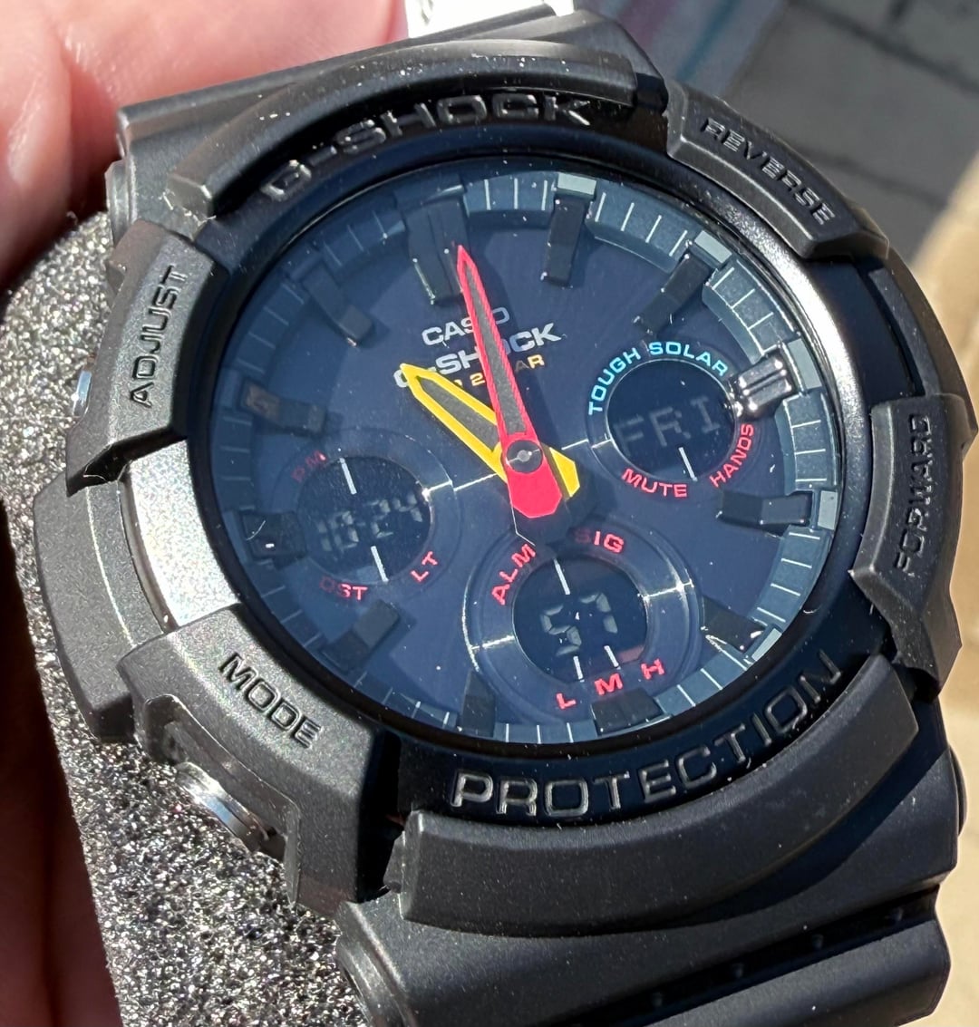 Up for sale is a **Casio G-Shock Black Neon**, a bold and colorful solar-powered analog/digital watch built for durability and everyday wear. This piece is **new old stock** — never worn, no signs of use — and comes complete with the original kit. **Specs:** • Model: Casio G-Shock GAS-100BMC • Movement: Tough Solar (solar-powered quartz) • Functions: World time, stopwatch, countdown timer, alarm, LED light, calendar • Case: Resin/Stainless steel bezel – 52.1mm diameter • Thickness: 16.1mm • Lug-to-Lug: \~55mm • Crystal: Mineral glass • Water Resistance: 200m • Dial: Black with vibrant multi-color accents • Band: Black resin strap with buckle closure • Battery: Solar rechargeable with power reserve indicator Price: $375 shipped. Payment by bank wire, Zelle, or credit card add 4%. So Cal residents add sales tax. No trades at this time. Thanks for looking and supporting a Veteran owned business. Available to show on face time and willing to answer all your questions. Check me out On Insta: [u/eightbellswatchco](/user/eightbellswatchco/) or hit me up on the website [www.eightbellswatchco.com](http://www.eightbellswatchco.com)