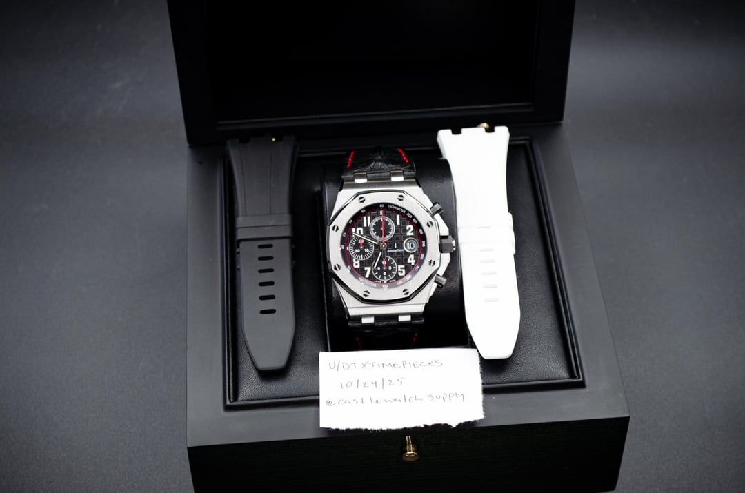 Up for sale is my **Audemars Piguet Royal Oak Offshore Chronograph 26470ST.OO.A101CR.01** (“Vampire”), featuring the striking black Mega Tapisserie dial with red accents. Pictures: [https://www.dropbox.com/scl/fo/p31bnc6ifo6abbp32x1un/ADkHT345UYRcPZidcBuxiA4?rlkey=t4czqwp4tup2wkyuhd628da8q&st=vzma04hw&dl=0](https://www.dropbox.com/scl/fo/p31bnc6ifo6abbp32x1un/ADkHT345UYRcPZidcBuxiA4?rlkey=t4czqwp4tup2wkyuhd628da8q&st=vzma04hw&dl=0) Timestamp: [https://www.dropbox.com/scl/fo/9bycqxe3d3s8fw83jiqty/AAT73Vik9mvRvCMXXlL3pzQ?rlkey=d8k3vfahn5wf26annsyxqj1ne&st=2b9kc54r&dl=0](https://www.dropbox.com/scl/fo/9bycqxe3d3s8fw83jiqty/AAT73Vik9mvRvCMXXlL3pzQ?rlkey=d8k3vfahn5wf26annsyxqj1ne&st=2b9kc54r&dl=0) **Details:** * Full set: inner + outer boxes, manual, warranty booklet (2017) * 42 mm stainless steel case * AP Calibre 3126/3840 automatic chronograph (\~50 hr power reserve) * Black dial with red details & luminous numerals * Comes with 2 extra straps * Condition: 9.9/10 – near mint * Located in Dallas, TX 💰 **Price:** $$21,950 \[shipped CONUS\] 📸 More photos and videos available on Instagram 👉 [u/castlewatchsupply](https://www.reddit.com/user/castlewatchsupply/) As a fellow watch enthusiast, I’m committed to providing a **stress-free, transparent purchase**. I **guarantee authenticity** and stand behind my descriptions. My macro shots are meant to **highlight, not hide, any flaws**. Happy to jump on a call or video chat for serious buyers.