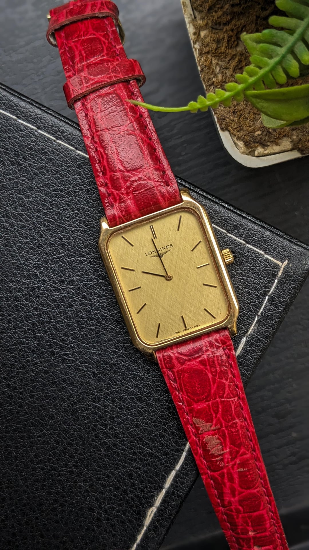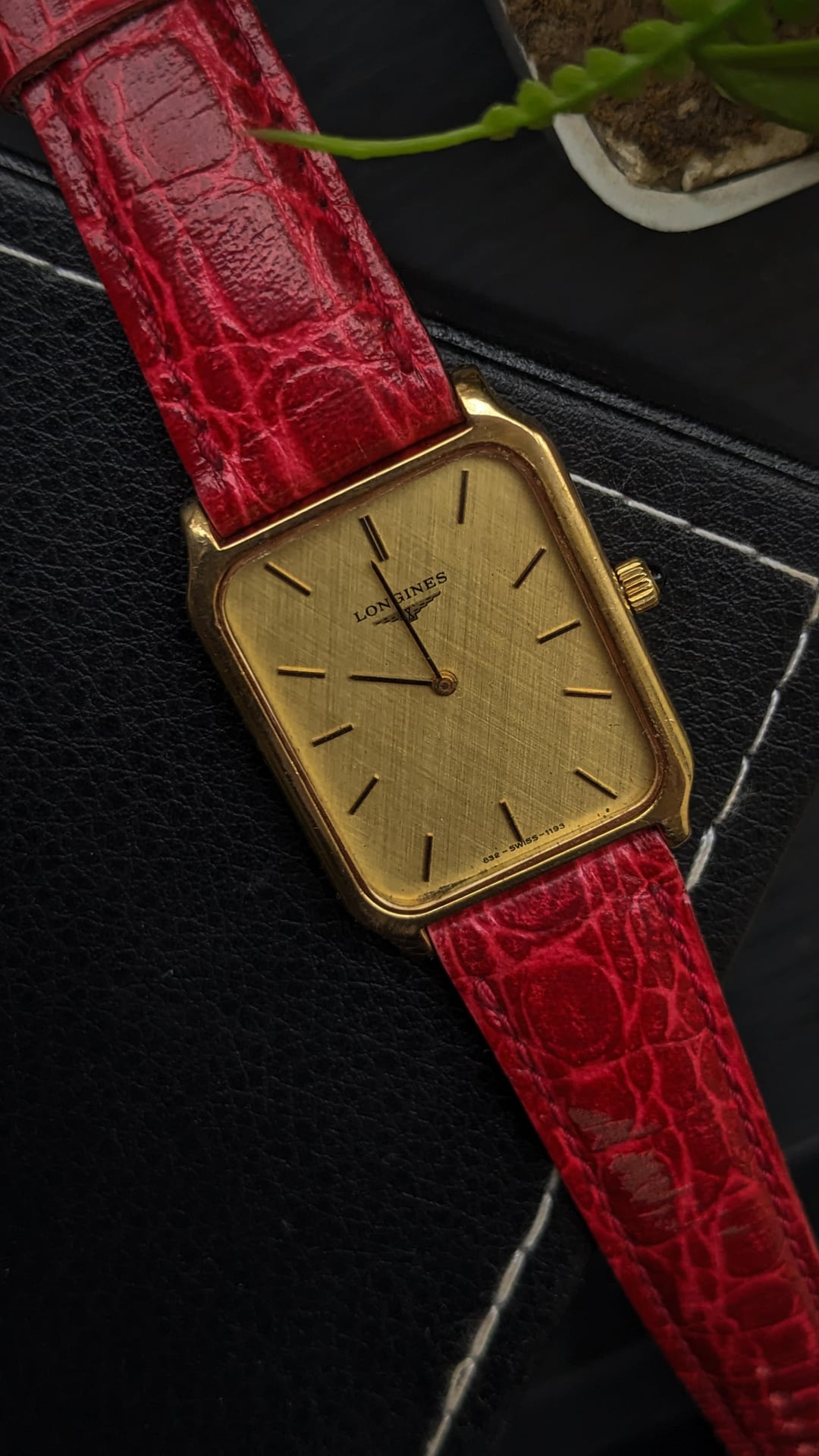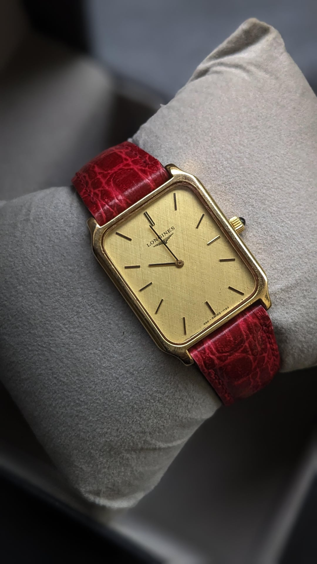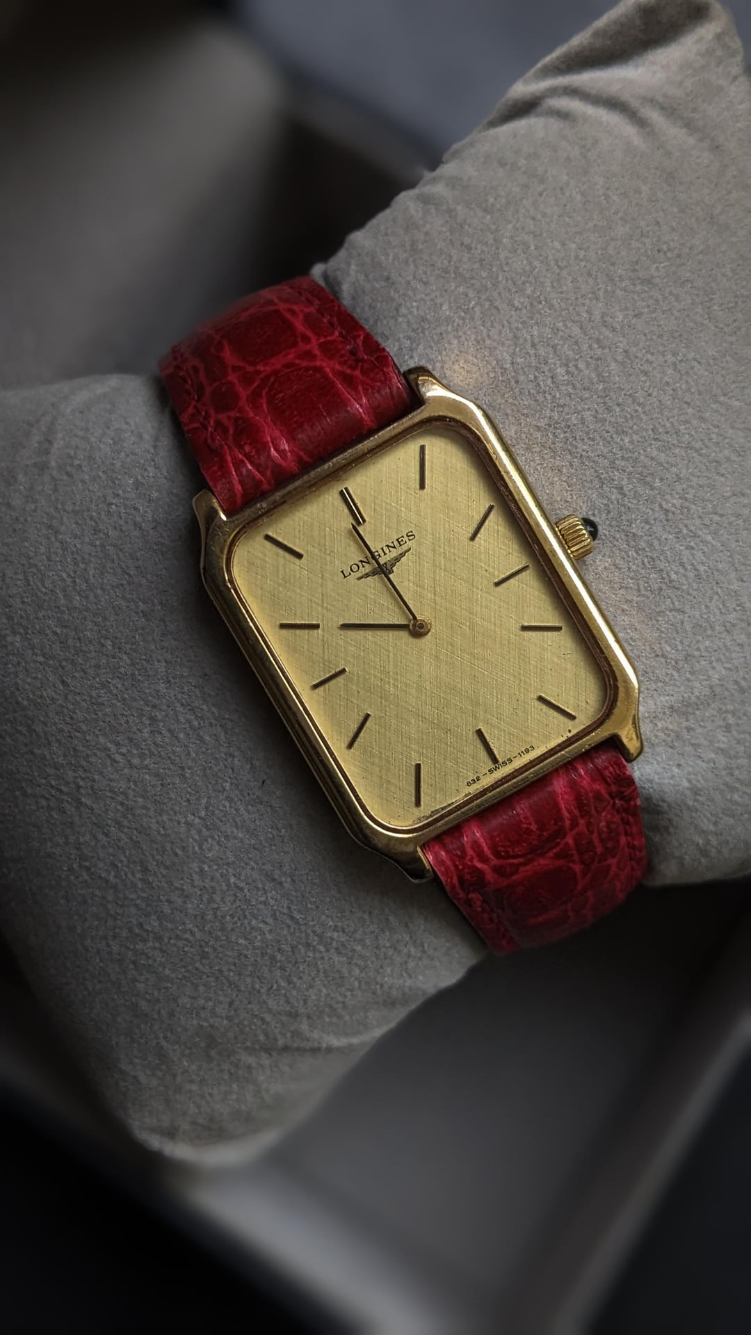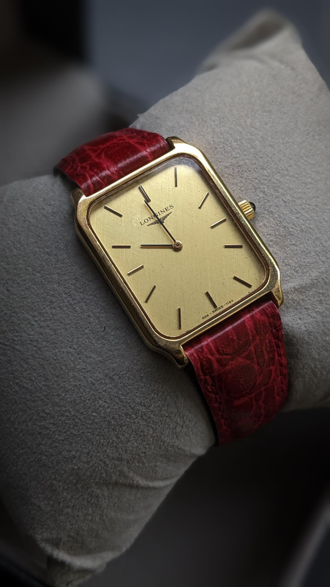 Helloo watchfam , A classic rectangular Longines wristwatch from circa 1987, powered by a reliable Swiss-made manual winding movement and aftermarket strap . Housed in a gold-tone case with a brushed gold dial, this watch features minimal baton indices and elegant stick hands, making it a perfect choice for vintage dress occasions. The case back is stamped with the reference 1193 / 832 and bears the original Longines hallmark. Fitted with a red crocodile-grain leather strap (aftermarket), it exudes vintage charm with contemporary flair. Specifications: Year: ~1987 Movement: Manual Wind Jewels: 17 Case: Gold-tone rectangular Dial: Gold with baton indices Strap: Red leather (aftermarket) Country of Manufacture: Switzerland Price $465 Timestamp: https://imgur.com/a/FR50zZo