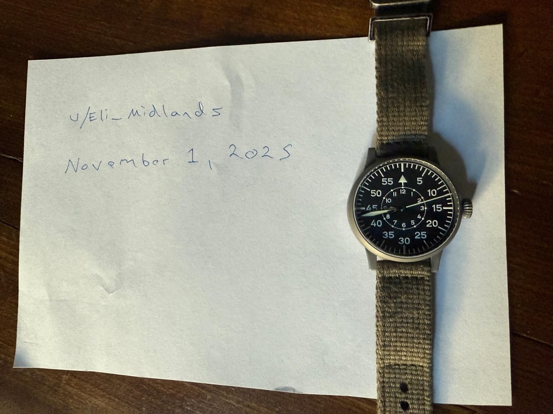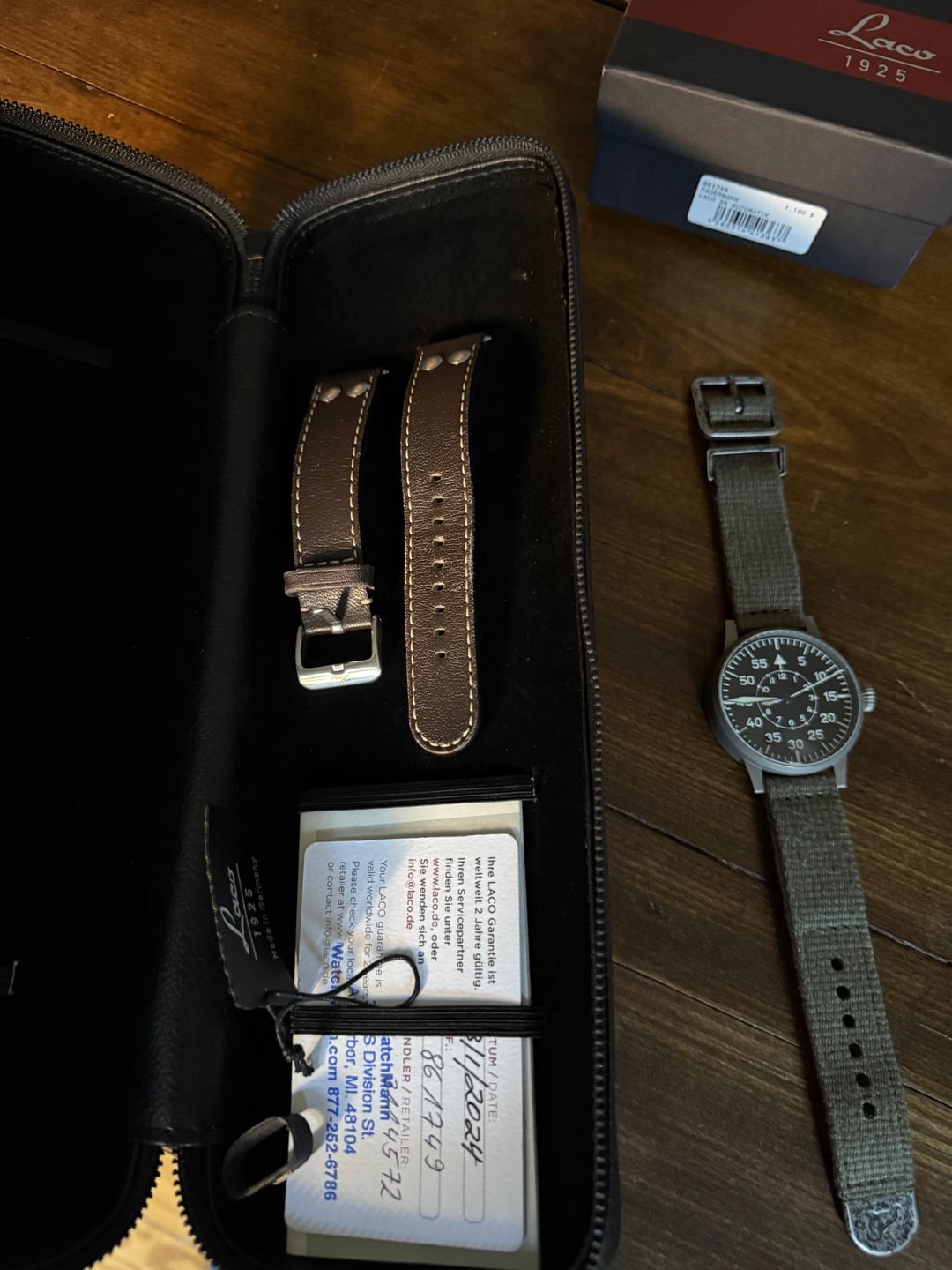 Hi everyone, I am selling this Laco Paderborn, type b flieger, from Laco's higher-end "Original" series. The watch was purchased in March 2024 and I am the second owner. Absolutely superb piece, but a catch-and-release for me as the straight lugs (true to the original design), and general size (while modest for a traditional pilot's watch), doesn't quite work on my quite small wrists (6.25 in). But that's subjective, of course. Basically pristine condition, to my eye. The crystal is clean and the sandblasted steel case is free of dents, dings, or scratches. I don't see any blemishes at all but it has been worn, so let's say minimal light wear. Asking $650 including shipping to CONUS, just trying to recoup what I paid for it. Would also consider trades for this one (open to whatever, but especially other German stuff, maybe also Certina, Mido). The watch will ship on the pictured distressed canvas strap; and the kit also includes, of course, the original leather strap, which feels nice and has been very lightly worn. Warranty good through March 2026.