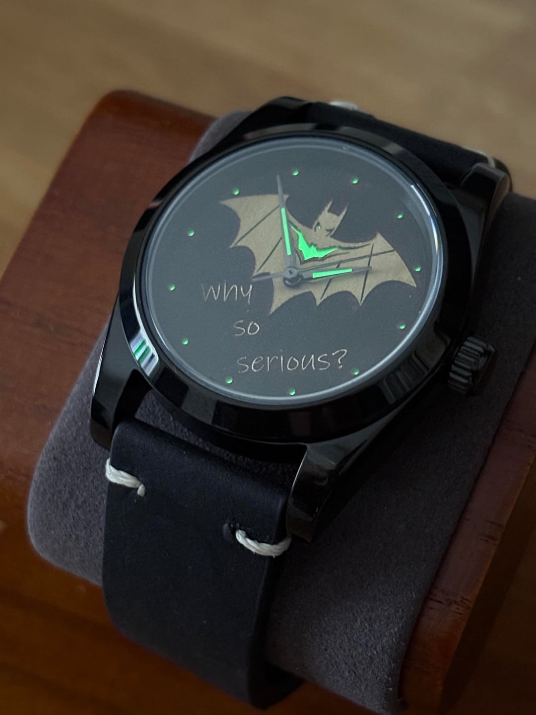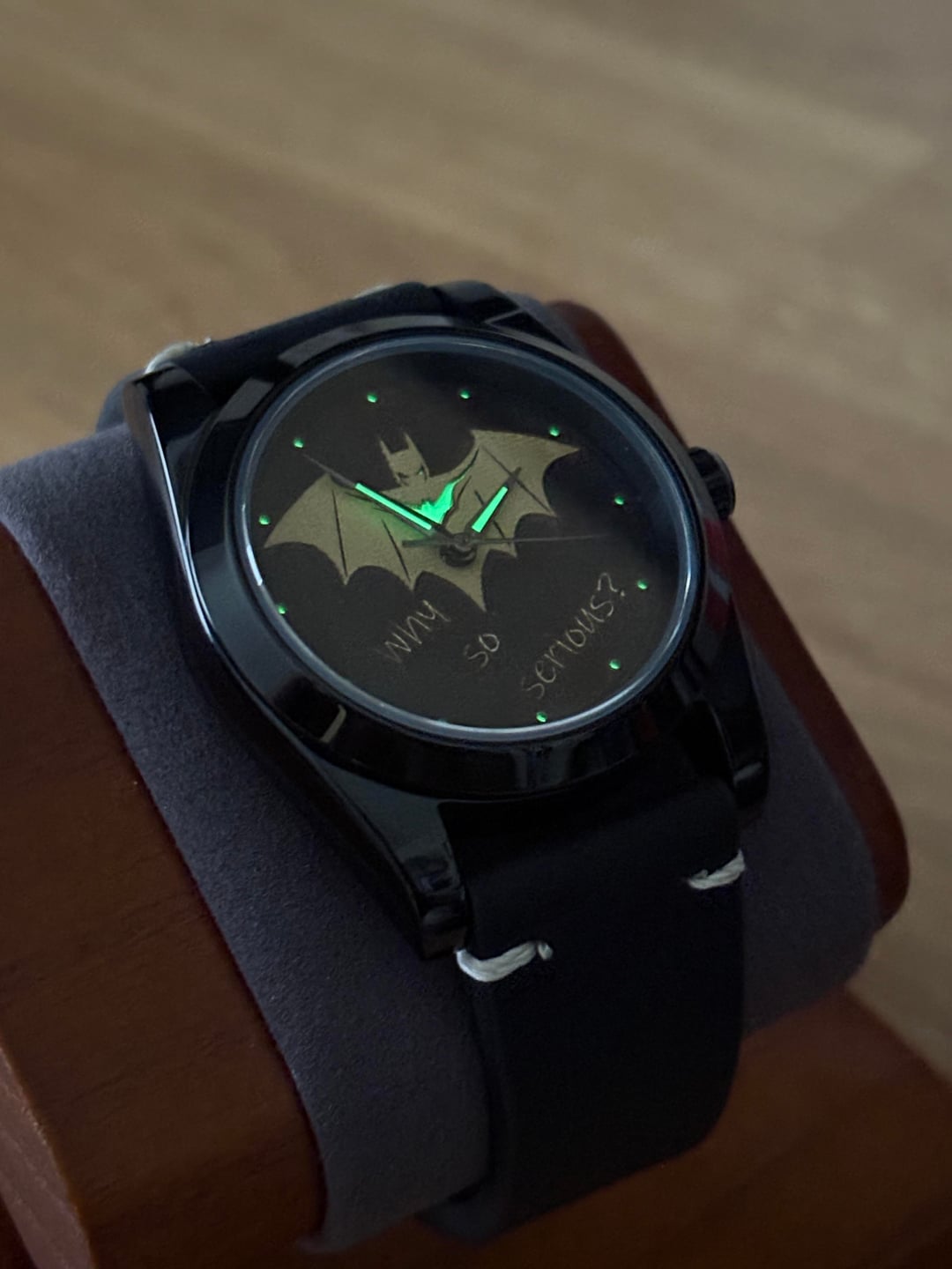 Hi WatchEx, Calling all Batman fans! Today I have for sale is a unique piece, custom made by me. The dial is cut from a sheet of brass and aged, showing the Batman logo with a glow in the dark Batman and glow in the dark eyes (might be hard to see, but yes, the eyes do glow!). The case is a 36mm black PVD coated case with an exhibition caseback. The watch will come in a watch travel pouch. Specs: - Movement: Genuine Seiko Automatic NH38A movement - Glass: Sapphire Glass front and back - Size: 36mm diameter by 12mm thick - Strap: Genuine black leather 20mm - Condition: Brand new - Dial: Custom made from Brass Price: $185 Shipped within Conus Like what you see and the watch sold? Happy to make you another or customize a different piece for you! Feel free to DM me for a commission or follow my page for more examples of my work in Instagram: https://www.instagram.com/avilawatchco?igsh=MXh5OXh2bDFjb3h3NQ%3D%3D&utm_source=qr