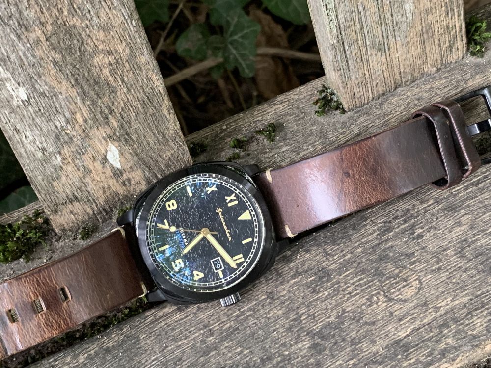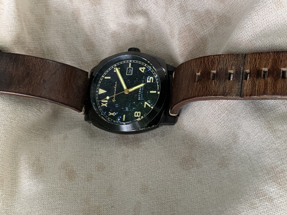 Cadran noir granité avec la date qui à le bon gout d'être de la même couleur