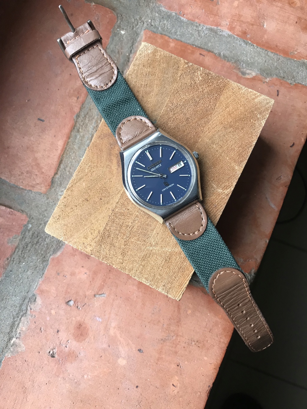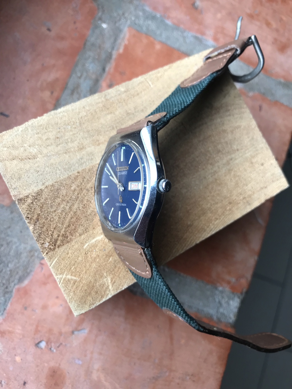 Bonjour ! Voici une montre Citizen Quartz, achetée en pensant qu'il s'agissait d'une HAQ (High accuracy quartz), mais en fait il s'agit d'une quartz de qualité pas d'une HAQ. Montre vintage année '80, diamètre 35mm, fonctionne parfaitement. Prix demandé : 90.€ + fdp Merci pour votre attention,