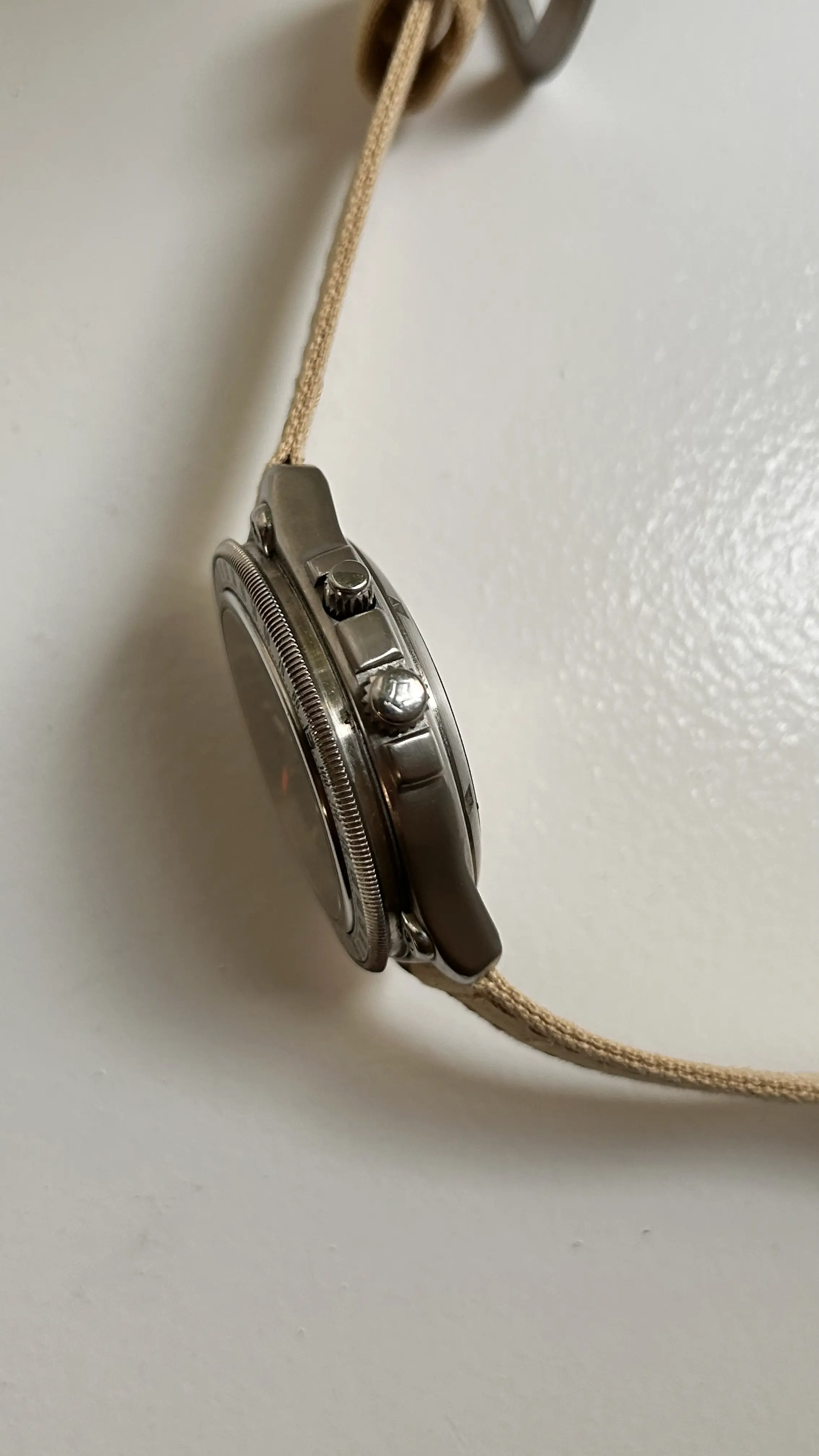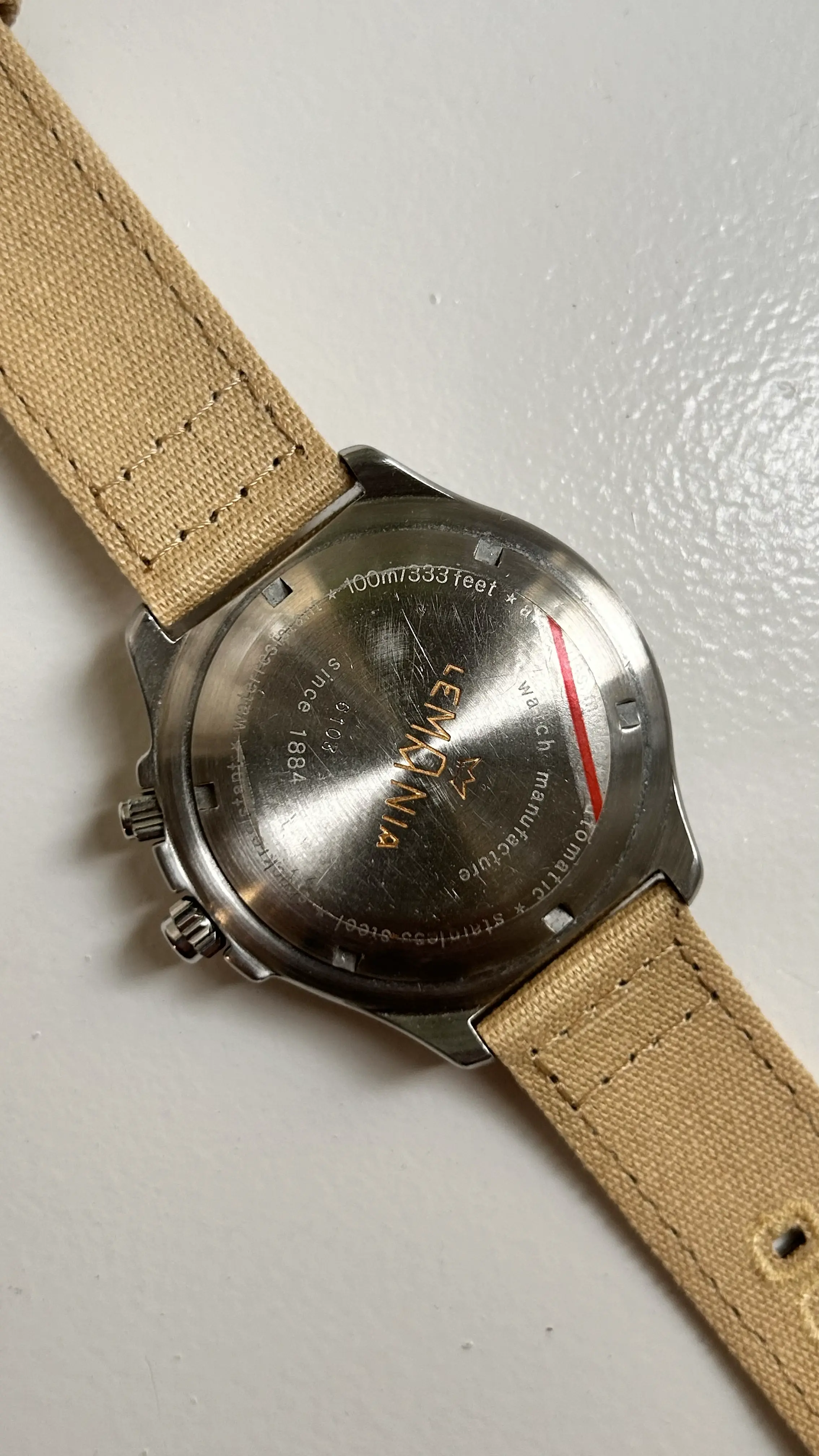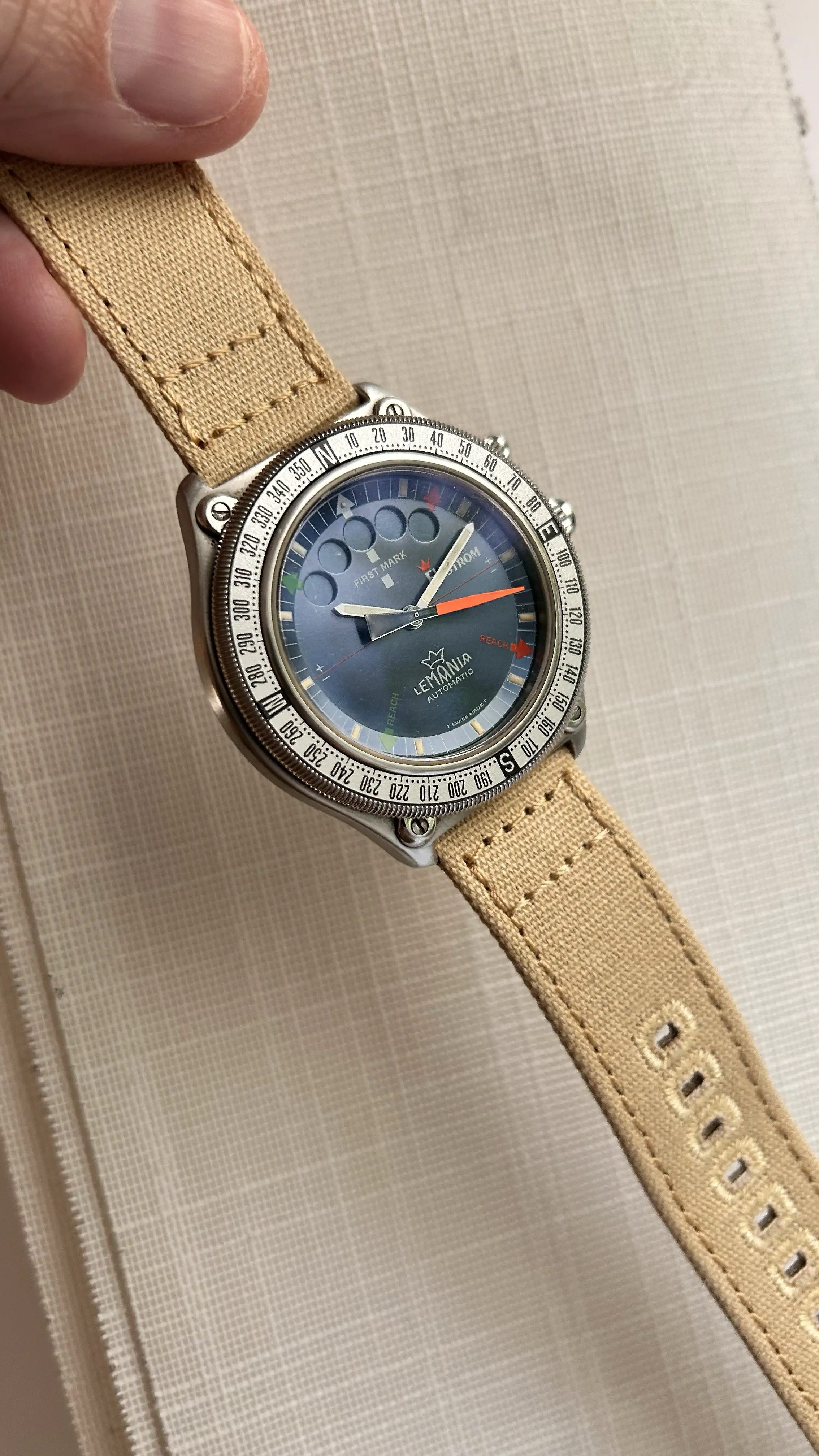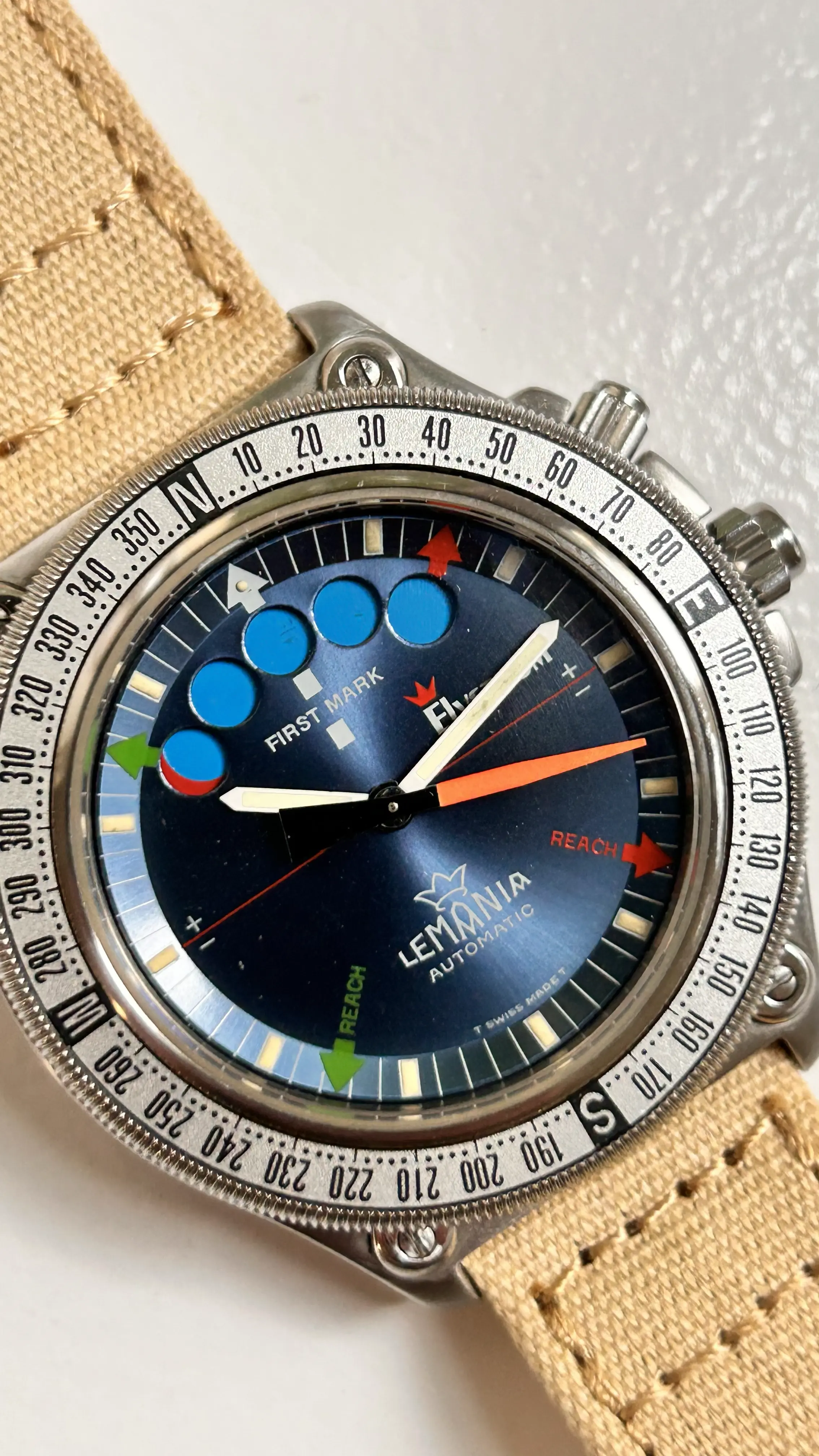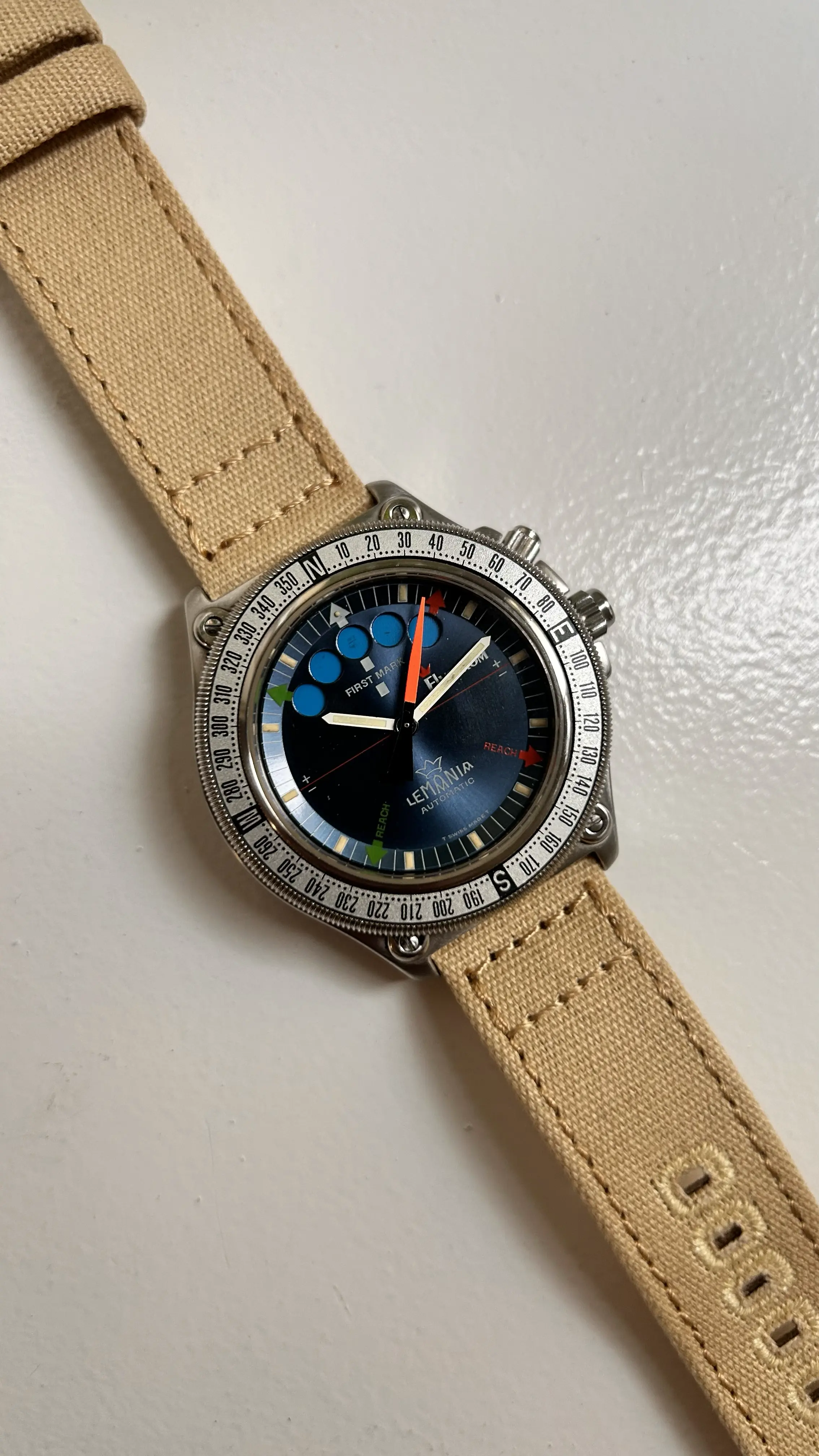 For sale is my stainless steel Lemania Elvström Regatta Timer with blue dial on a Canvas-strap.