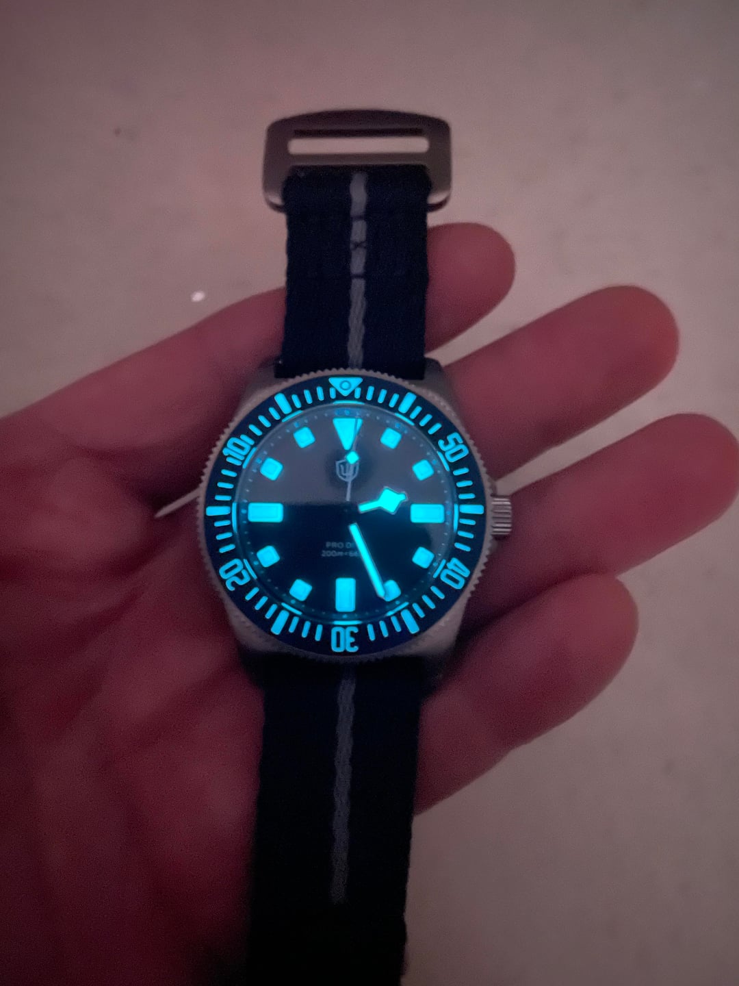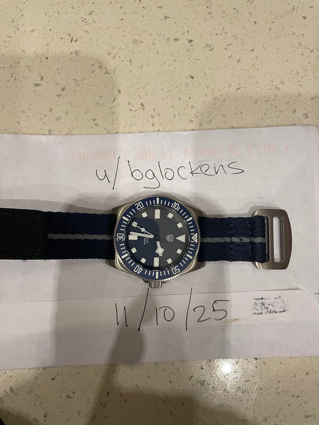 Selling this lume MONSTER; truly amazed at how long this stays lite and how bright it gets. Worn only for a few times; but I’m not wearing it as much as I thought I would when buying it. 38mm grade 2 titanium case with a vh31 powering it. According to watchdives it uses Swiss grade bgw9 and I believe it; strongest lume of any watch I’ve ever owned. Comes with everything that came with purchase plus a brand new never worn MN strap that is matching; blue with white stripe. Asking $125 shipped conus. Zelle; ppff; ppgs + fees.