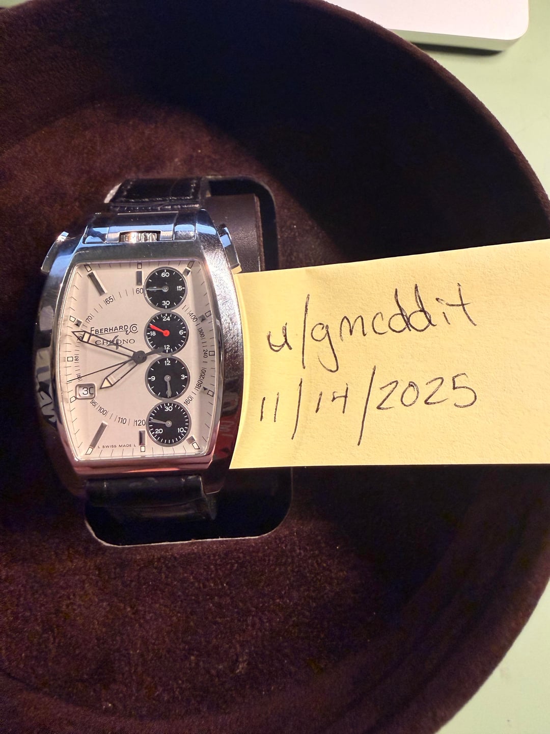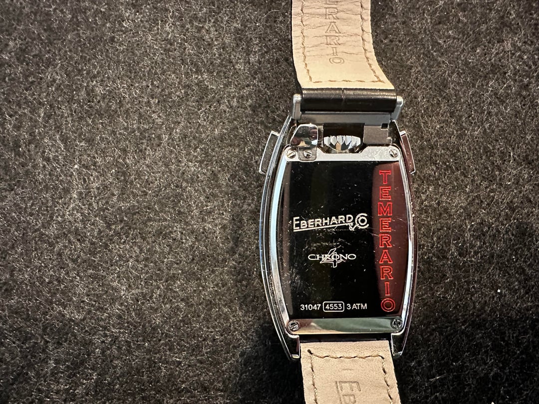Eberhard Chrono 4 Temerario 31047/8 — automatic vertical-counter chronograph, steel case Up for sale is my Eberhard Chrono 4 Temerario (ref. 31047/8). I’m letting it go because I’m refining my collection and this one deserves someone who will wear and appreciate it. What you’re looking at: • The patented vertical-sub-dial layout: small seconds, 24h, hour, minute aligned in a row — an uncommon design even in the chronograph world. • Steel tonneau-shaped case that sits nicely on the wrist (the arching case-back helps). • Automatic movement with chronograph function; a distinct alternative to more mainstream designs. Condition & extras: • Worn once by me, great condition, minor scuff on caseback • dial/hands in perfect condition • OEM black leather strap with buckle, not clasp • No service history • Comes with box, papers, and case Specs at a glance: • Width: approx. 37 mm; length: approx. 55 mm (lug-to-lug) • Steel case, tonneau profile • Date display at ~8 o’clock (per variant) • Water resistance: 30 m Location: Shipping to US only. Why consider this? If you’re looking for something a bit off-beat and special — rather than another “same layout” chronograph — this offers something different. Unique look, mechanical chops, decent value relative to what you pay for big-name brands. Why I’m letting it go: I’m consolidating and moving some pieces out to make room. This one hasn’t gotten the wrist time it deserves. Happy to provide more photos or video of the movement, running and chrono-function. Feel free to DM if you want measurements or more details.