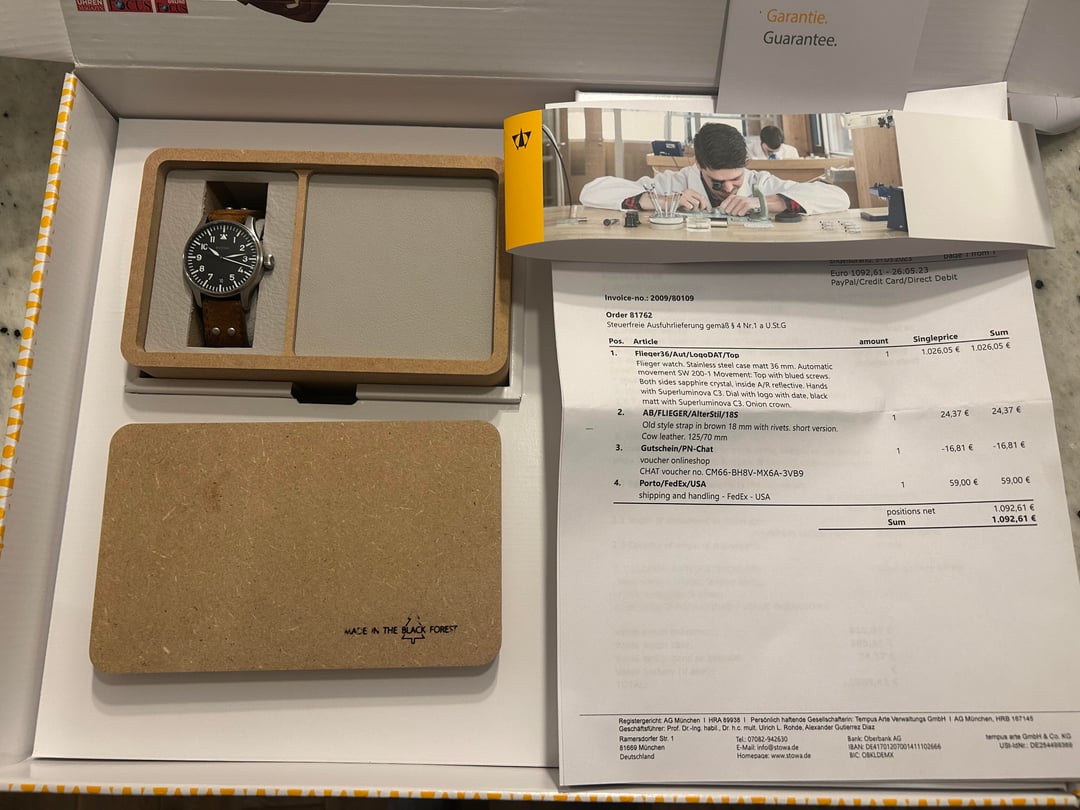 I am reluctantly putting up my Stowa Flieger 36 up for sale. This is the version with logo and date. The movement is SW200. I bought this from Stowa in May 2023. I have the original packaging and receipt. The watch is in great shape, back of the lugs have scratches from strap changes. I did end up having to send this watch back to Stowa for repair under warranty as a result of watch not running and a rotor issue. It has been a year since the last repair and there have been no issues and watch is running great. The strap size is small. In the sale I am also including a Veblenist leather strap size 105/60. I am pricing the watch and the strap at $800. Payment via Zelle or PayPal. Shipping is on me. I’m a first time seller here, but I have sold plenty of watchuseek.com under username Velez84. Please let me know if you have any questions.
