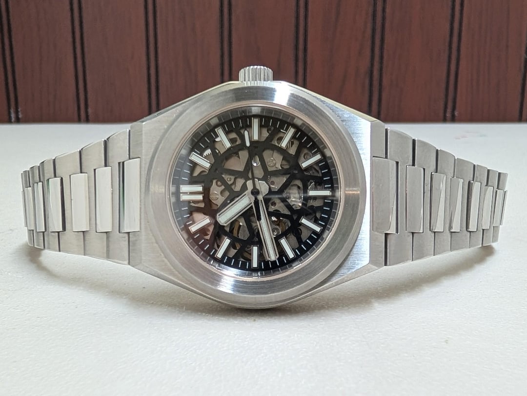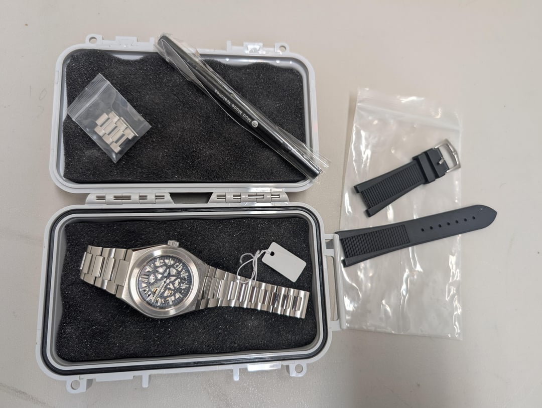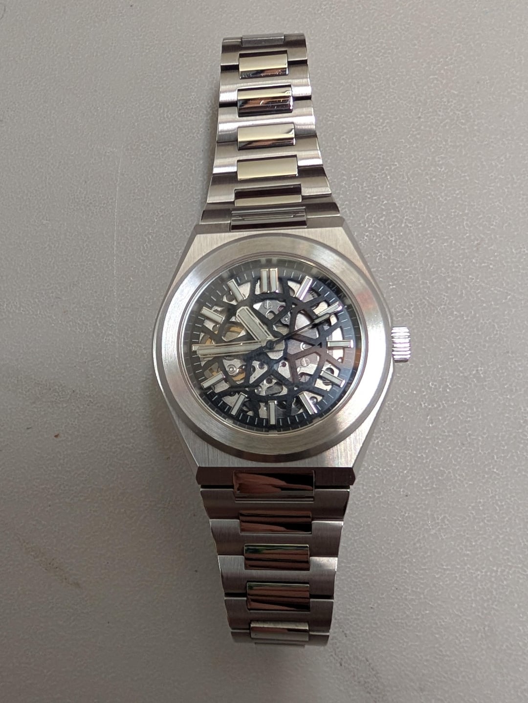 $200 net to me via PayPal, Venmo or Zelle, I'll pay for conus shipping. No trades please. Sleek looking integrated bracelet watch customized with skeletonized dial and movement! Using Zelos Hammerhead handset, so you know the lume is good. Also includes integrated vulcanized rubber strap, unused. Versatile and beautiful, this I've can be dressed up or down. I'm the original owner, only worn maybe 5 times. You'll get the full kit, everything it originally came with, case, all bracelet links, vulcanized rubber strap And strap tool. Everything is working as it should, no issues. Specs: 39.5mm Case Diameter 45mm Lug to Lug Diameter 11mm Thickness Sapphire Crystal Individually-Numbered Screw-down Sapphire Case Back Screw-down signed crown NH70 skeletonized Movement from Seiko - with hacking and winding Brushed Stainless Steel Bracelet with Polished Mid-Links Fitted Vulcanised Rubber Strap Water Resistant to 100m