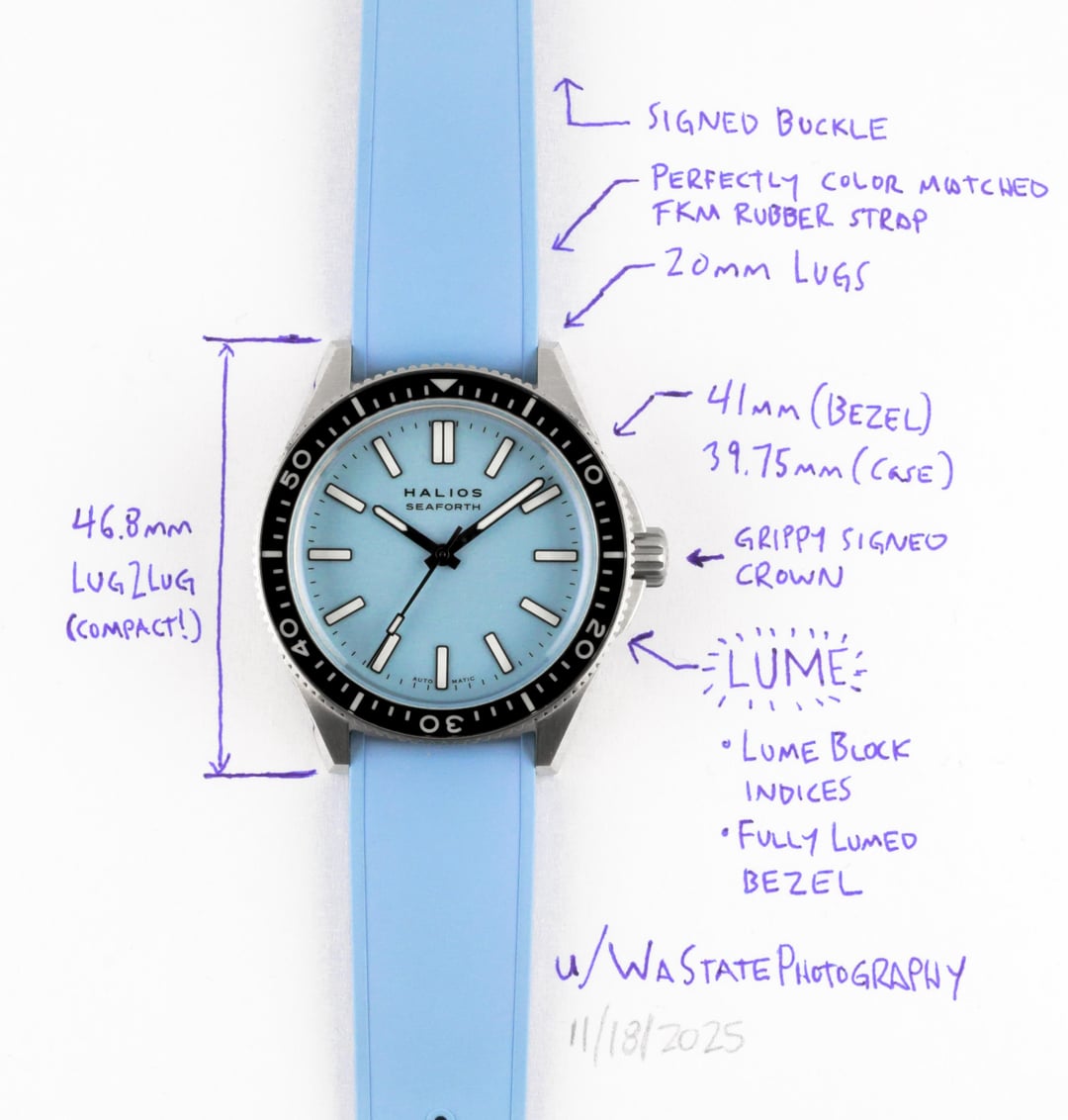 Up for sale is the latest version of the notoriously hard to obtain Halios Seaforth IV. A super well respected microbrand, Halios has remained a one-man shop and kept production small, selling in limited batches that has unfortunately frustrated would-be buyers. This is a very impressive watch in the metal. I’m a huge fan of the dial design and case. The dial layout is amazingly clean and harmonious with the hands matching the indices, and for once the bezel font matches the dial (huge pet peeve of mine). Halios also uses lume block indices, but they aren’t as loud or in your face as say the Trident Lumiere. They have a rounded quality and are framed by a slim black outline that makes them look more natural and less plasticky/blocky. I love this detail. The case, while being 41, has a relatively short lug to lug of 46.5mm and I wore it on my 6.5” wrist with no overhang. And sits nice and flat on the wrist. Honestly, it’s just a great watch. Passing it on because I’d like to try a smaller 37/38mm skindiver. Condition: Like new with no visible marks, scratches, or snake bites. Holds up very well in studio lighting. Polished chamfers still look clean. Includes the travel case that was shipped with the watch. Oddly no papers were included in the purchase, but what you get here is everything you’d get buying it new except for the stickers. Please ping me with questions! Happy to arrange a Facetime to show the watch off live. Asking $900 shipped CONUS, and for just a hair more if shipped internationally. I'm asking for less than the cost of the watch new plus shipping, tariffs, and our favorite – the DHL tariff related “processing” fees. Payment: Paypal F&F, Zelle, or Venmo Additional feedback available on Facebook Marketplace, Ebay, MODA, and Fred Miranda (think watchexchange but for cameras) **CASE MATERIAL:** Stainless steel **STRAP:** OEM Color matched FKM rubber strap. Major improvement to the previous version straps. **FINISH:** Brushed with polished lug chamfer **DIAMETER:** 41mm bezel, 40mm case **WATER RESISTANCE:** 20 ATM **LUG-TO-LUG:** 46.5mm (I measured 46.8) **LUG WIDTH:** 20mm **THICKNESS:** 12.4mm (including crystal) **ROTATING BEZEL:** 120 stops, unidirectional **CALIBRE:** SW200-1 **POWER RESERVE:** 40 hours **CRYSTAL:** Sapphire, double-domed with anti-reflective coating