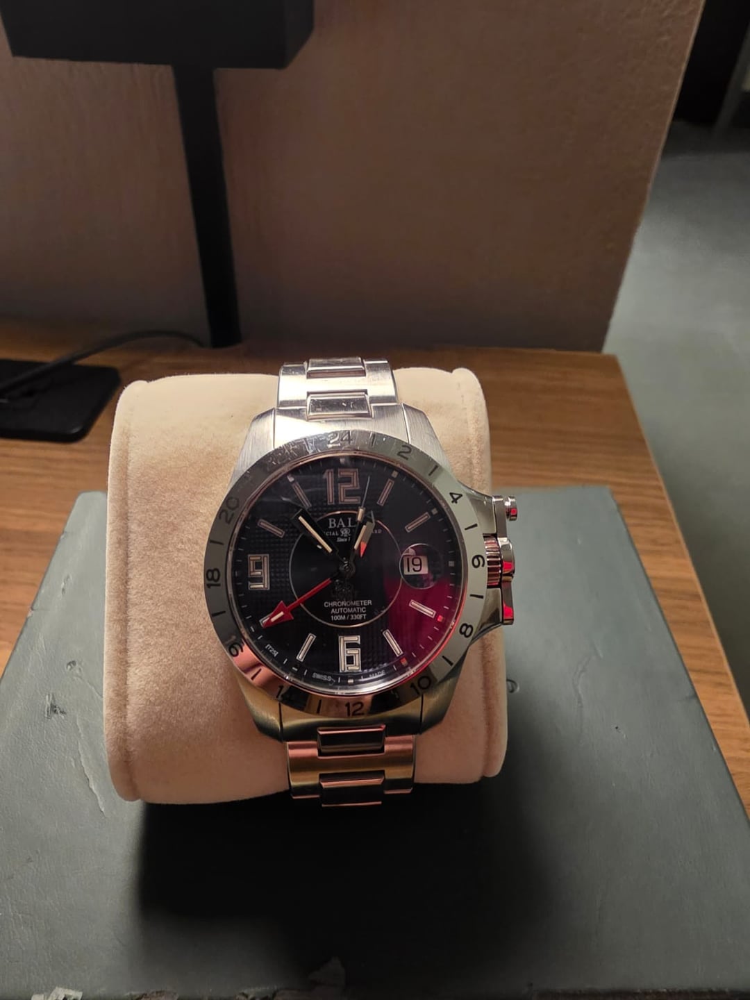 **Timestamp:** [*https://imgur.com/a/9m5pr0G*](https://imgur.com/a/9m5pr0G) **Photos:** [https://imgur.com/a/6UCQ8w0](https://imgur.com/a/6UCQ8w0) # Price: $1,100 shipped CONUS # Model: **Ball Engineer Master II GMT** Ref. **GM2098C** Swiss Made / Chronometer Rated / 100m WR # Condition: Overall in **great used condition**. Normal wear on the bracelet and case consistent with careful use (see macro shots). Crystal is clean. Bezel has light signs of wear. The watch runs well and the GMT hand works perfectly. Classic **Ball tritium tube lume** — excellent low-light visibility. # What’s Included: * Watch on **full stainless steel bracelet** * **Original Ball presentation box** (rough shape, worn edges) * **No papers/manuals** # Specs: * 40–41mm case * Automatic movement (chronometer) * GMT 24-hour hand * Sapphire crystal * 100m water resistance * Screw-down crown # Terms: * **Shipping:** USPS Priority or UPS Ground, * **Payment:** Zelle preferred; PayPal F&F * **No trades** at the moment