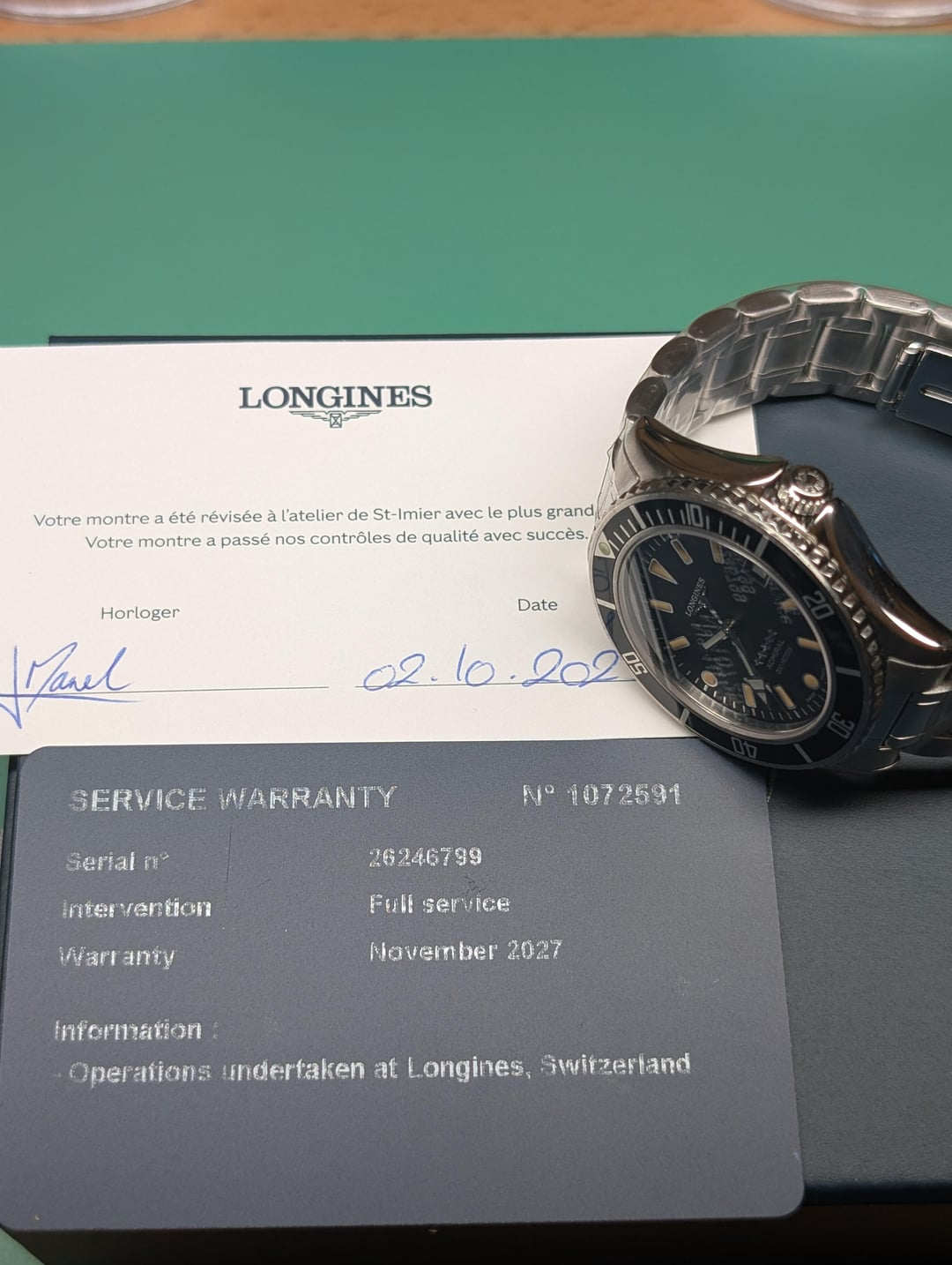For sale today is my Longines Admiral Diver. This is a neo vintage Longines diver that often gets overlooked. The case is very smooth and comfortable at a moderate size of 38mm. The dial is very legible and the unique handset and circular markers at 6 and 9 gives it a lot of character. Cosmetically, the watch is in excellent condition. It just returned from a complete overhaul from Longines Switzerland and the case is in like new condition. The watch is in excellent mechanical condition as well. The factory service warranty is valid until November of 2027 in case any issues arise. I'm asking $1299 shipped CONUS for this piece. International shipping at buyer's expense. PayPal G&S is available at my discretion. Thanks for reading!
