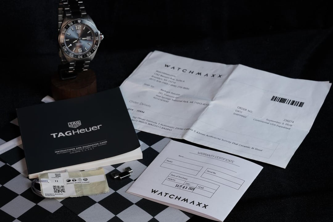 T**AG Heuer Formula 1 Calibre 5 Grey Sunburst Dial Two-tone Steel Bracelet AZ2011.BA0843** Perfect daily wear watch. It looks great with a casual outfit, out on the golf course, at Cars and Coffee or out on the town. The Formula one has a 43 mm fine-brushed and polished case, gray dial rotating ceramic bezel and a Caliber 5 automatic movement. The bracelet has fine brushed, polished stele and ceramic components with a folding push button clasp. Watch ships with original double box and WatchMaxx papers. $1930 USD or best offer. Fully insured shipping to all US states. ChasinTime is still growing, and our goal is to sell only high quality luxury watches to satisfied buyers. You can buy with confidence. Timestamp: [https://www.dropbox.com/scl/fi/pfxeqli6zcma6xgmq7ath/2025-11-17-19.20.48.jpg?rlkey=1q19z1t7r24cytbs5h14fytxc&dl=0](https://www.dropbox.com/scl/fi/pfxeqli6zcma6xgmq7ath/2025-11-17-19.20.48.jpg?rlkey=1q19z1t7r24cytbs5h14fytxc&dl=0)