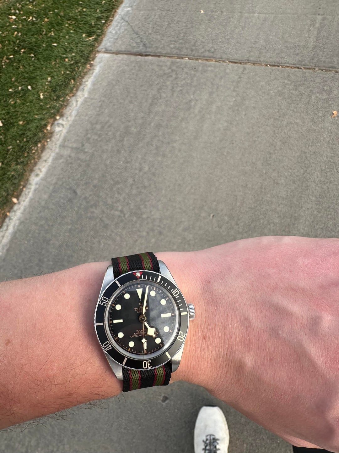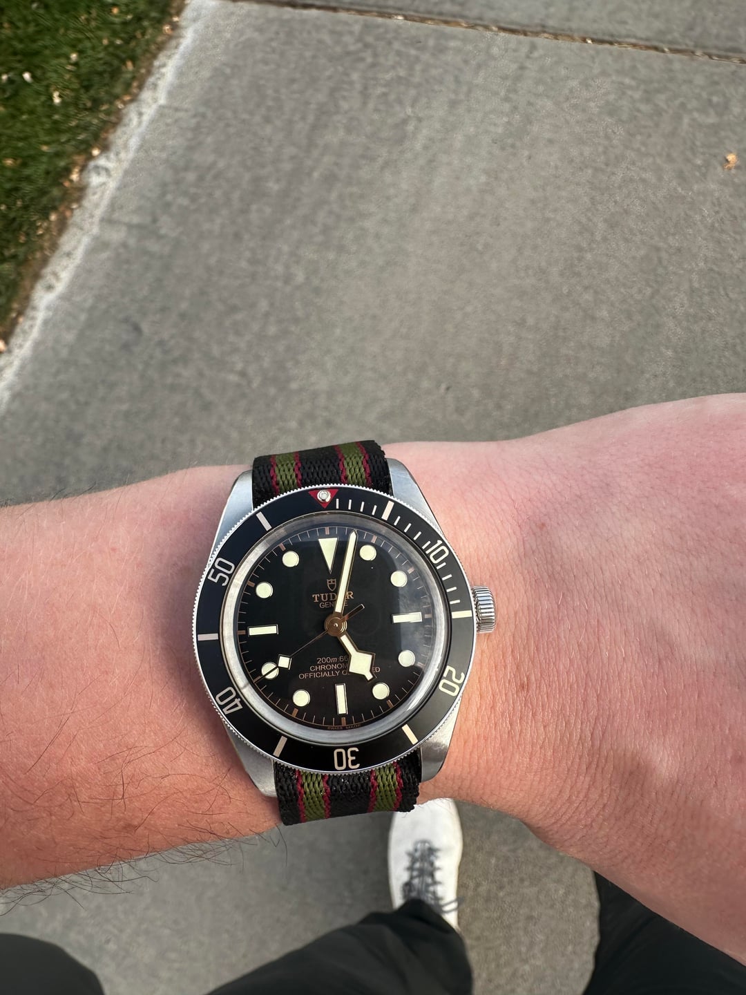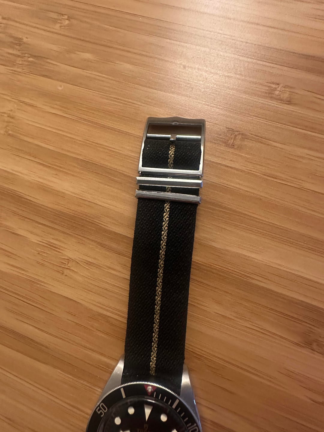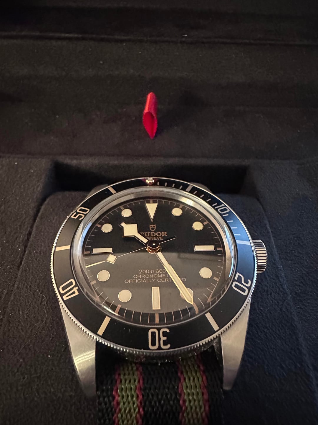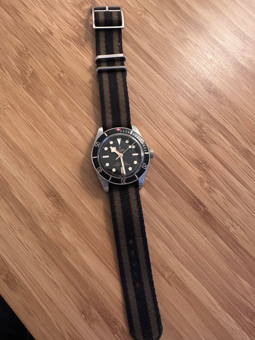 Selling my Tudor BB58. Has a very small ding on the bezel and otherwise normal signs of wear. Currently keeping it on a crown and buckle Bond NATO that even James would be proud of. In total comes with the OEM NATO (which is well worn), a bond nato from crown and buckle, a green nato from crown and buckle, and a vanguard rubber strap. Have the box but no papers. Asking for 2900