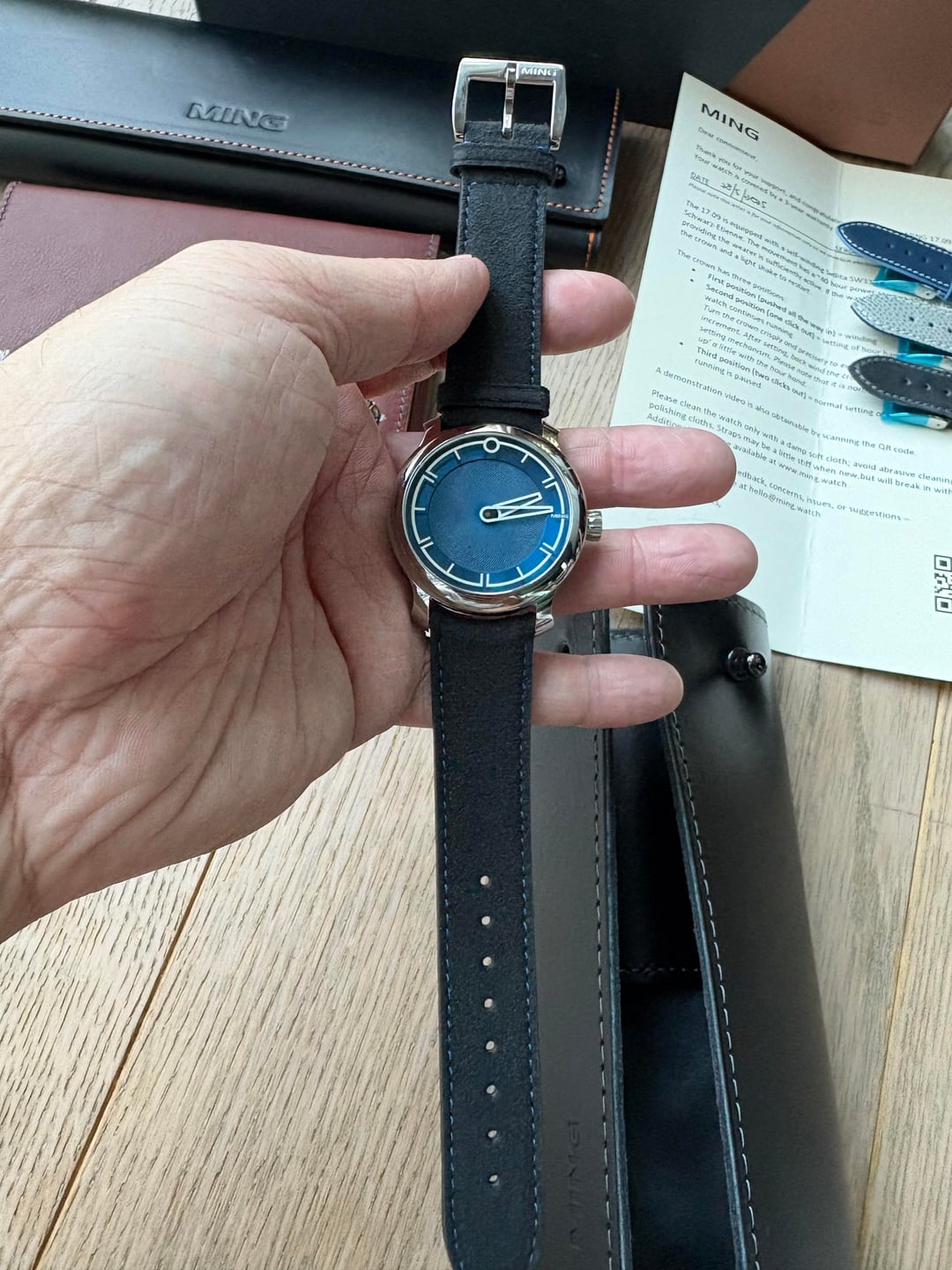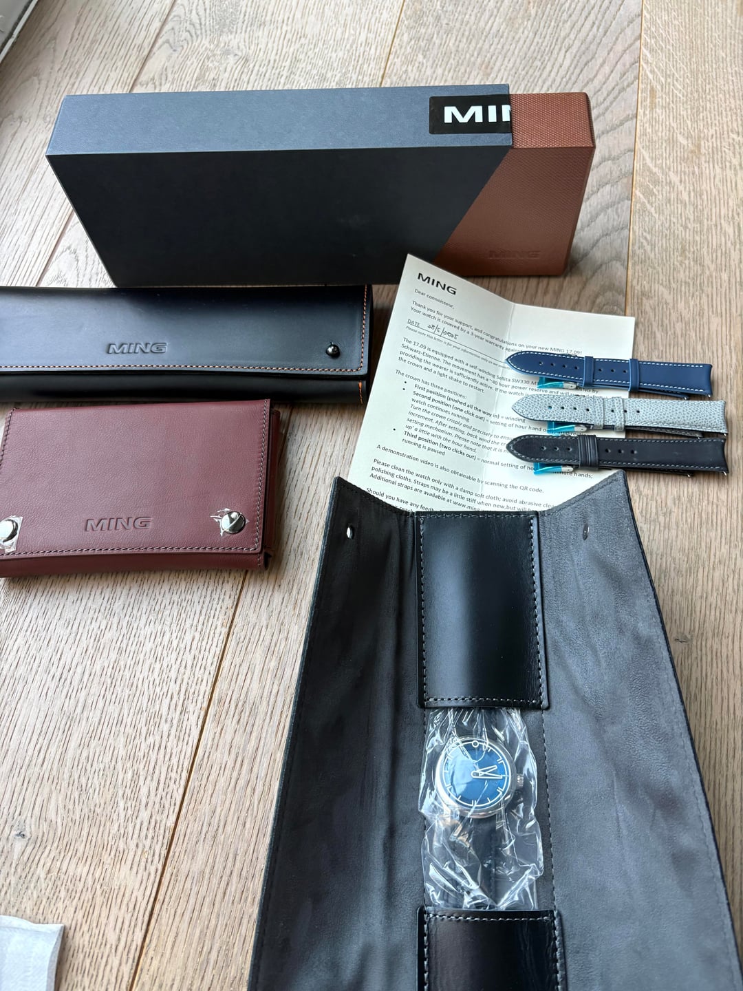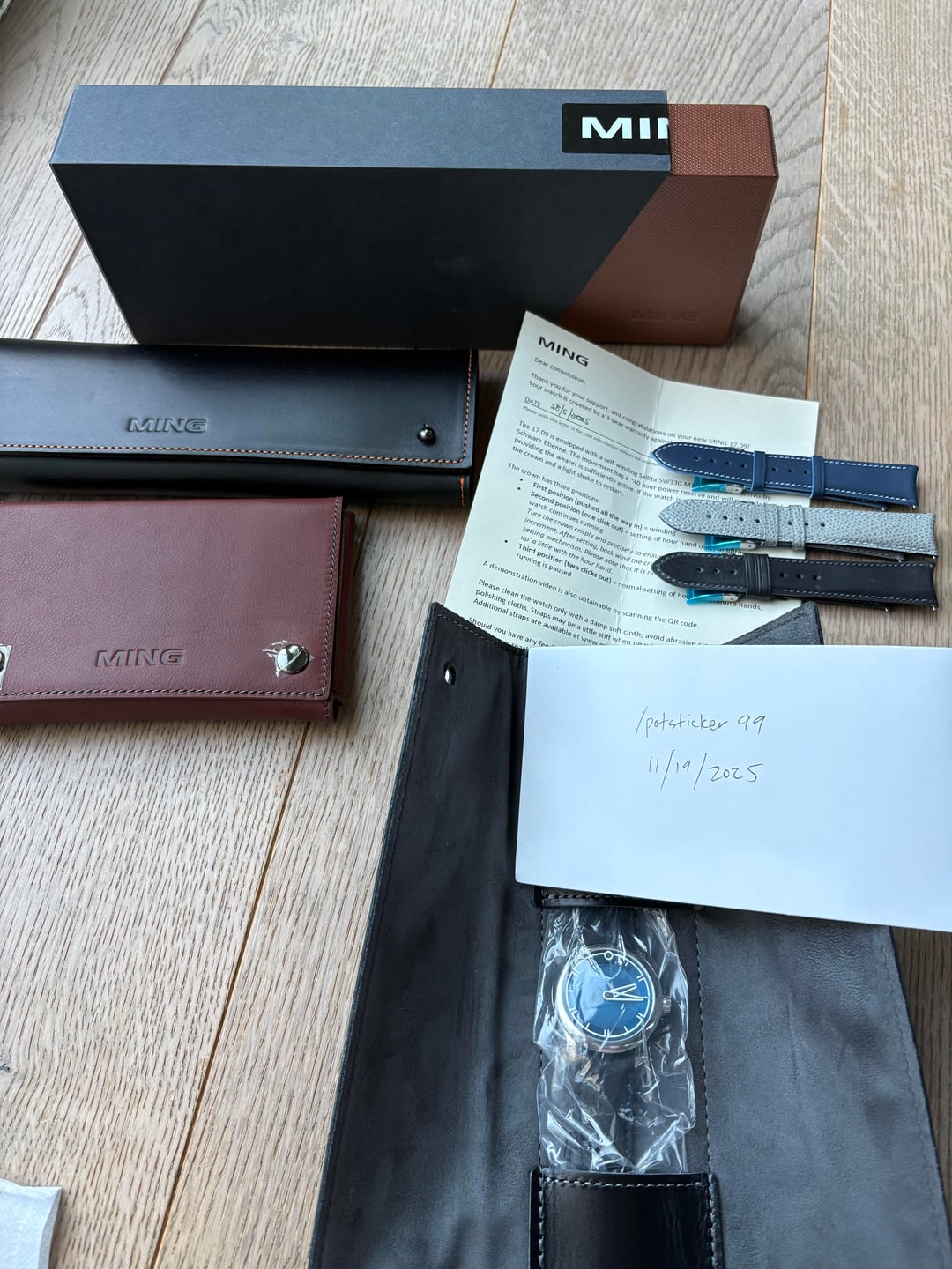 Up for sale is a brand new never worn Ming 17.09 Blue. Size: 38mm Location: U.S. / California Condition: Brand new and contains all original packaging. I'm the original owner but never wore it. Includes multiple straps and leather accessories (from Ming) in addition to the watch. Price: $2,375 including shipping in the USA. Zelle or Paypal (friends/family) payment accepted. No trades.