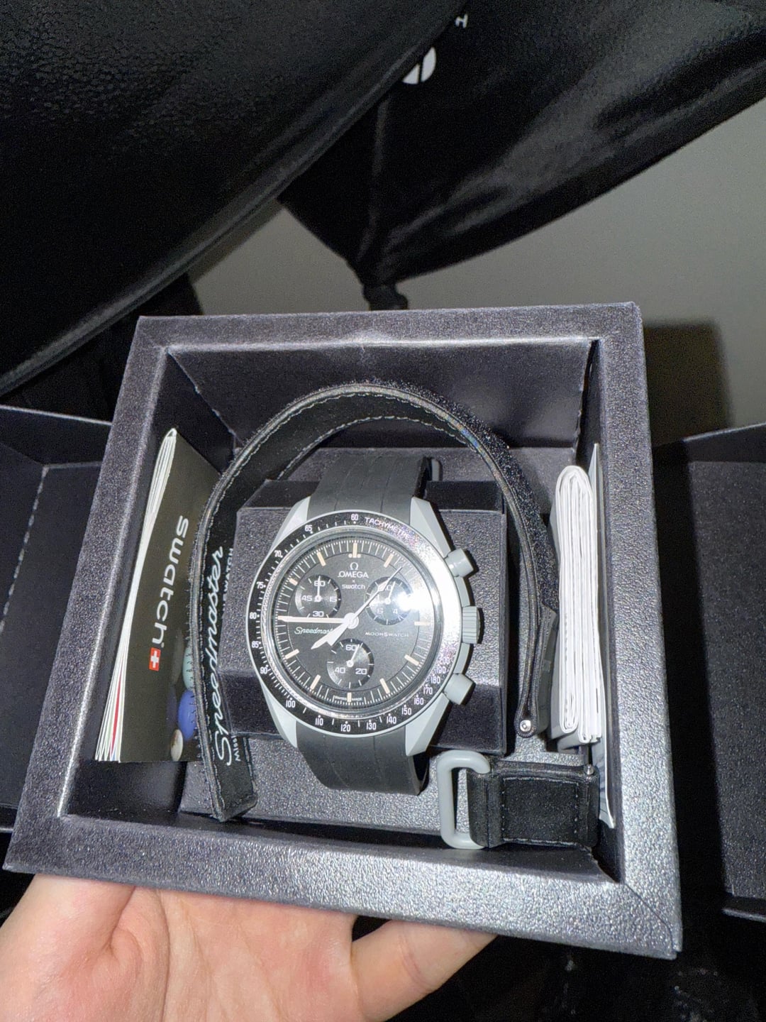 Selling this Moon Swatch $240 shipped US only. The watch has a rubber aftermarket strap which is much better than original, original and everything else is included as well Timestamp https://imgur.com/a/Y9Ahe7Q