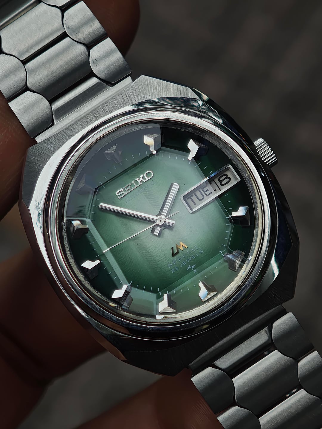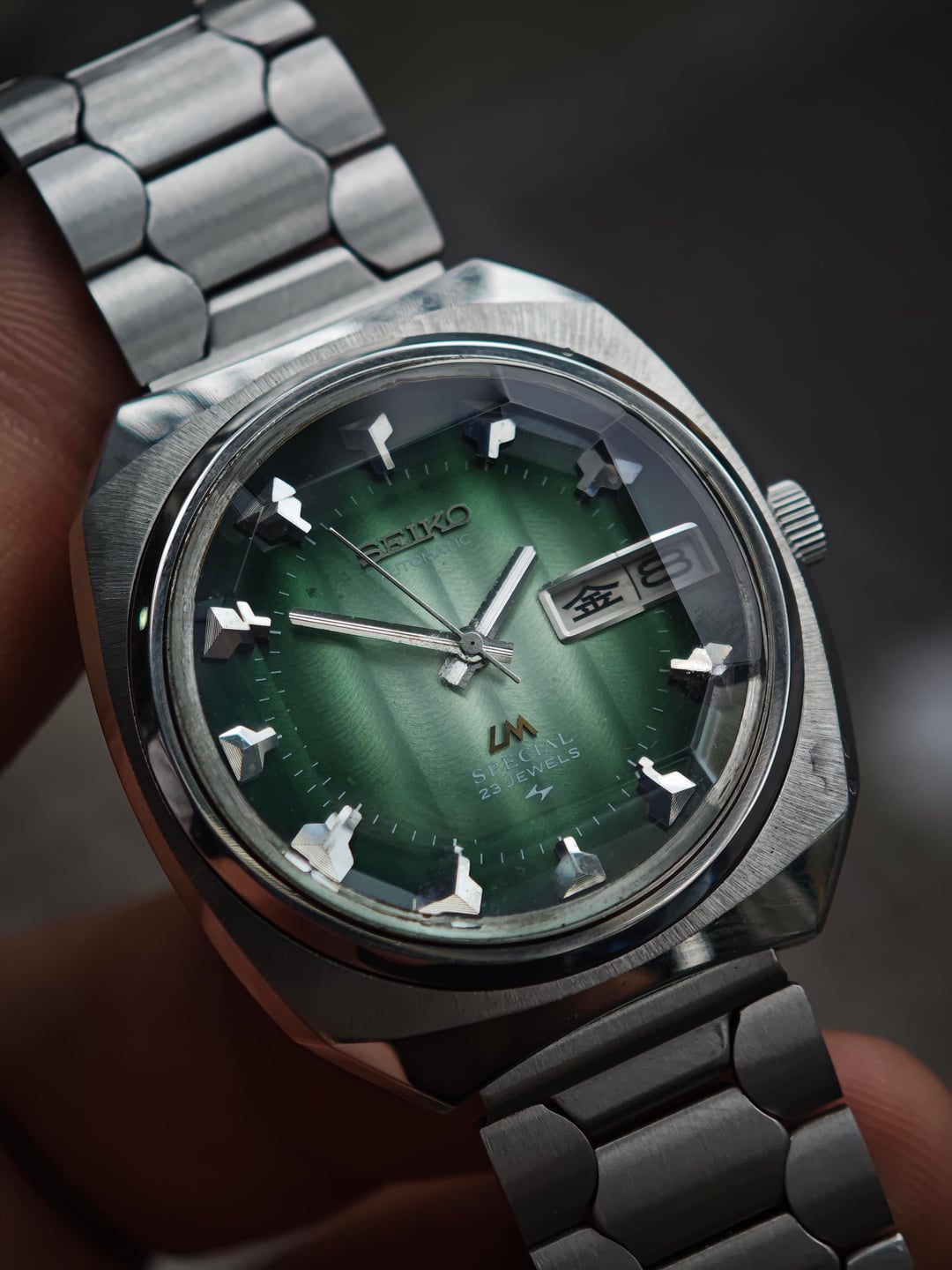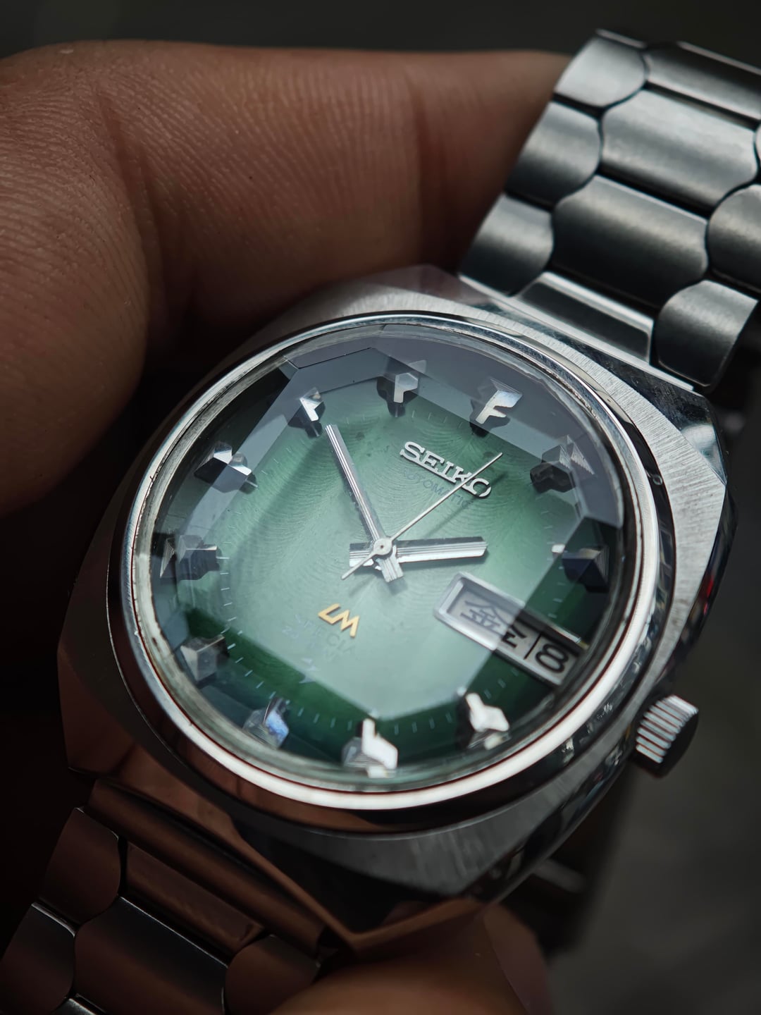 Another win from the Japanese auction, and this one brings some real attitude. Presenting the Seiko Lordmatic Special 5216-6010S, affectionately nicknamed “Green Shark Teeth” for its razor-sharp hour markers and deep aquatic tone dial. Running the high-beat 5216 Special movement, this model represents peak early-’70s Seiko engineering—quickset day/date, smooth sweep, and that refined LM Special case geometry that wears beautifully on the wrist. The green sunburst dial shifts under light like the surface of deep water, giving the whole watch a living, dynamic character. Comes fitted with an aftermarket bracelet, comfortable and clean. Price: $300 USD shipped (tax included) Timestamp & additional photos available on request.