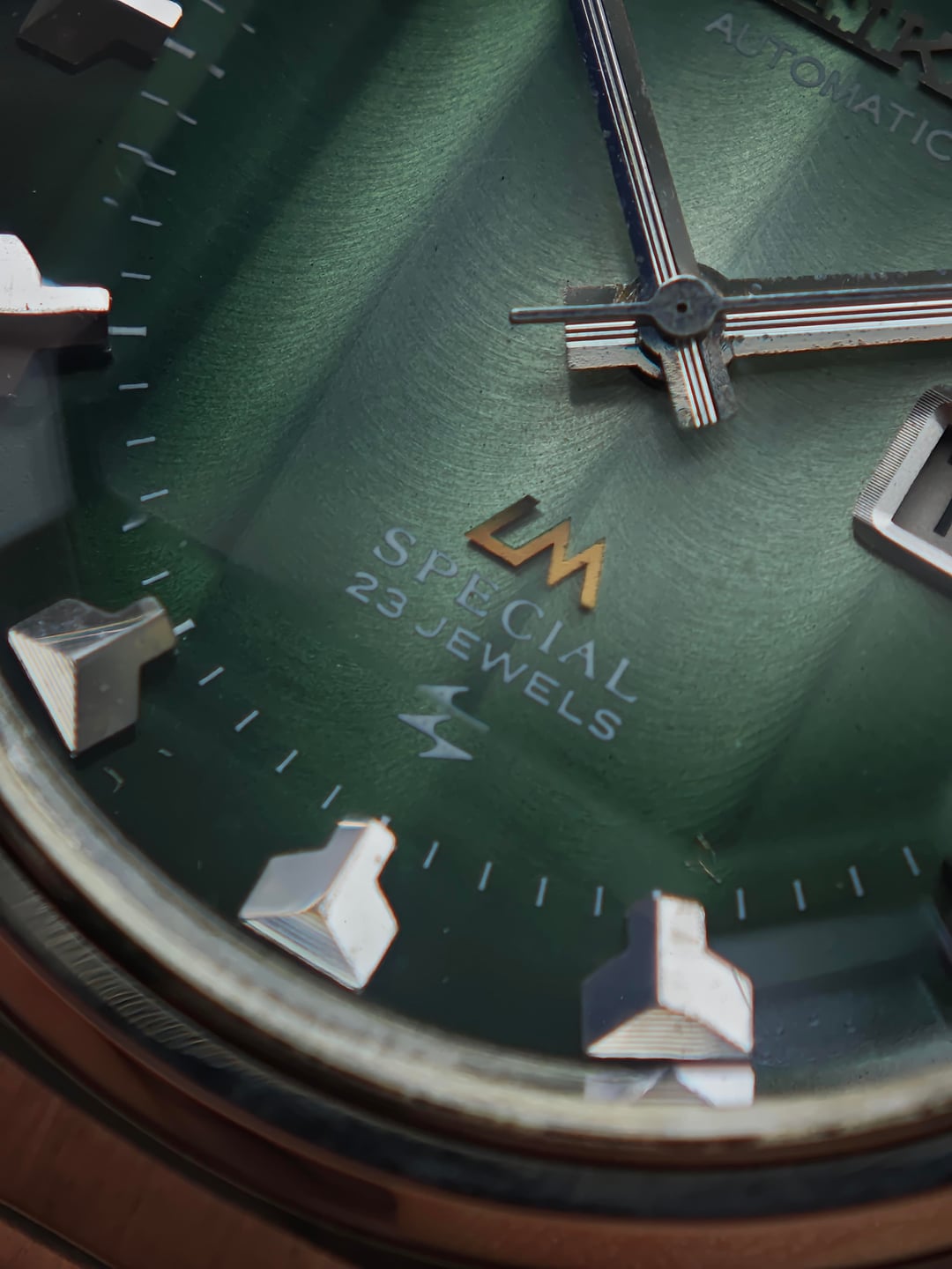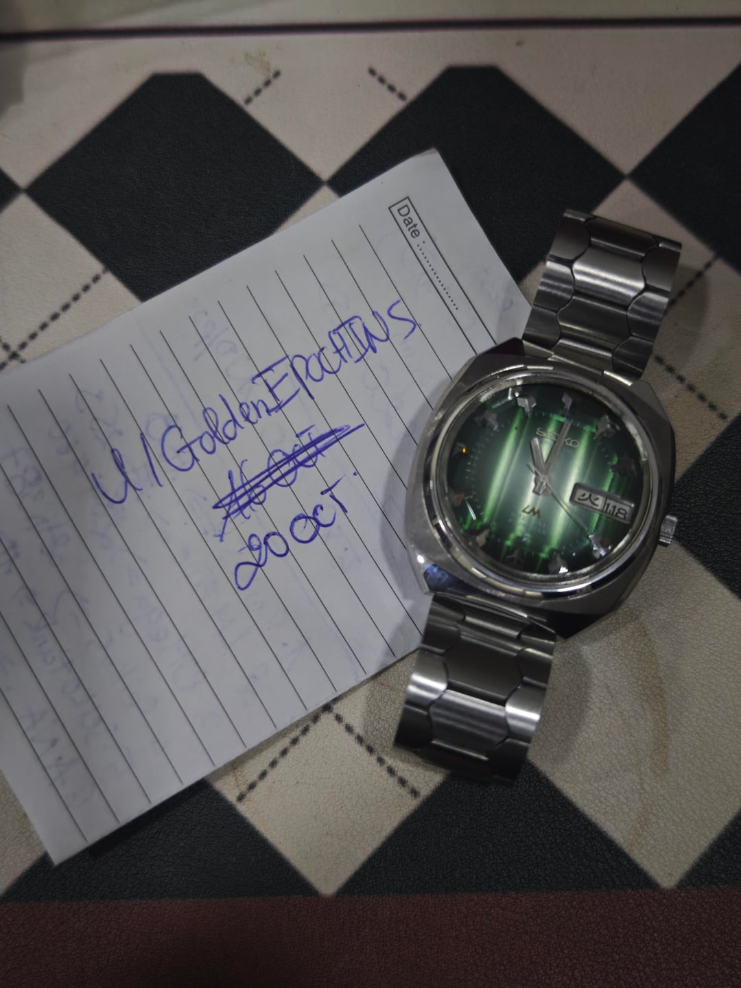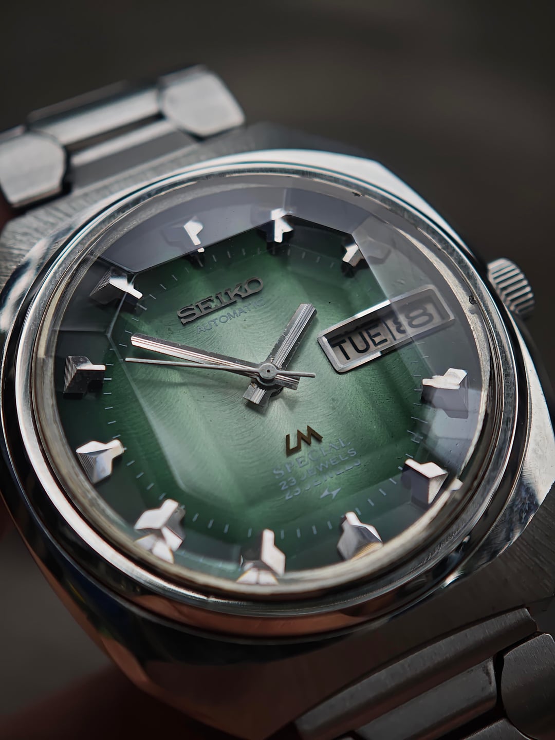 Another win from the Japanese auction, and this one brings some real attitude. Presenting the Seiko Lordmatic Special 5216-6010S, affectionately nicknamed “Green Shark Teeth” for its razor-sharp hour markers and deep aquatic tone dial. Running the high-beat 5216 Special movement, this model represents peak early-’70s Seiko engineering—quickset day/date, smooth sweep, and that refined LM Special case geometry that wears beautifully on the wrist. The green sunburst dial shifts under light like the surface of deep water, giving the whole watch a living, dynamic character. Comes fitted with an aftermarket bracelet, comfortable and clean. Price: $300 USD shipped (tax included) Timestamp & additional photos available on request.