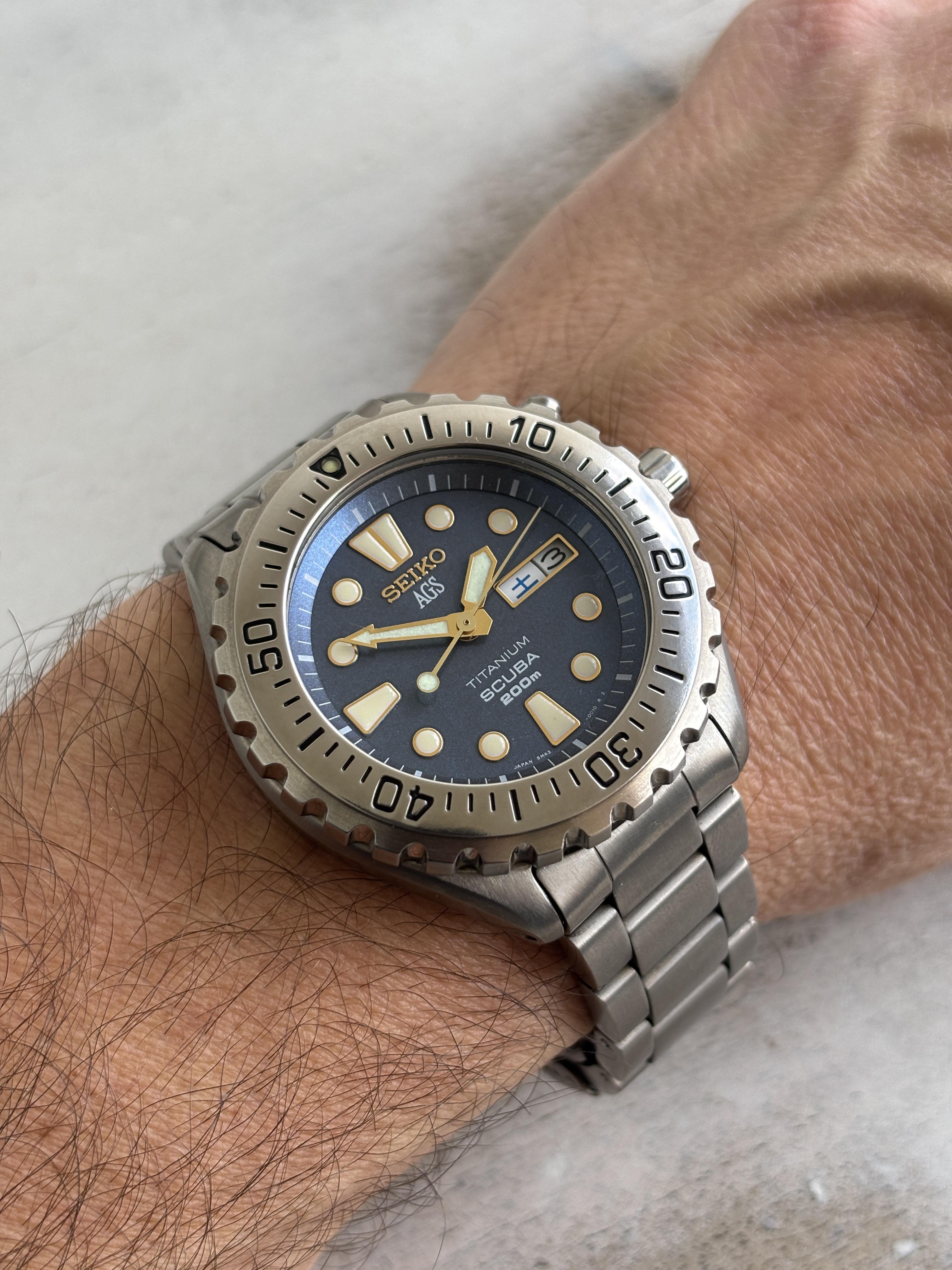 Seiko SBBW047 (5M43-0010). Kanji/English day wheel. Produced in March 1996. Kinetic movement. A kinetic watch uses a mechanical movement that is powered by a self-charging battery. Kinetic watches have a small mechanism on the back of the movement, which spins whenever the wearer moves their wrist. This movement is converted into electrical energy, and stored in a rechargeable battery. This battery then provides the energy needed to power the watch. Watch is running good. Everything works as it should. Screw down crown. Bezel turns with clicks. New battery capacitor (about 10 years life span). Case size: 42mm Thickness: 13mm Lug to lug: 46mm Lug width: 20mm Asking 545 USD shipped. No trades, please. Payment via Wise or PayPal F&F. Album: https://imgur.com/a/eiqyPgt Timestamp: https://imgur.com/a/0kLsUTI Thanks for looking and have a nice day.