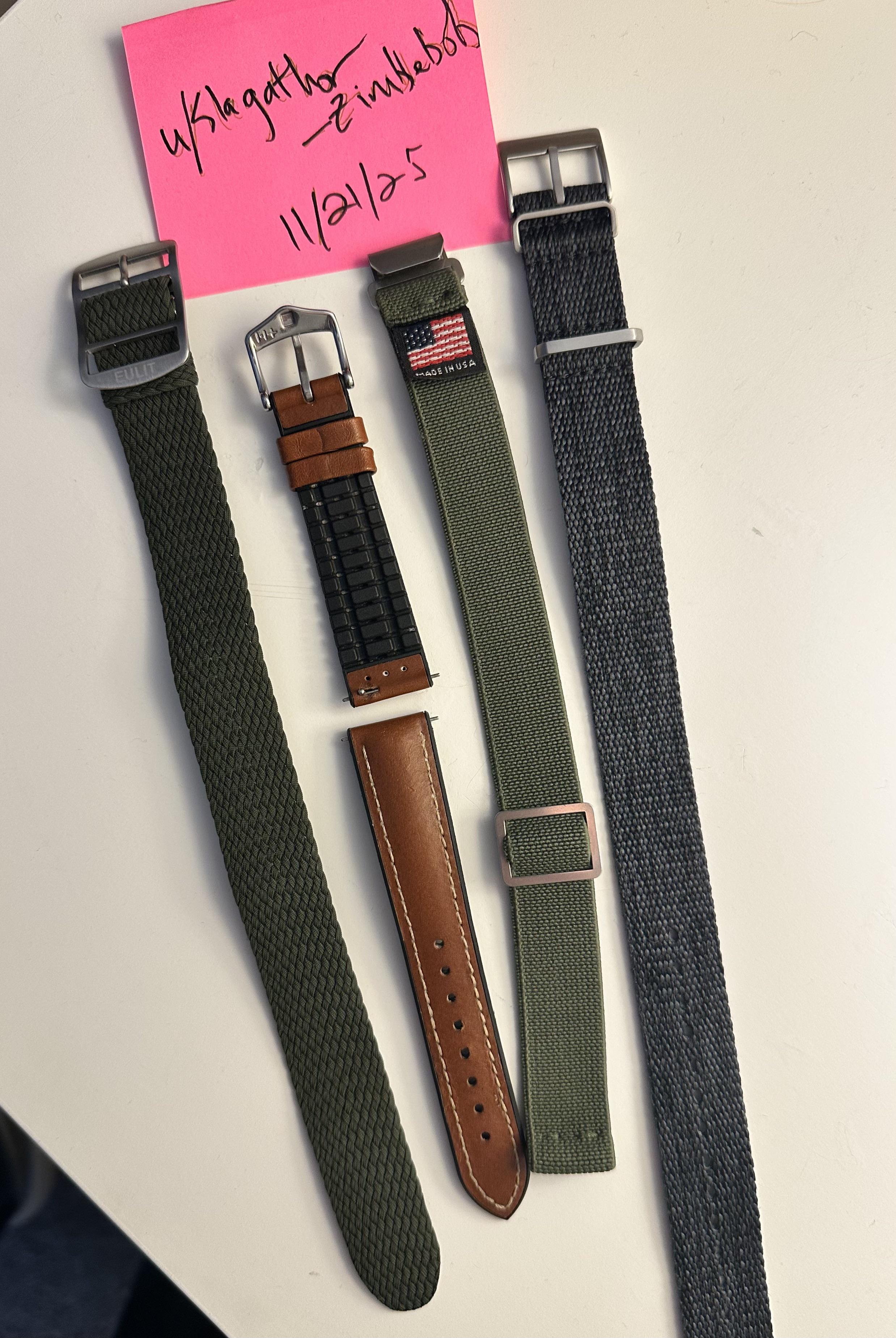 From left to right: 20mm Eulit Perlon- Green. Barely worn. Selling for $18. 18mm Hirsch James Performance- Golden brown. Size small. This is a very premium strap. Good condition, no creasing or bending. Natural rubber caoutchouc bottom that is vented for maximum comfort and durability. Bought for $130. Selling for $65. 18mm WatchSteward Minimalist- Green, 6.25in wrist. Excellent condition, no fraying. $10. 19mm Crown & Buckle Matte Supreme Single Pass- Shadow. Single layer NATO. Barely worn. Very impressive quality and depth of color. Like a textured charcoal grey. $10. Take all of them for $80. If you buy the Hirsch, choose one of the last two for free. I also have a generic 18mm brown CTS FKM rubber strap with Delugs-style spring deployant clasp sized to a 6.5in wrist, and a 20mm WatchDives silicone waffle rubber strap. If you want them just ask. They’re free. Ships from WA state. CONUS only please. Thanks!