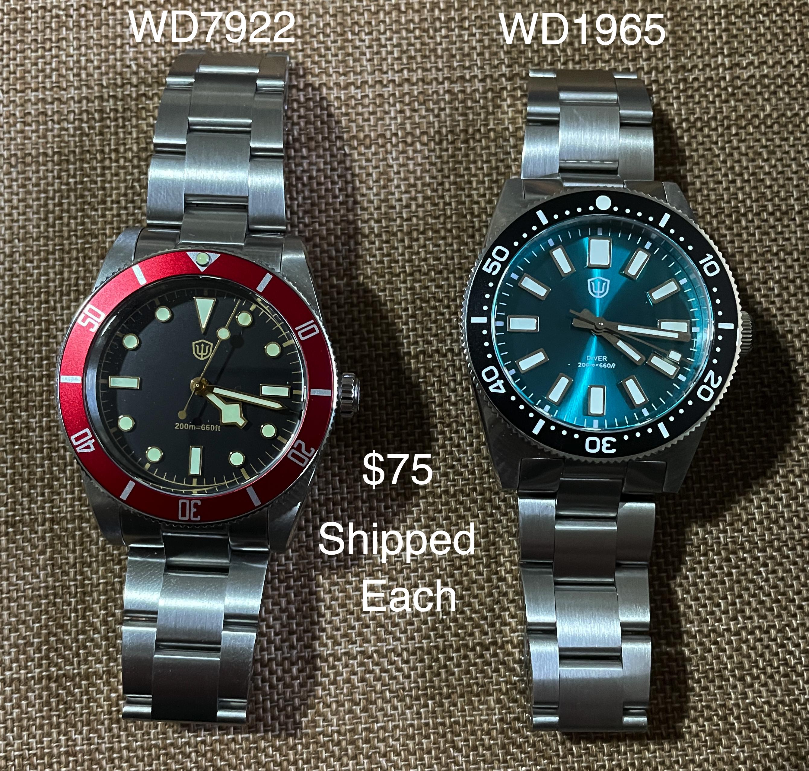 **$75 Shipped CONUS for each** Timestamp & receipt - [https://imgur.com/a/watchdives-timestamp-11-21-2025-l9nFtDQ](https://imgur.com/a/watchdives-timestamp-11-21-2025-l9nFtDQ) More Photos of WD7922 - [https://imgur.com/a/dCPpocF](https://imgur.com/a/dCPpocF) More Photos of WD1956 - [https://imgur.com/a/U1jBZ6t](https://imgur.com/a/U1jBZ6t) I purchased both of these through Aliexpress on 10/19 and have had them only a short time. I love that they are quarts VH31 movements, thin, light and just easy to grab and go. However with a 8"/20cm wrist they just immediately felt too small. I tried to live with them for a few weeks, tried a FKM strap on the 62MAS, but just kept coming back to not feeling confident in the sizing. I now know that I need to stick to a 40mm bezel and 47-50mm lug to lug to be happy. :-/ My loss - your gain. The WD7922 I wore a few times, tried a new strap. The WD7922 was worn with the plastic largely on knowing it felt too small and this day may come.