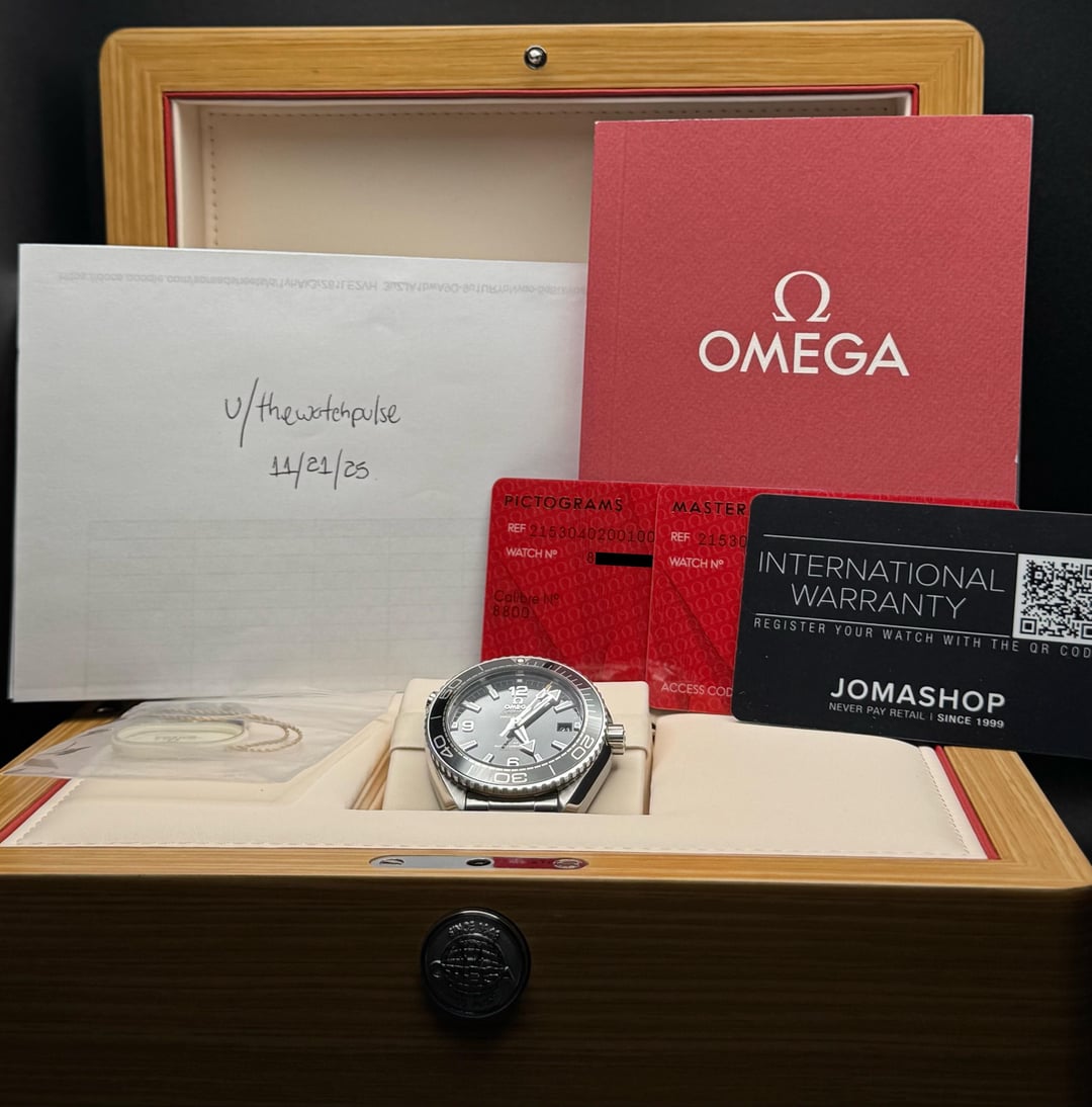 **This is the first Planet Ocean generation to introduce the 39.5mm case size** making it one of the most desirable and collectible versions in the long term. **Under warranty until 2028 with Jomashop.** International Jomashop warranty card instead of the Omega factory card, as the watch was originally purchased through Jomashop. This timepiece comes **Full Set with**: Omega presentation double boxes, manual, extra links, white tag, Certificate Chronometer card, Pictograms card and Jomashop warranty card valid until 2028. **Conditions:** • **Very good pre-owned condition** • Case and bracelet show minimal signs of use (nothing major). • Sapphire crystal is flawless with no scratches • Gloss black ceramic bezel is clean and free of marks • Dial is perfect with strong lume and no imperfections. Price: **$4,250 Shipped** CONUS Professionally packaged and shipped fully insured. We usually ship the very next day, **so you get your watch quickly and without delays.** **I’m always happy to help with any questions and provide additional photos or videos.**