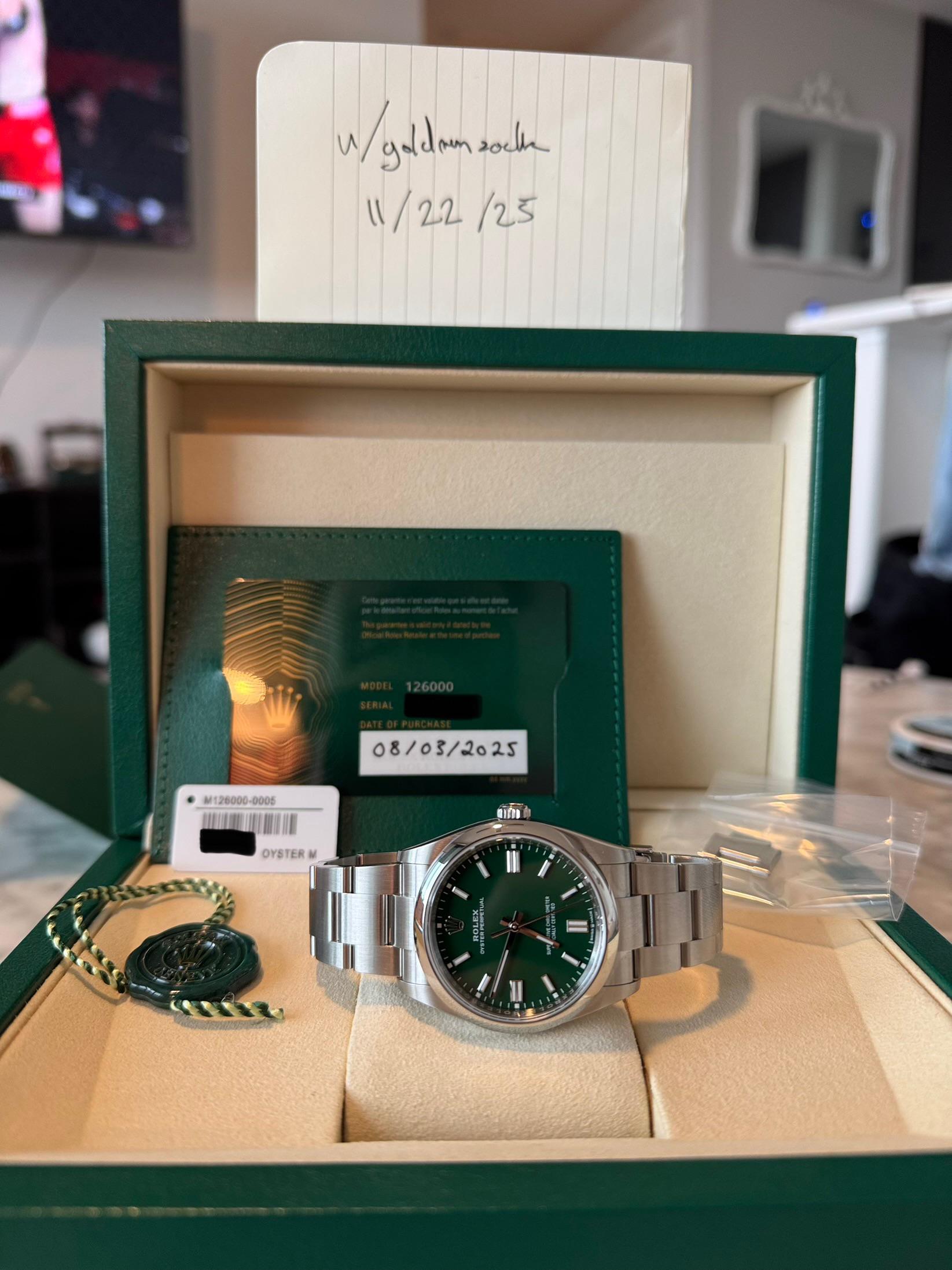Hello all! For sale, I have a 36 Oyster Perpetual w/Green Dial (126000-05). Card dated March 2025. Brand new and unworn. Purchased by a friend and put in a safe. $8,900 shipped overnight, firm. Full set w/white tag and all links included. Bracelet was sized when purchased. Bank wire/paypal accepted. Happy to hop on a FaceTime / call to discuss/show the piece in more detail. Pictures / Timestamp: https://imgur.com/a/Alvv5ae