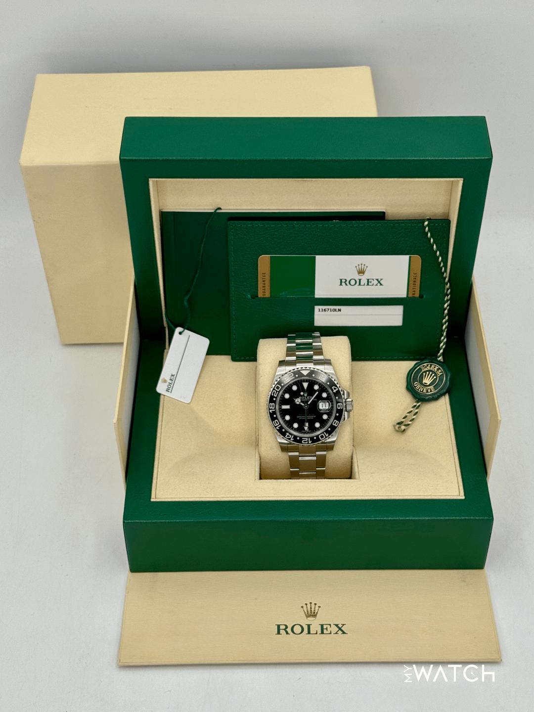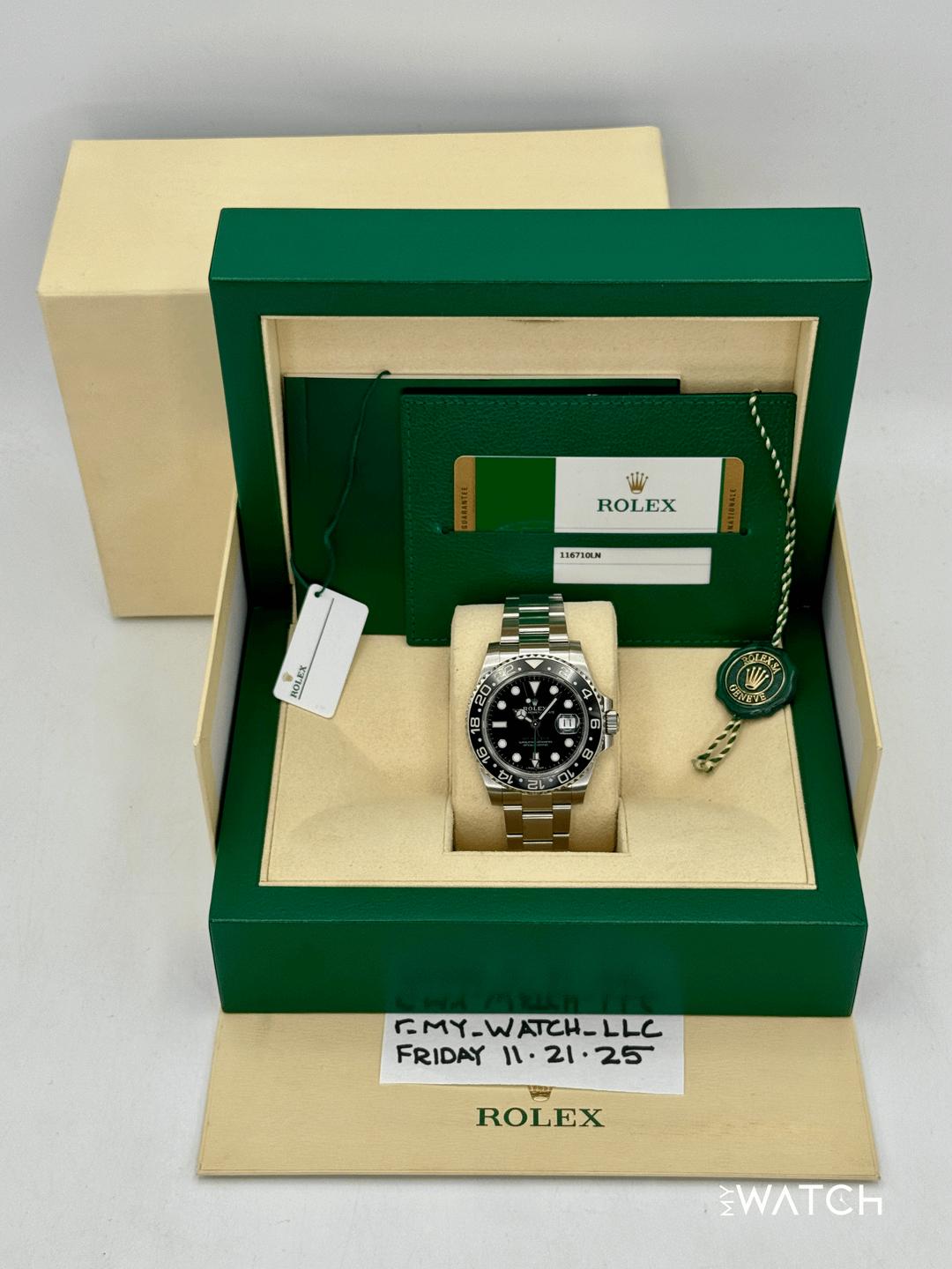 🔵**2018 Rolex GMT-Master II 40mm 116710LN Stainless Steel Black Dial** 🔵**TRADE or SELL us your luxury watch, all brands considered. Message me details.** **Includes the following:** **✔️Original Rolex Double boxed** **✔️Box and Papers - Yes** **✔️Warranty card dated 2018** **✔️Manual and Warranty booklets** **✔️Green and White Hang Tags included** **✔️Size: 8.0inch wrist (Full Links)** **✔️Watch is in excellent overall condition. Please see photos for details.** **✔️Trades welcome** Business Name: **My Watch LLC** LOCATION: Oak Park, Michigan ✔️[MyWatchLLC.com](http://mywatchllc.com/) for current inventory ✔️Google Business Listing [https://g.co/kgs/Cmd6FPW](https://g.co/kgs/Cmd6FPW) ✔️Business Hours M-F 9-6 ✔️Facetime/Video chat/calls welcome to view the watch interested. ✔️Contact: 248-422-0909 via text or call for quickest response. 🟢TERMS: Visit [MyWatchLLC.Com](http://mywatchllc.com/) for payments accepted 🟢REFERENCES/REVIEWS: We are well reviewed on all platforms from google, trust pilot, rolexforums, additionally we have 300+ reference in multiple FaceBook watch groups, reference checks welcome. 🟢SHIPPING: If you are not local, we offer Fully Insured FedEx overnight shipping in the USA for a fee. International shipping available.