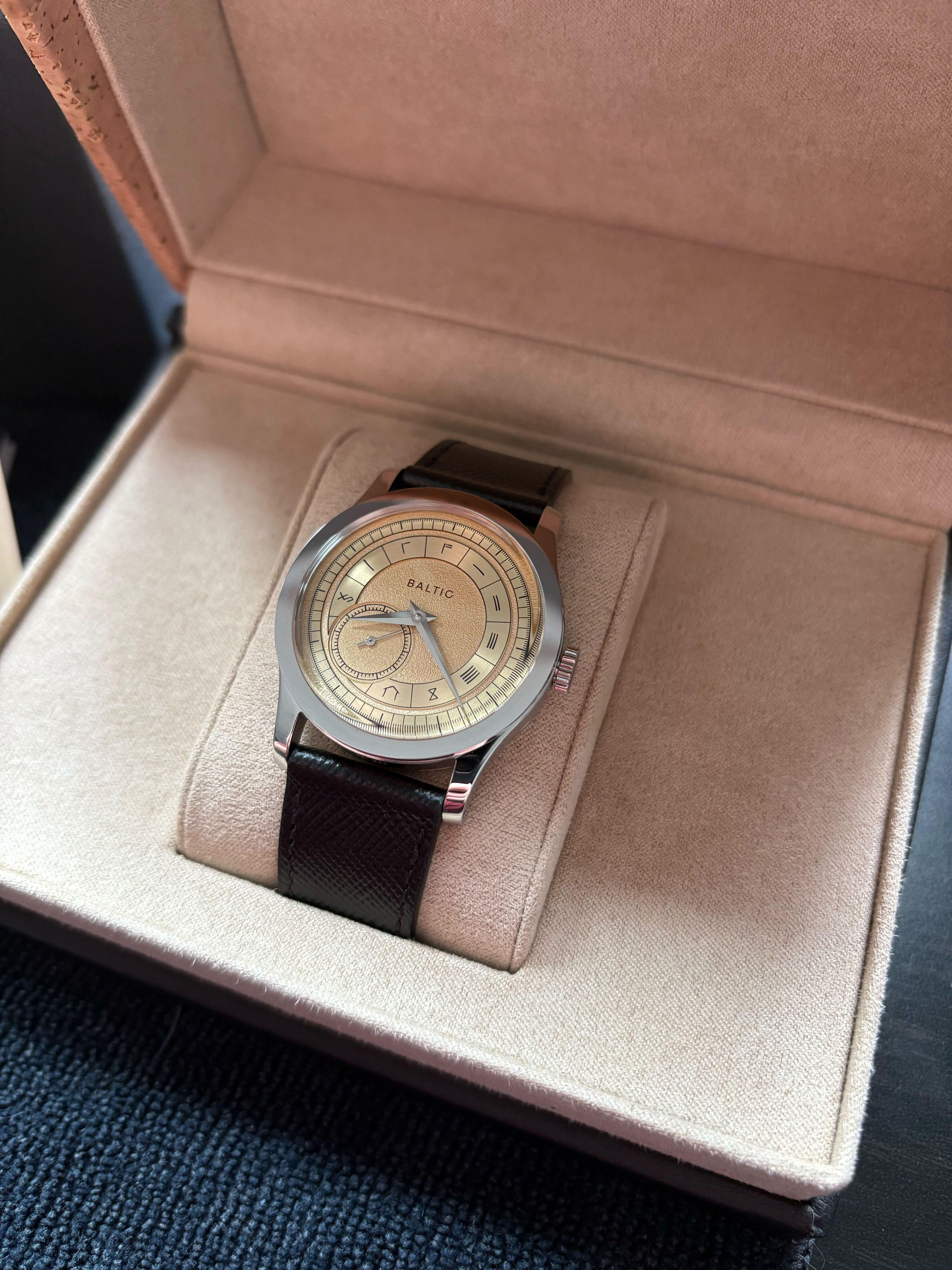 For sale today is a limited edition version of the Baltic MR "Roulette". This is one of a limited edition of 300 that was done exclusively for the WestWood Time boutique in Hong Kong. This particular model features a beautiful champagne dial and unique [oracle bone script](https://en.wikipedia.org/wiki/Oracle_bone_script) numerals, an ancient version of written Chinese. Case Diameter: 36mm, Lug to lug: 44mm, Thickness: 9.9mm (8mm without glass), Lug width: 20mm Glass: High-domed hesalite Movement: Hangzhou CAL5000a Micro-rotor, automatic winding, 42h power reserve More pictures including timestamp can be accessed [here](https://imgur.com/a/lwv1uyJ). Asking $950 and willing to ship anywhere in the CONUS. Venmo or Paypal F/F preferred. Let me know if you have any questions!