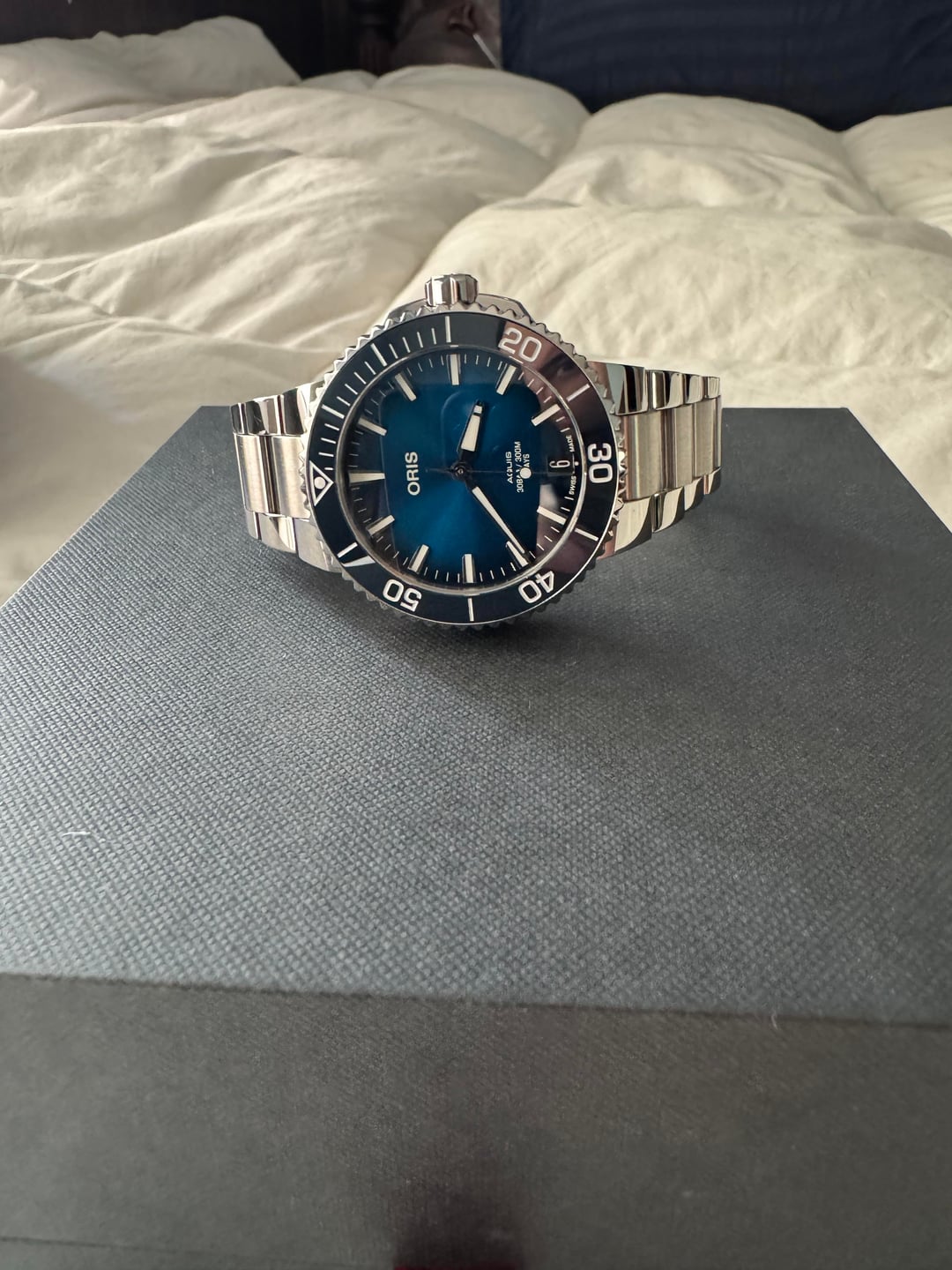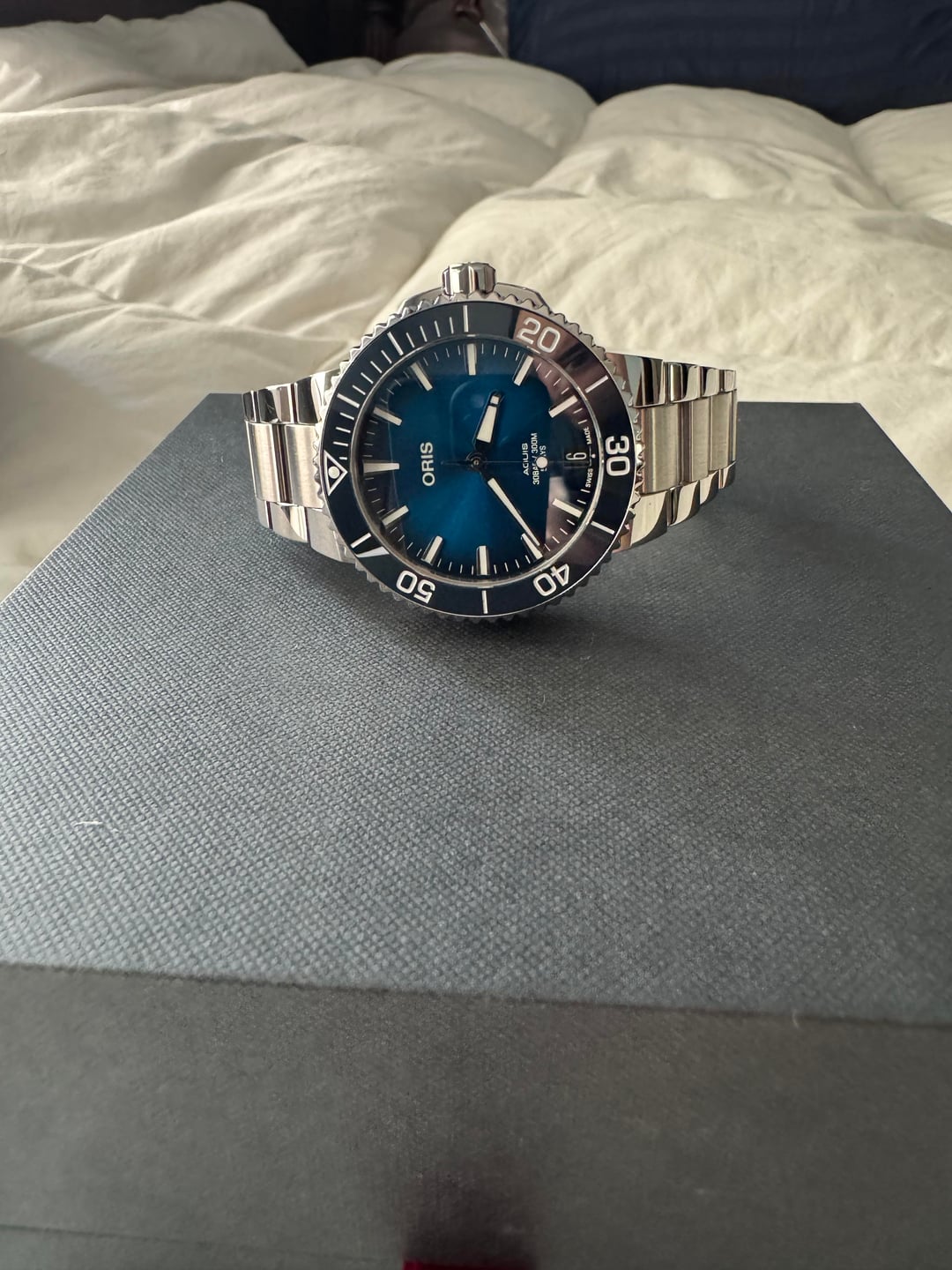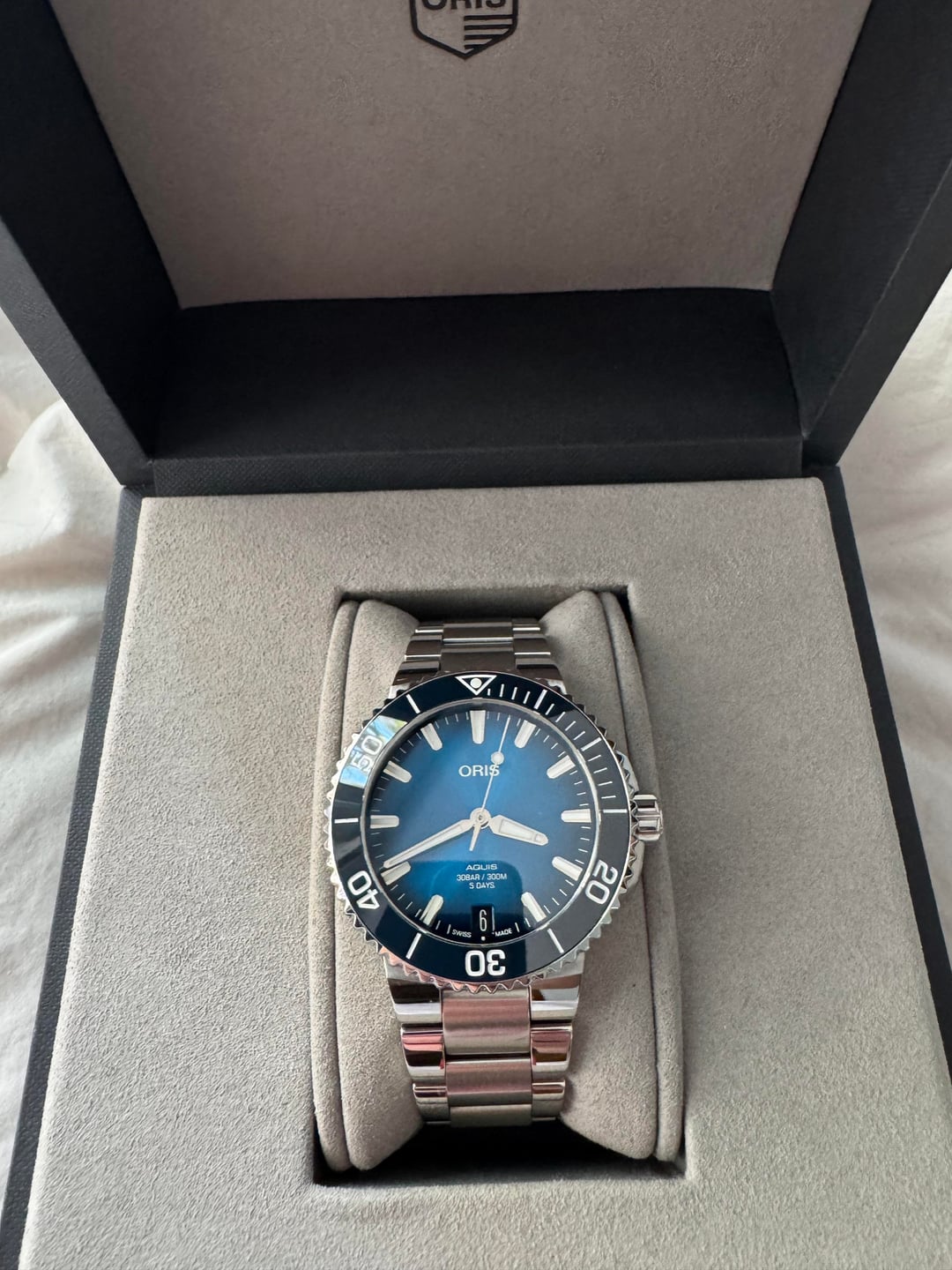 Selling my Oris Aquis Cal. 400-2. Gorgeous blue dial, 41.5mm case is spot on, and the quick-release bracelet /strap system on this model is fantastic. Not to mention, the 5-day power reserve means you can pick this watch up after a workweek and it’s ready for the weekend. Happy to answer any questions or show other pics. Condition: Hairlines on the polished links, watch head is flawless. 9/10 Box and papers included, still under warranty from ORIS. Will come with proof of service and registration No. to prove warranty. Timestamp: https://imgur.com/a/Lyw1y2n Asking $1450