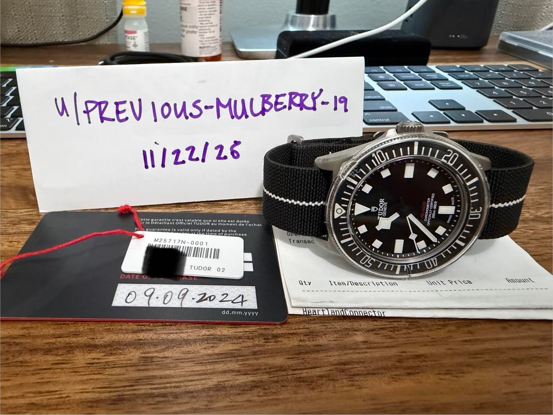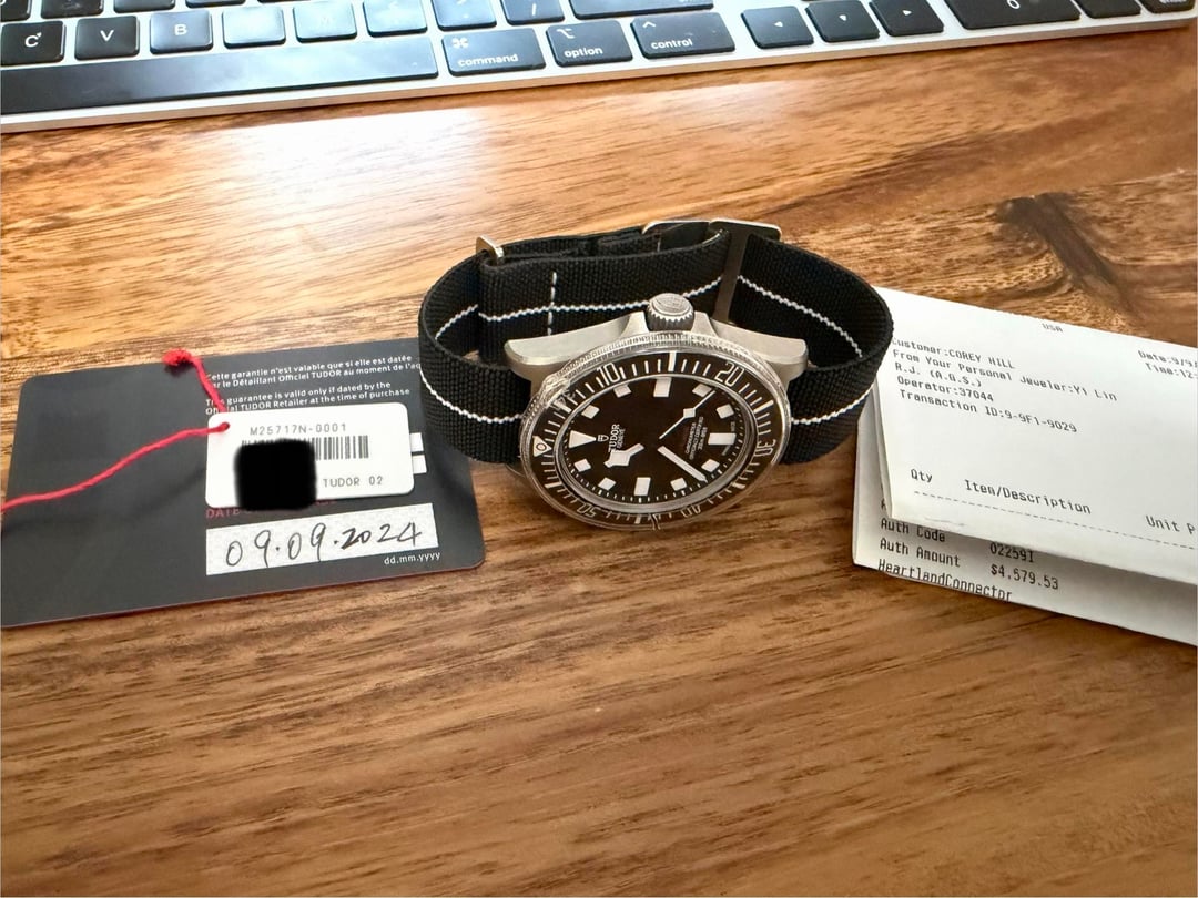 Hello all! Listing my September 2024 Tudor Pelagos FXD. Set comes with the watch in phenomenal condition, an extra Tudor OEM strap, and an Erika’s original strap that’s designed for FXD watches. Comes with hang tags, and warranty card as well. Box was damaged in some water, but am willing to ship in an Omega watch box. Asking 2700 plus shipping, OBO within the continental US. Shoot me any questions!