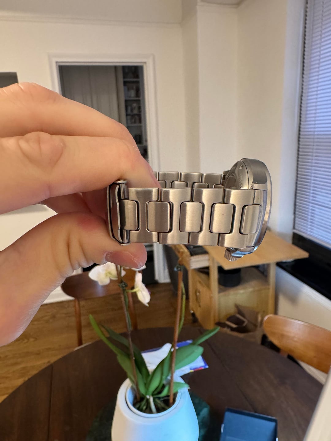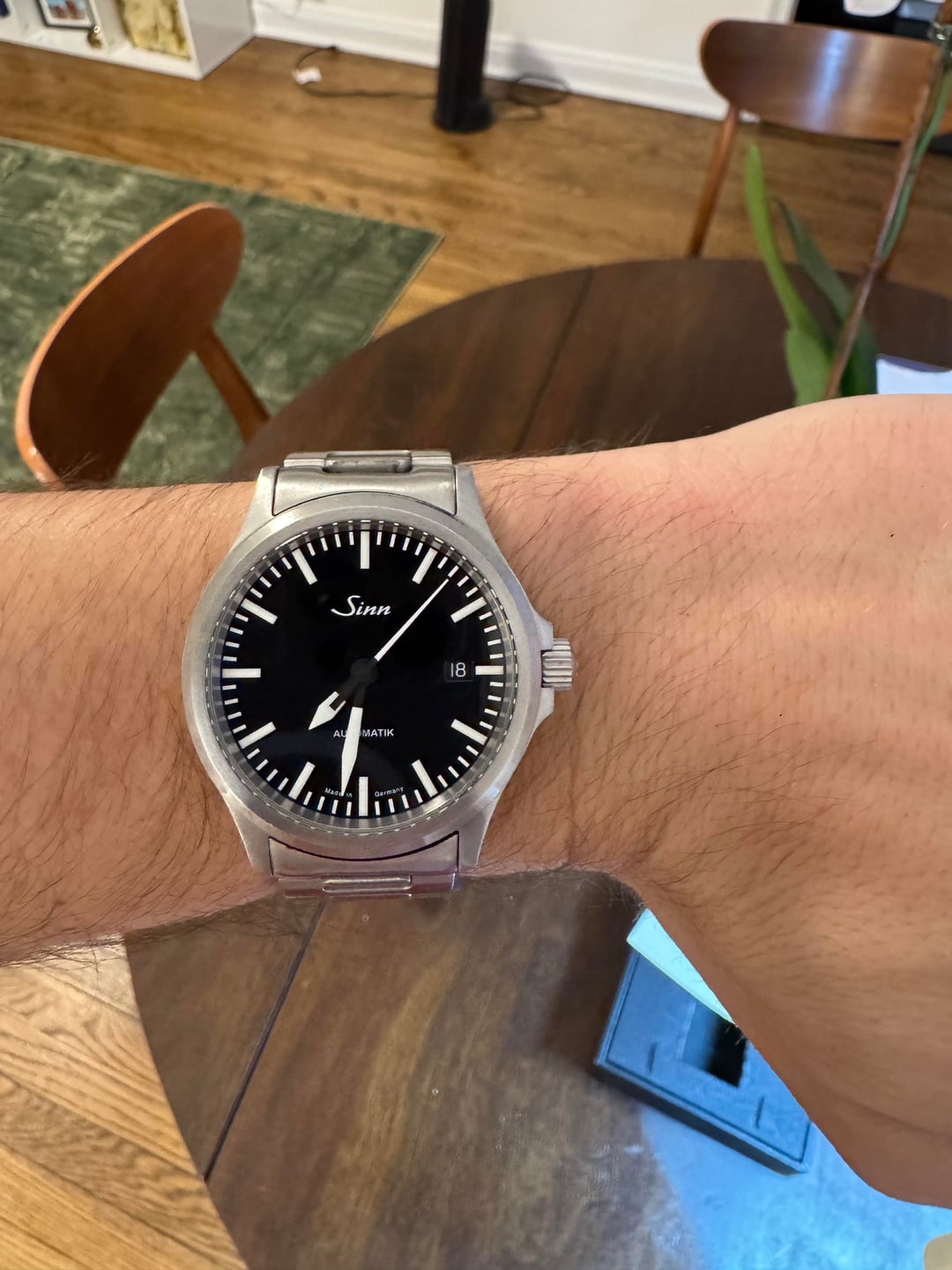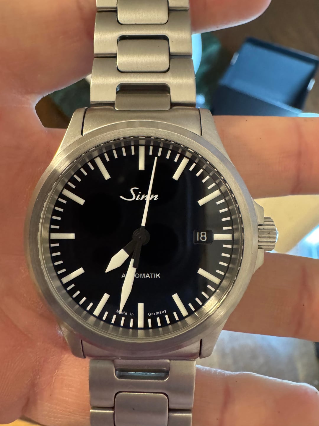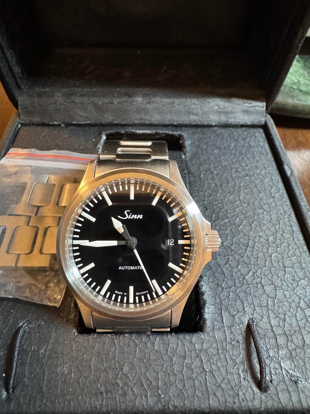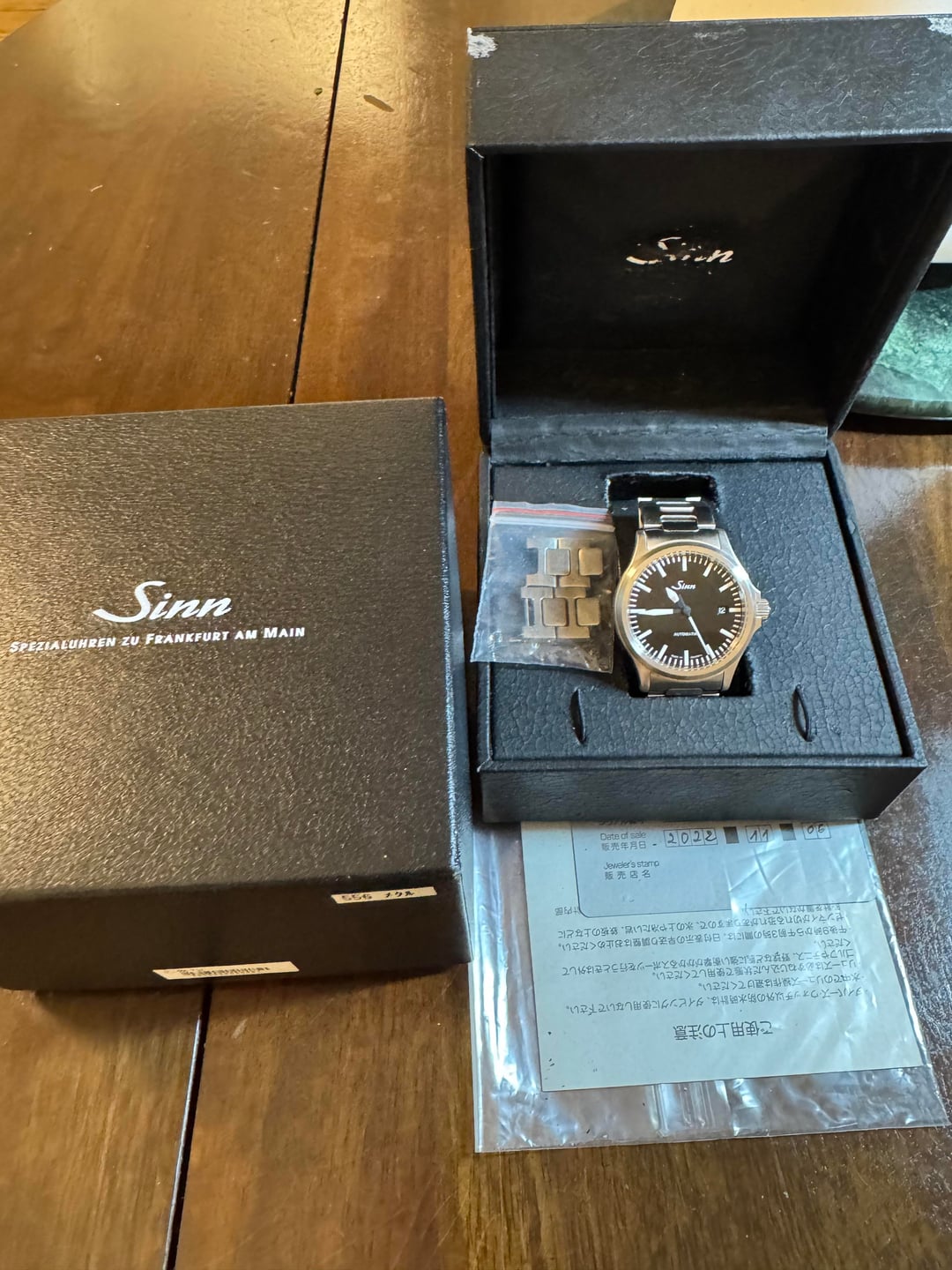 This Sinn 556 I (indices dial) was originally purchased in Japan in 2022 and includes the Japanese-market manual, papers, and warranty card. It features the Top Grade ETA 2824-2 movement—confirmed by community members—as Sinn was transitioning away from ETA at the time. I bought this watch here on r/WatchExchange for $1,310 about four months ago and have worn it occasionally since. The case and crystal are clean with no visible AR coating marks, the bracelet shows only light hairlines, and the clasp has normal desk-diving scuffs. The watch runs well and winds smoothly. Specs are 38.5mm × 11mm with a 20mm lug width and 200m water resistance (screw-down crown). Included are the inner/outer boxes, papers, warranty card, and four spare links (no Sinn sizing tool). Asking $1,250 + shipping, just looking to pass it along at a fair price. Ships from New York. Payment via Zelle, Venmo, or PayPal F&F. No trades.
