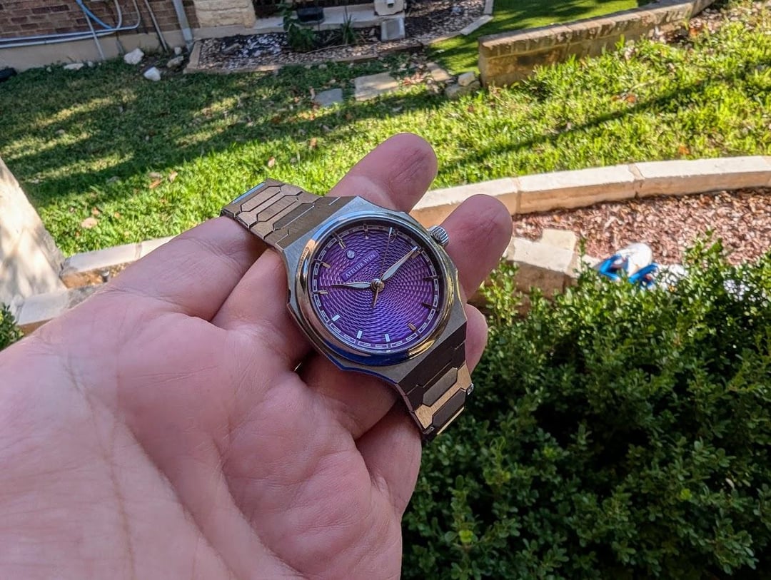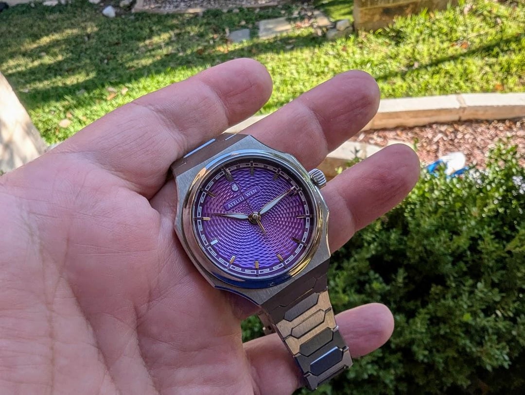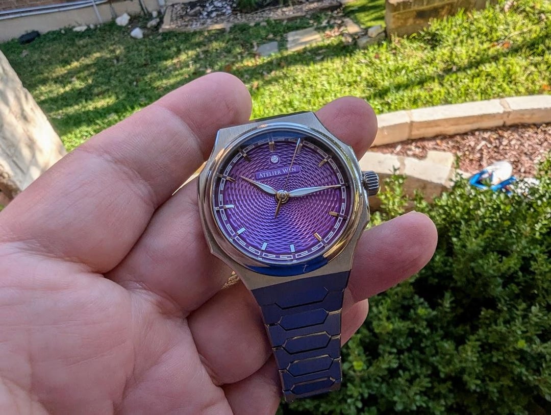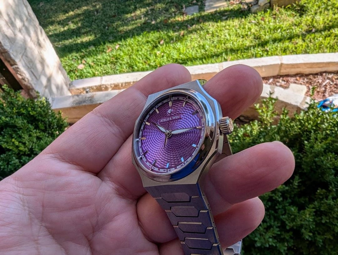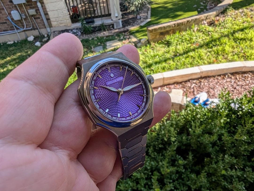 For you consideration is my Atelier Wen Perception Millesime in stunning purple guilloche dial. Watch is near mint. Watch is a nice size for everyone in 40mm x 9.4mm case of Grade 5 titanium. The guilloche dial catches the light to spectacular effect, with the color appearing to shift between deep purple and ultraviolet, depending on the ambient lighting. The effect is further accentuated by the application of luminous material on the chapter ring as well the hour and minute hands, making it stand out in low light environs. The watch will come with integrated titanium link bracelet and an exclusive to this edition salmon leather strap which cannot be purchased separately. The watch is powered by the Dandong SL1588A automatic movement, which is manufactured in China and boasts a power reserve of 41 hours, while operating at a brisk 28,800 vib/h. A crescent shaped sapphire window on the caseback offers a view of the balance and purple tungsten oscillating weight inside. I'm asking $4000 net to me and I'll cover shipping CONUS. TIMESTAMP:https://imgur.com/rivacr7