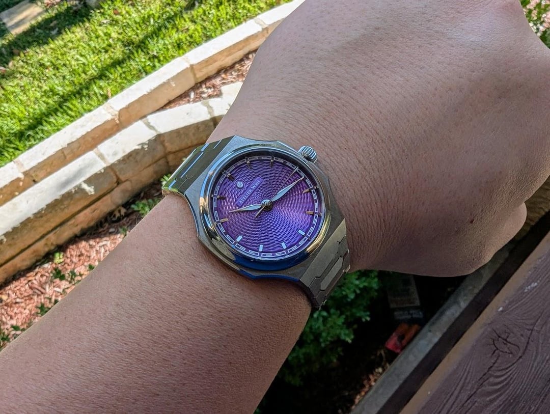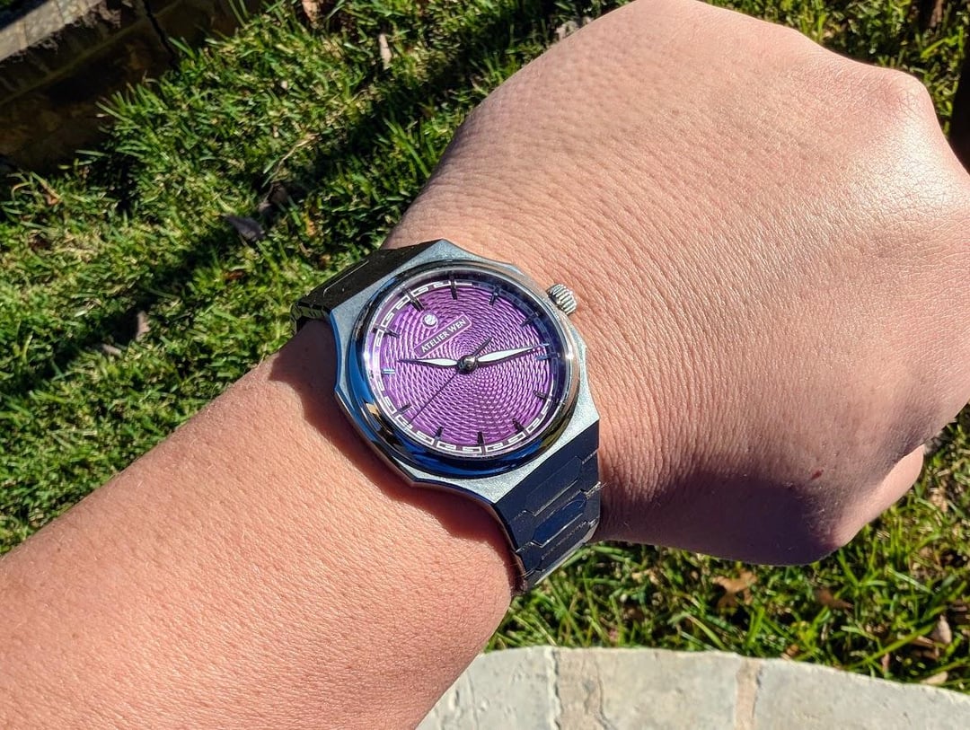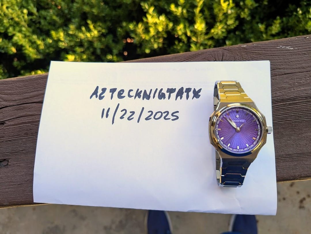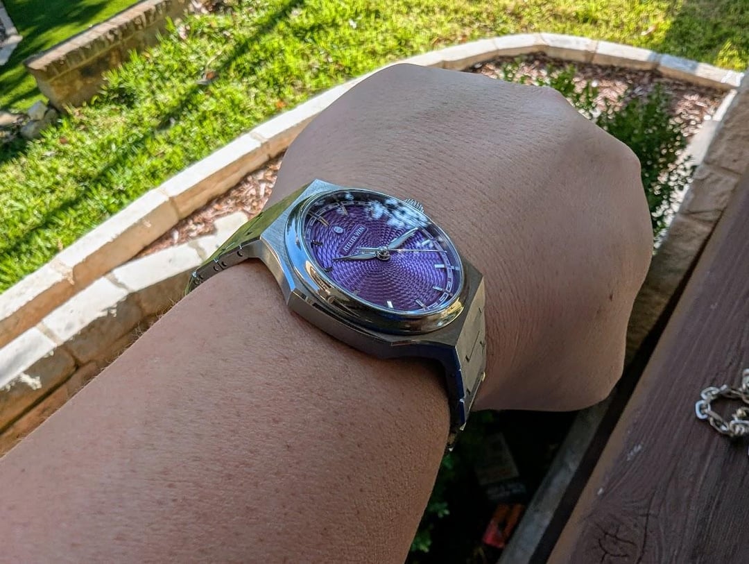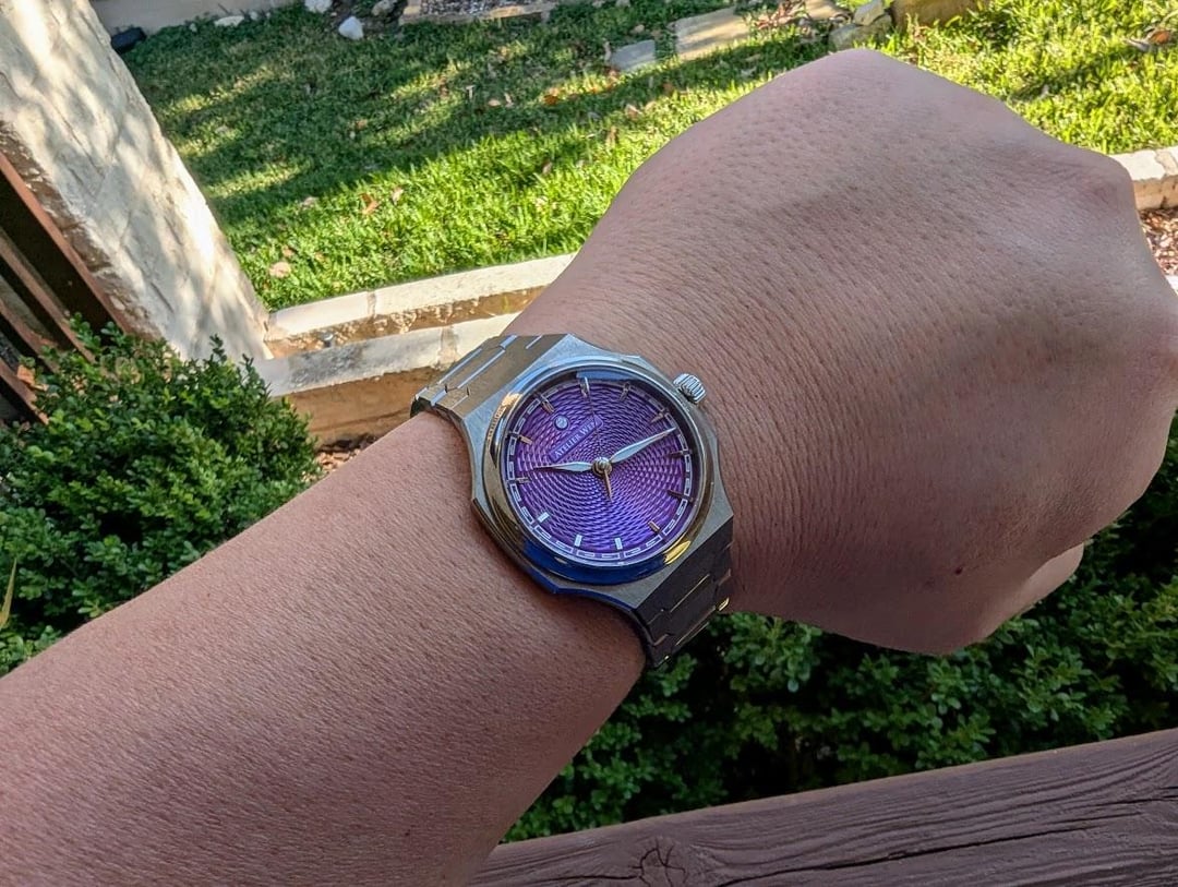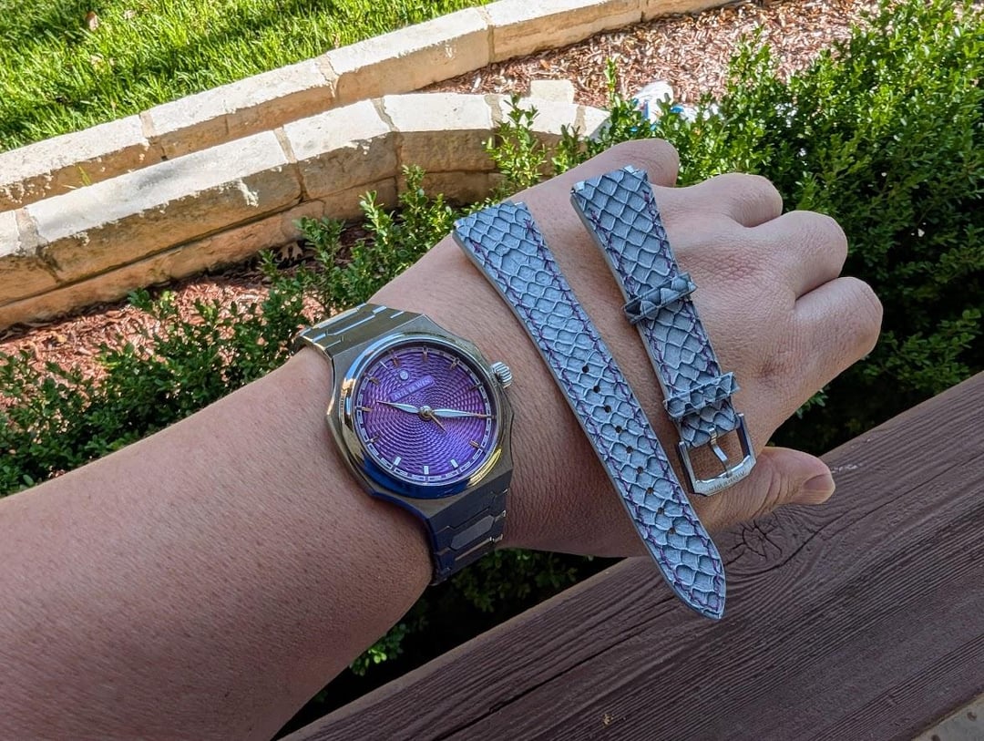 For you consideration is my Atelier Wen Perception Millesime in stunning purple guilloche dial. Watch is near mint. Watch is a nice size for everyone in 40mm x 9.4mm case of Grade 5 titanium. The guilloche dial catches the light to spectacular effect, with the color appearing to shift between deep purple and ultraviolet, depending on the ambient lighting. The effect is further accentuated by the application of luminous material on the chapter ring as well the hour and minute hands, making it stand out in low light environs. The watch will come with integrated titanium link bracelet and an exclusive to this edition salmon leather strap which cannot be purchased separately. The watch is powered by the Dandong SL1588A automatic movement, which is manufactured in China and boasts a power reserve of 41 hours, while operating at a brisk 28,800 vib/h. A crescent shaped sapphire window on the caseback offers a view of the balance and purple tungsten oscillating weight inside. I'm asking $4000 net to me and I'll cover shipping CONUS. TIMESTAMP:https://imgur.com/rivacr7