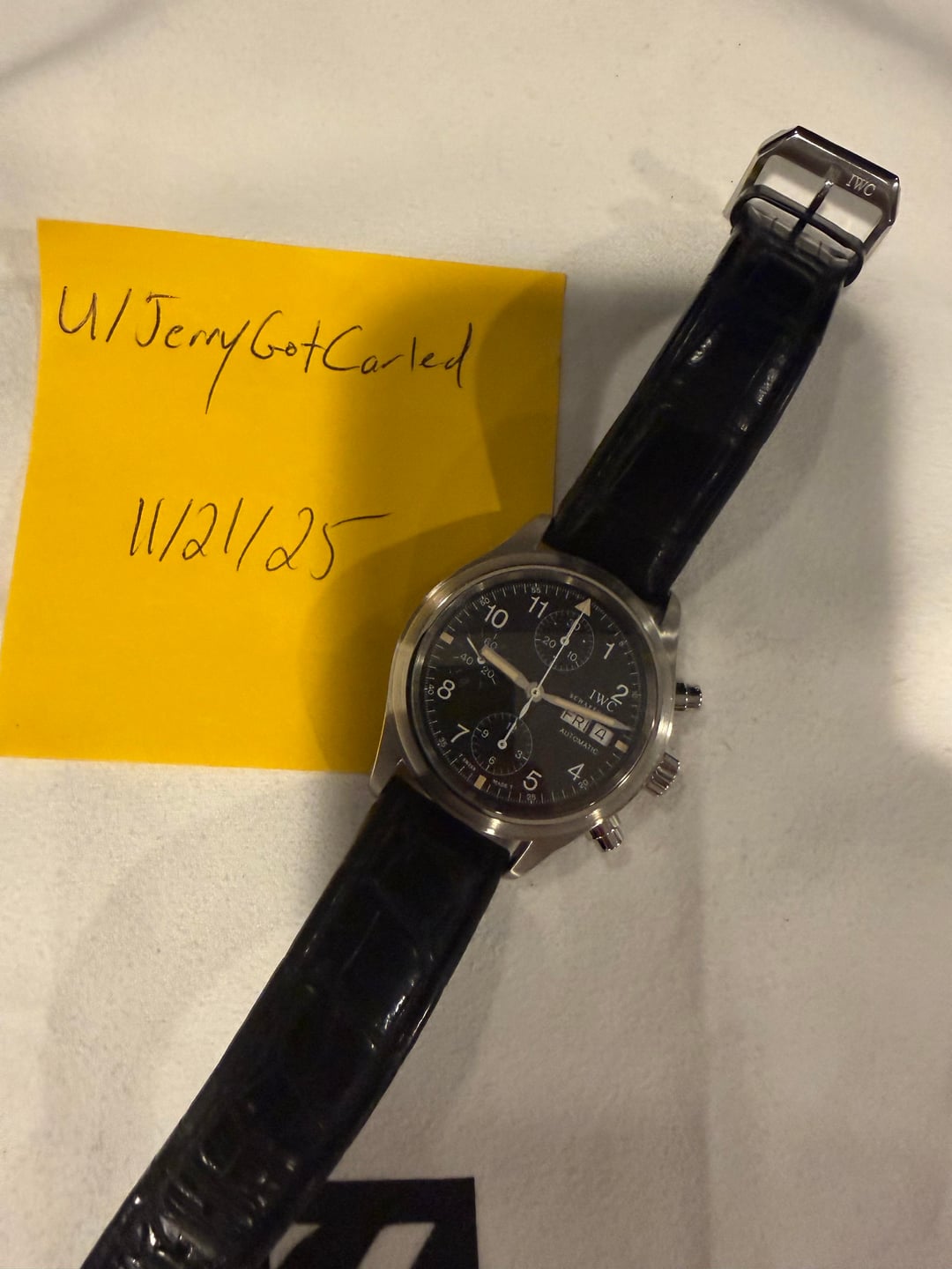 Selling a beautiful and increasingly collectible IWC Pilot Chronograph Ref. 3706 in the desirable 39mm tritium configuration. These early examples are getting harder to find—especially with matching creamy patina and the original fish crown still intact. Condition • Dial: Original tritium dial with perfectly even creamy patina on the markers. • Hands: Matching tritium hands with identical warm patina. • Case: 39mm stainless steel case in great condition with typical wear for age—no major dings. • Crystal: Sapphire crystal has some very fine scratches that are hard to see. Tried my best to capture in photos. • Crown: Original fish crown (not the later “probus” update). • Movement: IWC-modified Valjoux 7750 just professionally serviced. Running strong with crisp chrono function. • Service: Recently completed full professional service; service receipt will be included in the sale. • Strap/Bracelet: OEM strap and buckle. What’s Included • Watch only • Service receipt Price: $3,150 Shipping & Payment • Fully Insured FedEx CONUS • Payment via Zelle ,wire, or meet in person. I’m located in the Denver area. • References available Please let me know if you have any questions or would like further pictures. Also more than happy to hop on a FaceTime to show the watch to serious buyers. Thanks for looking. Cheers!