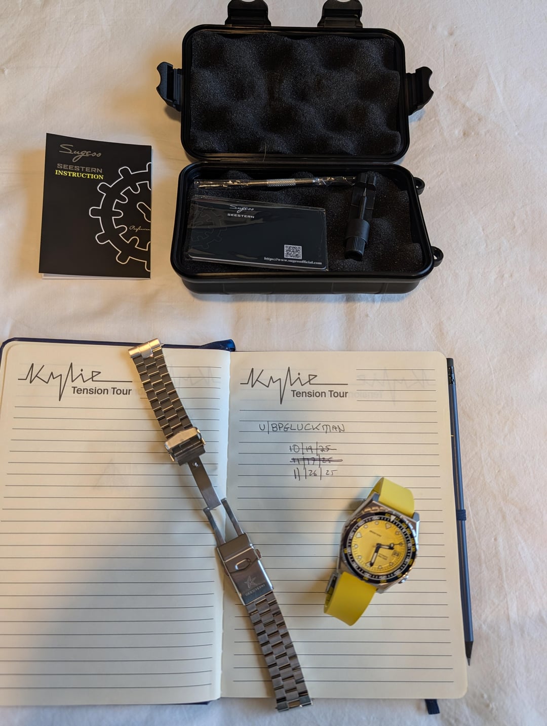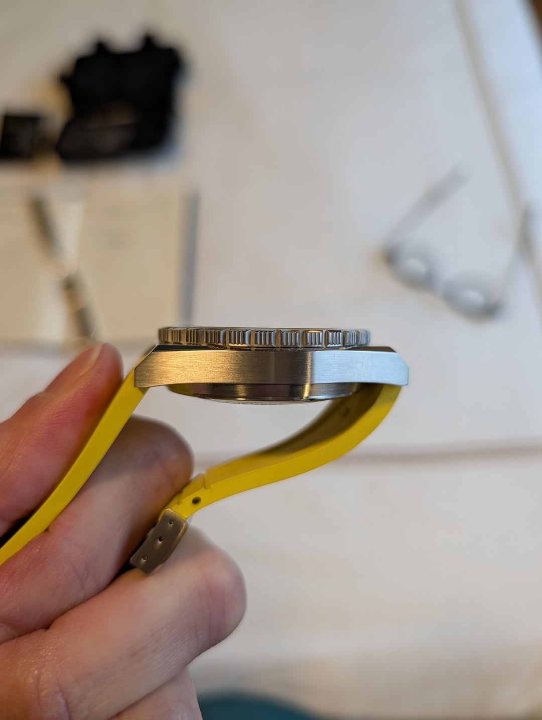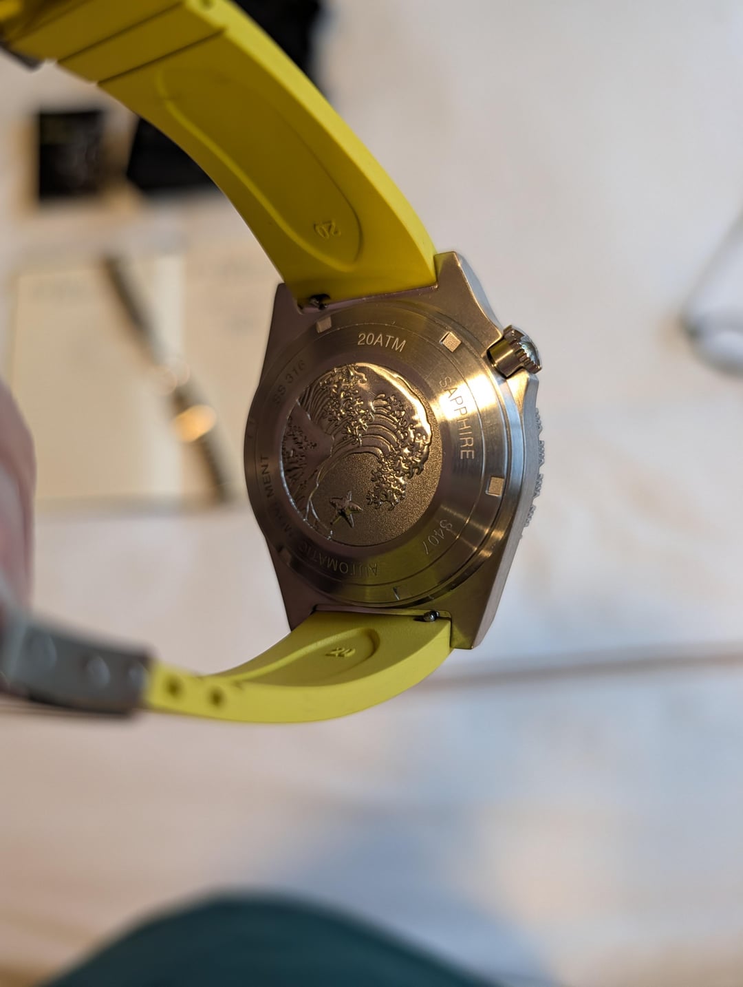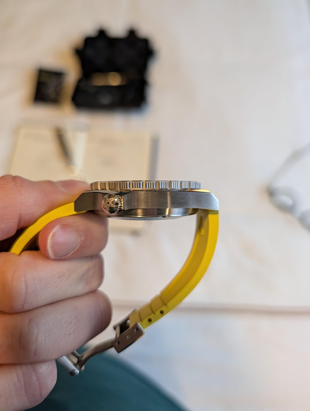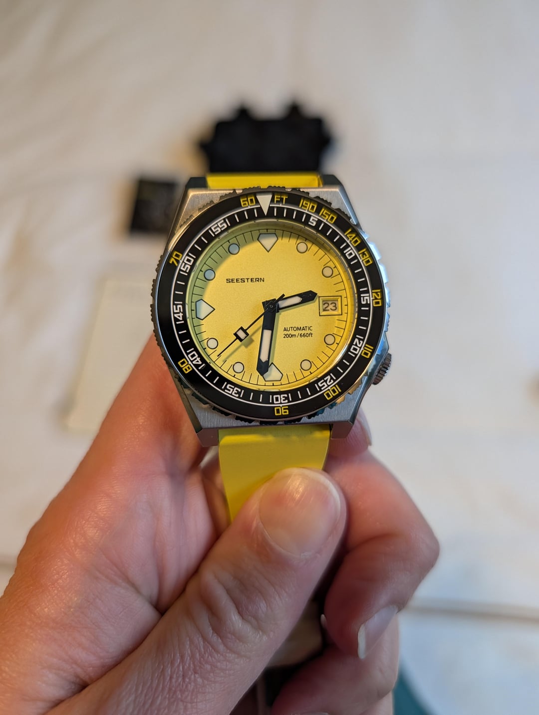 Selling a Seestern 600T with the black ceramic bezel insert. Comes mounted on a matching yellow CTS rubber strap sized to about 6.5" and includes the original bracelet that has never been resized, so all links included. Full specs below; asking $105 via either PayPal F&F or Zelle; please add $10 for PayPal G&S. Shipping in the US via USPS Priority Mail, and I have plenty of references as a buyer and seller. Case Material: All 316L Stainless steel, mixed finishings (brushing, polish, sandblasting) Case Diameter: 40 mm excluding the crown Bezel: Unidirectional rotatable bezel (360 degrees, sandblasted and brushed finishing), lume pip, ceramic Lug to Lug: 48 mm Height: ca 13.5 mm Lug width: 20 mm Weight: ca. 172 g (steel strap) Movement: NH35A Automatic movement with lumed date wheel Strap: Stainless steel bracelet, milled buckle with 4 micro adjustments, push pins Crown: Screw down crown (signed) Crystal: Flat sapphire, inner AR coating Hands: Updated version, wider hour hand Dial: Black Case back: Screw down with 3D art work Lume: Japan Lume glowing blue Water-resistance: 200m/660ft