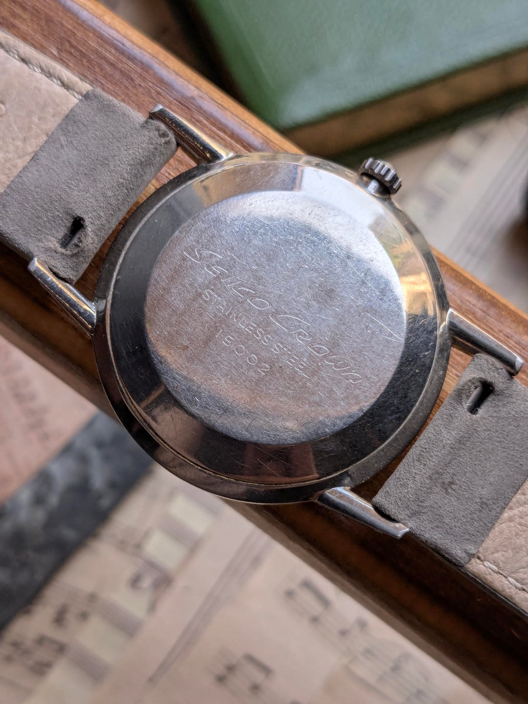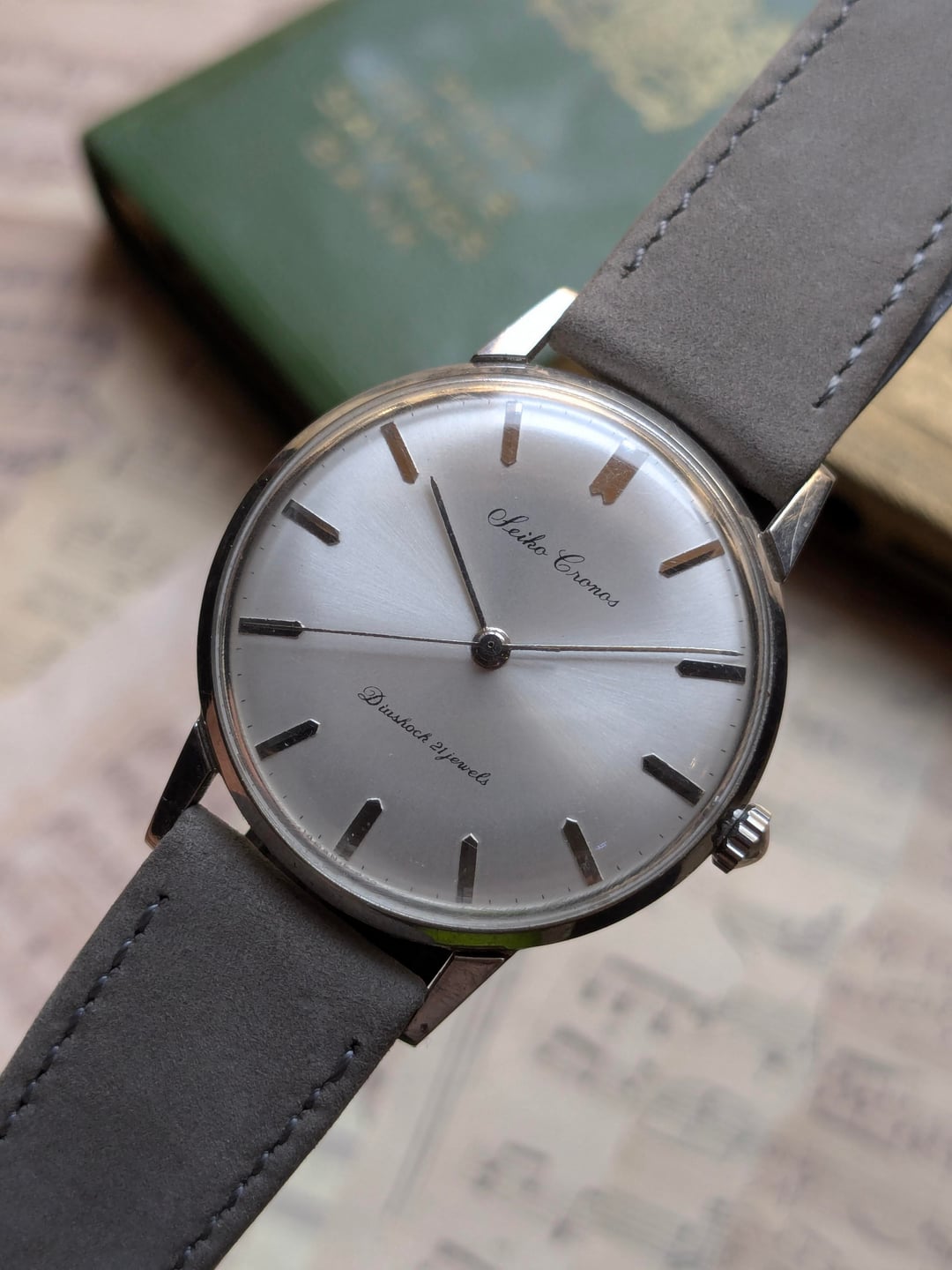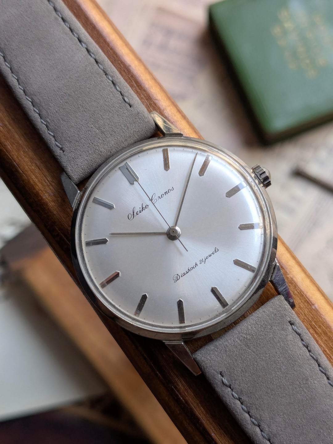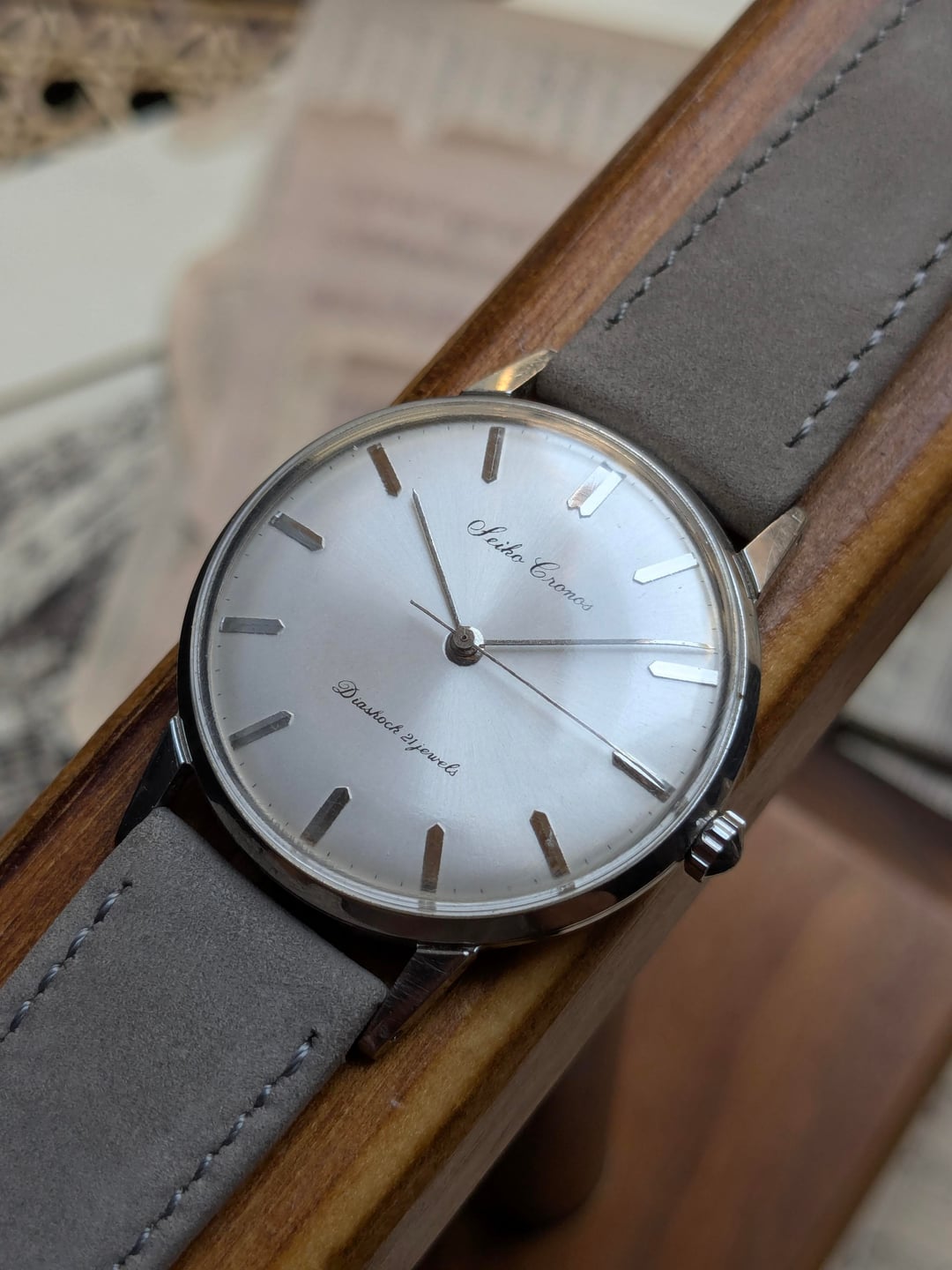 Seiko Chronos 15002 Manual Winding Movement Silver Sunburst Dial Stainless Steel Case Aftermarket Suede Leather Strap Diameter 37.6mm (including crown) Lug -to-Lug Length 43.1mm Watch Only Unknown service history, watch runs fine. Payment: Zelle / Wise / PayPal ( F&F Only). All sales are final. Please feel free to ask if you have any questions regarding the watch.