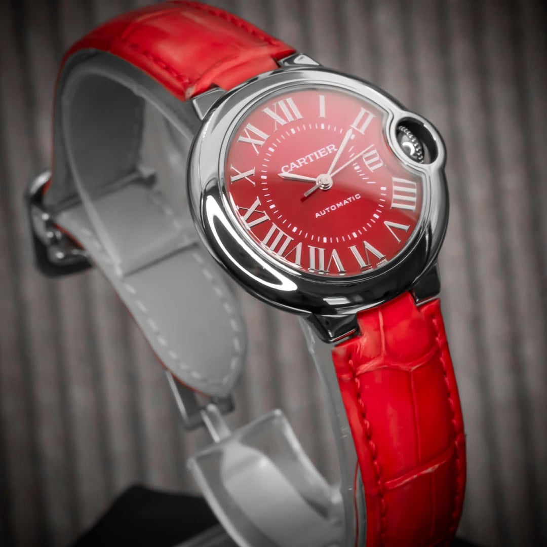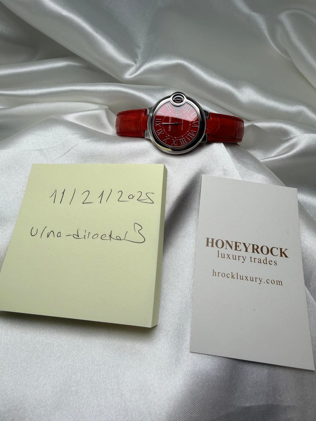 Cartier Ballon Bleu de Cartier – Limited Boutique Qatar Edition Red Dial | Ref. WSBB0022 | 33mm | Full Set Price 5950 + ship - firm- It is Rare, Red and Radiant ! Cartier elegance meets bold individuality. This 33mm Ballon Bleu features the extremely rare red sunburst dial matched with red crocodile leather straps — a configuration seen only in a handful of examples worldwide especially in this condition of the watch and the strap. The radiant crimson tone gives a contemporary edge to the timeless curves and cabochon crown that define the Ballon Bleu line. Housed in polished stainless steel with Cartier’s automatic movement, it delivers both refined femininity and mechanical reliability in one of the maison’s most collectible executions. Condition: Excellent overall, showing minimal signs of wear. Dial, case, and crystal are pristine. Includes: Complete full set with original box, papers. A rare chance to secure the 33mm red dial Ballon Bleu — a striking full-set piece priced well below incomplete market comps.