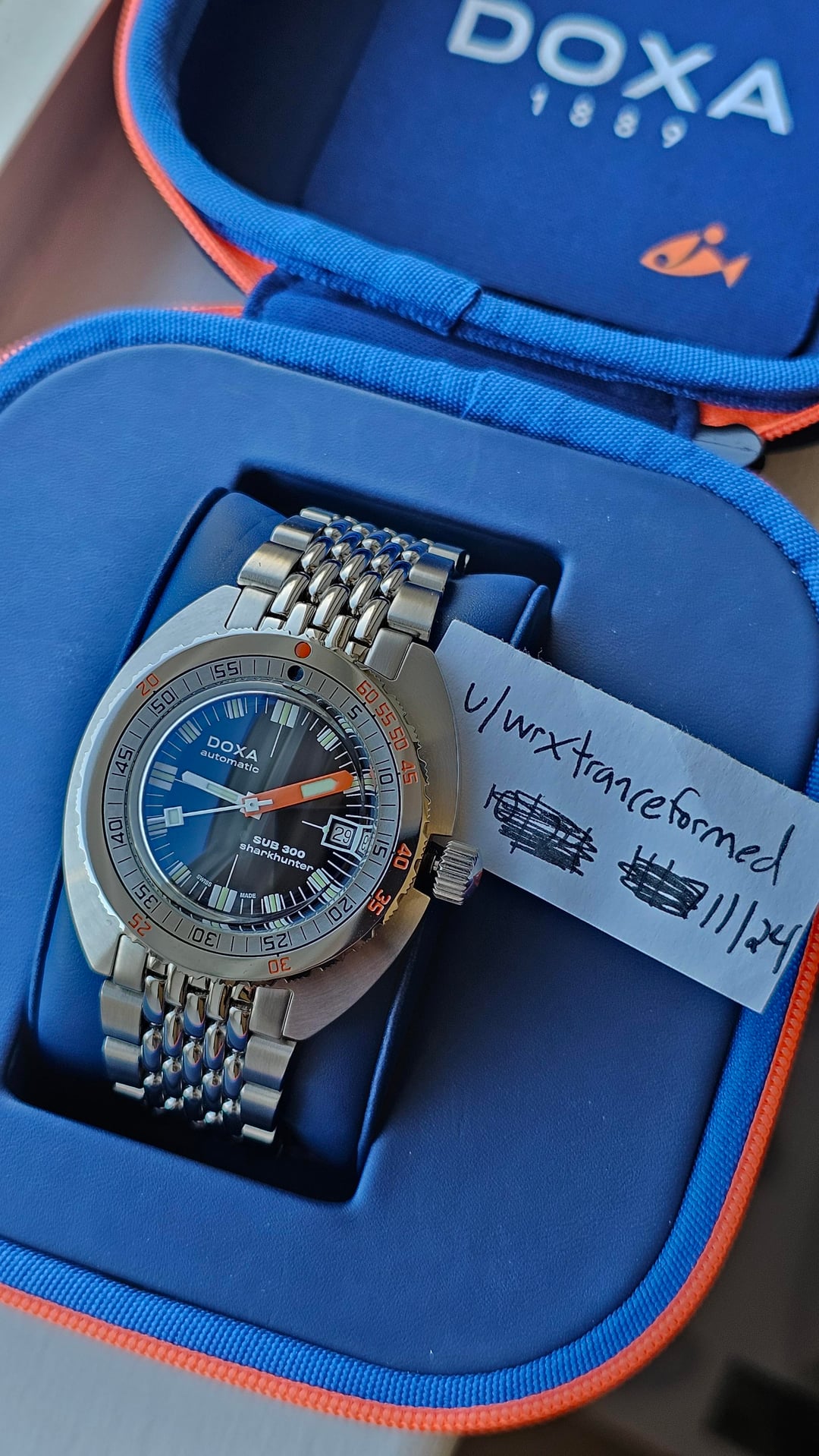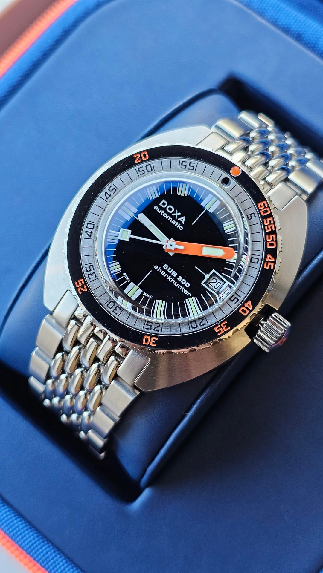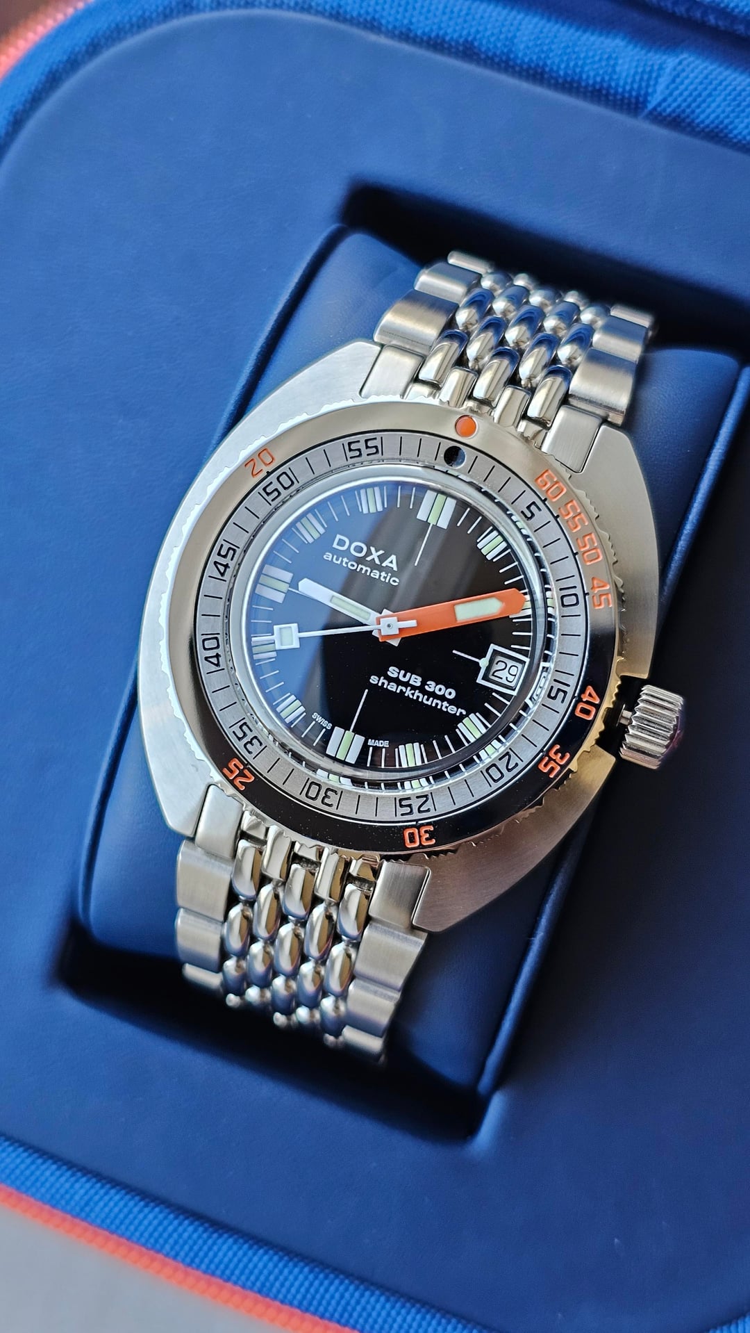 Hi crew, for sale is another example of one of my favorite modern dive watches with vintage vibes and a Reddit favorite, the Doxa Sub 300 Sharkhunter! Condition wise I would put this piece at 95%. There are no major dings or dents in the case and the crystal is flawless. The only noticeable wear on the watch is a tiny micro-ding on the bottom edge of the 9 o’clock side of the case. It is not noticeable at all on the wrist. There are super tiny hairlines in the polished surfaces that you tend to see in these but nothing immediately visible without a harsh light and loupe. The bezel is in great shape. The watch comes on its awesome OEM beads of rice bracelet with extra links. The bracelet is near mint, I cannot find any significant desk diving marks on it. This is a beautiful piece on the wrist and is running within COSC specs on my timegrapher app! The sale will include the watch on bracelet with extra links, full kit with travel case, hang tag, manual and stamped warranty card from Doxa (undated, but the previous owner purchased the watch in September 2021). Timestamp for Reddit: [https://preview.redd.it/wts-doxa-sub-300-sharkhunter-v0-r2yoiw07t93g1.jpg?width=1080&crop=smart&auto=webp&s=fad88d8dbe183ab2ea1dd05acc3ee67cd8ab20c7](https://preview.redd.it/wts-doxa-sub-300-sharkhunter-v0-r2yoiw07t93g1.jpg?width=1080&crop=smart&auto=webp&s=fad88d8dbe183ab2ea1dd05acc3ee67cd8ab20c7) I am asking $1,800 net to me, including fully insured shipping in the US. Not interested in trades at this time, trade offers will be ignored. Please message me with any questions or interest and thanks for looking!