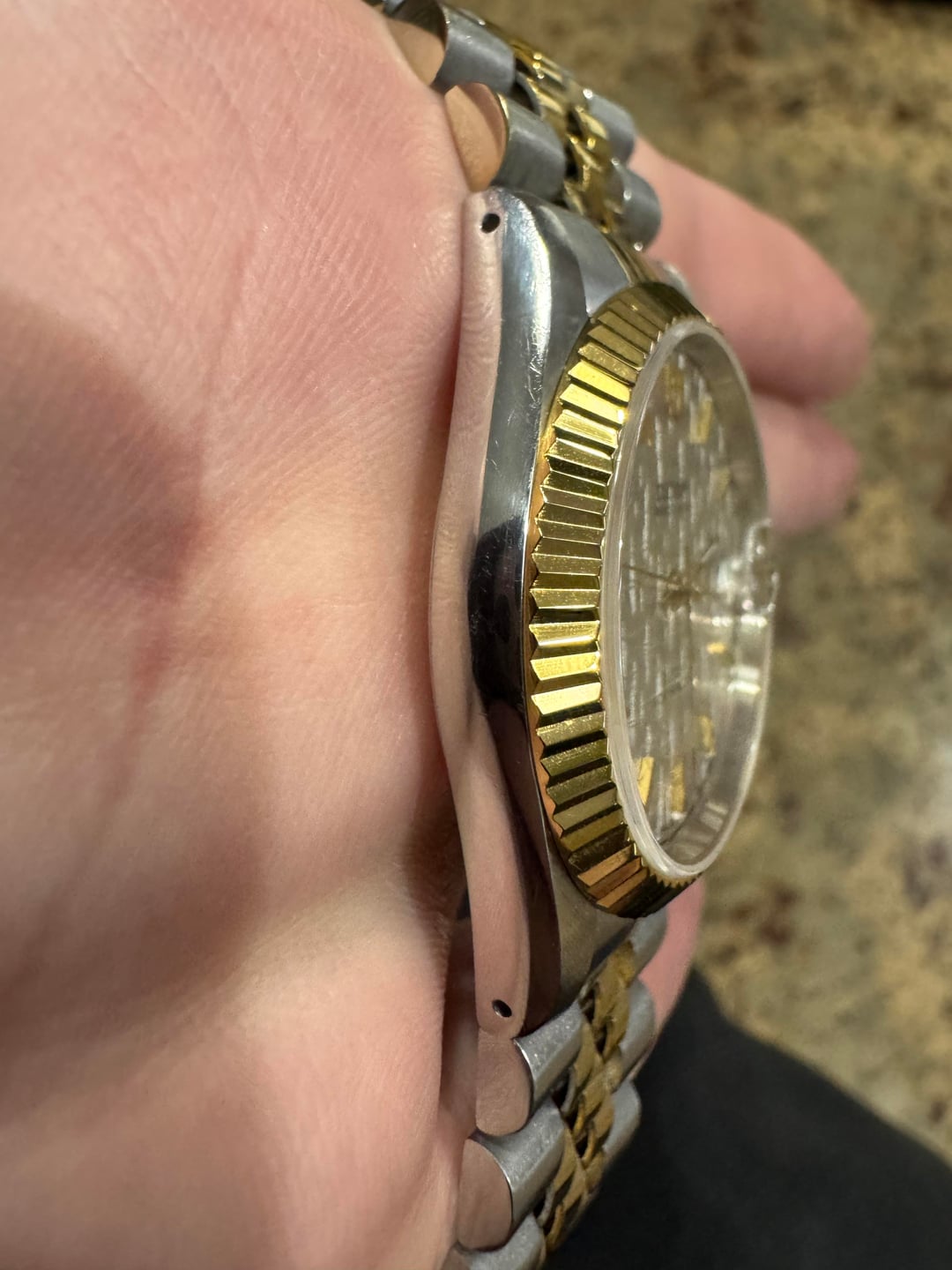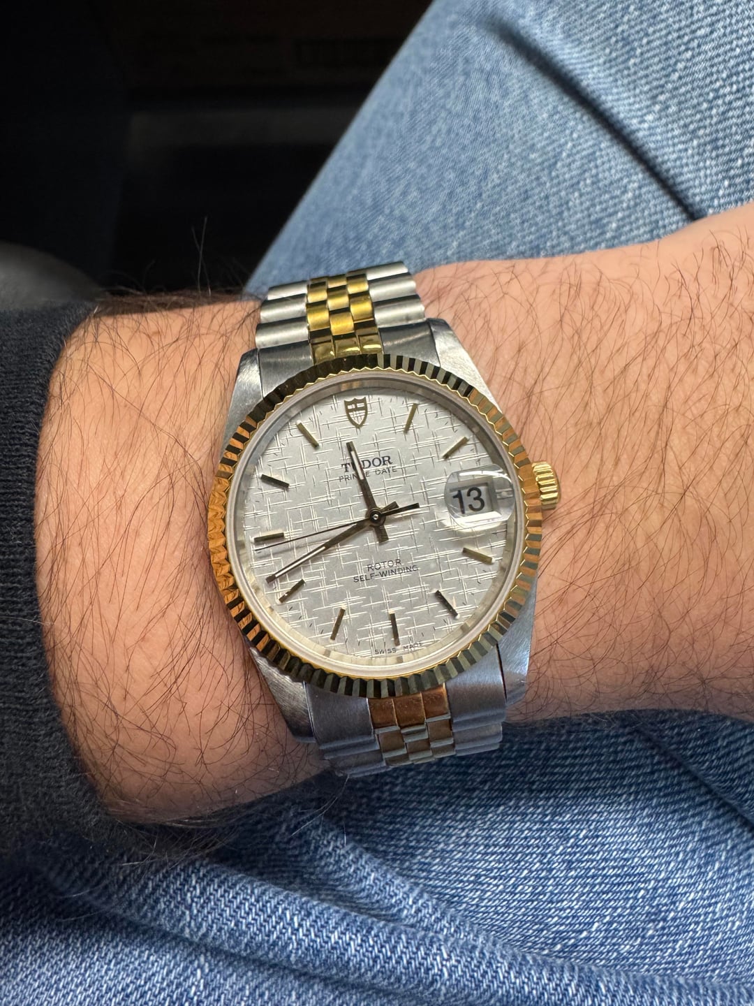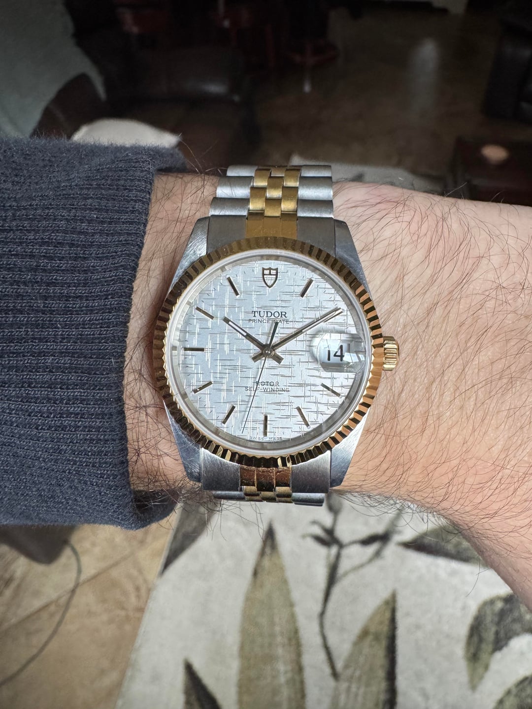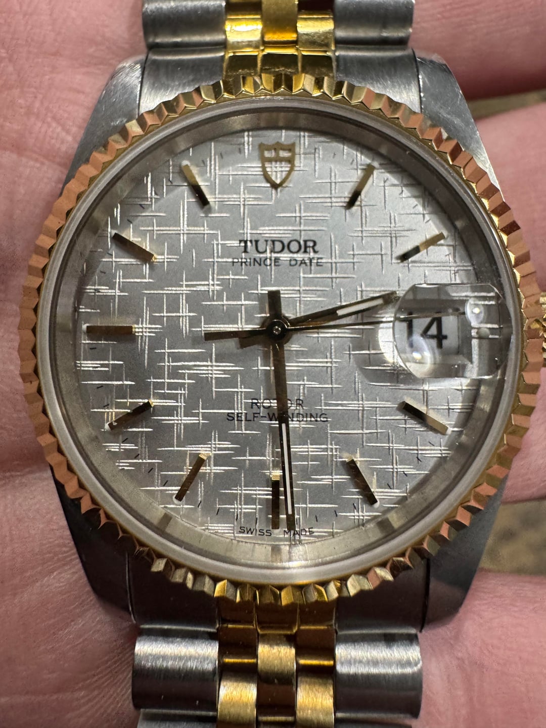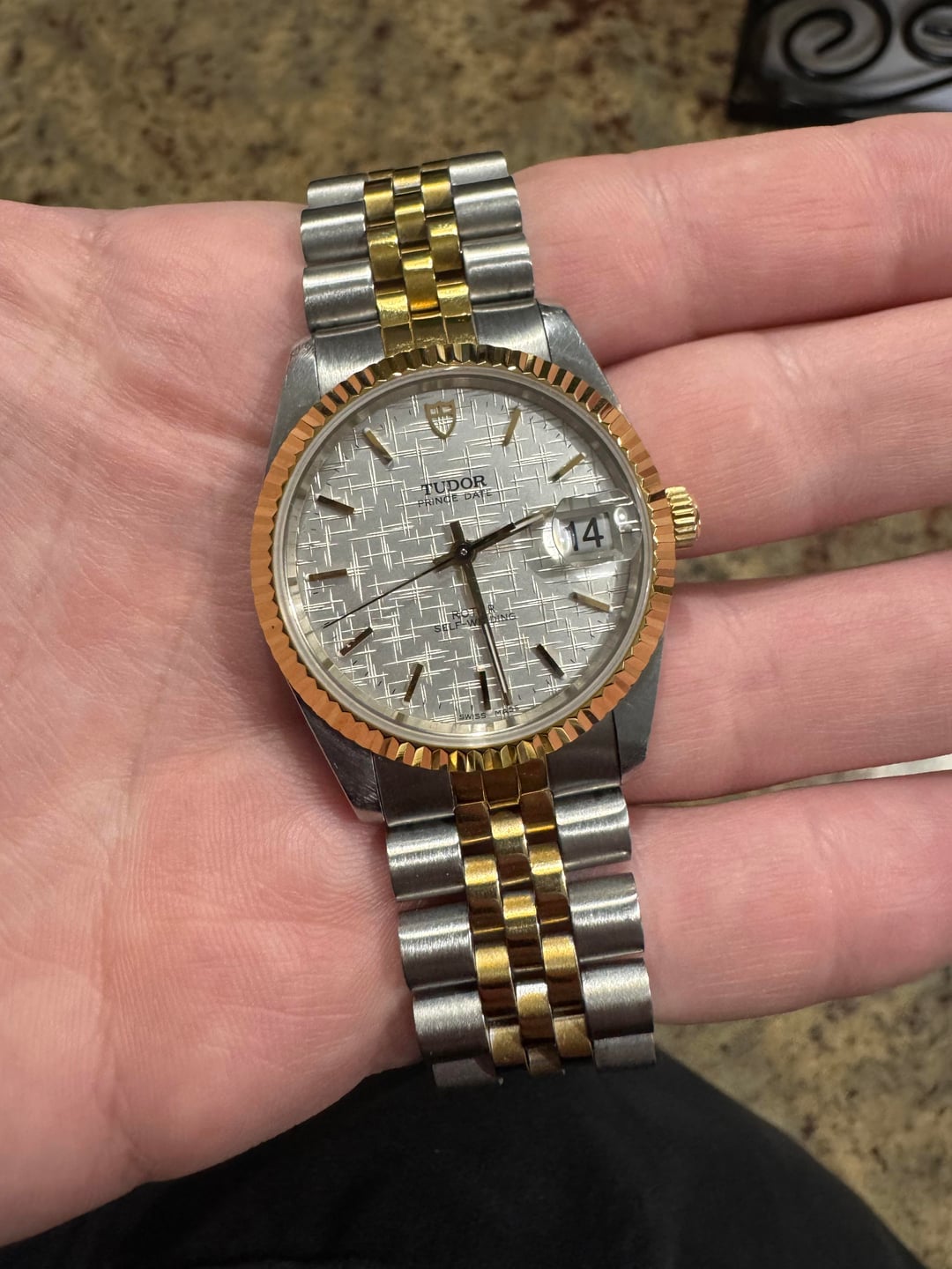 Up for sale is a **Tudor Prince Date ref. 74033**, a timeless two-tone classic featuring the elegant **white linen dial**. This reference embodies the vintage Rolex Datejust aesthetic that Tudor shared during the era, with the same Oyster-style case, fluted bezel, and reliable automatic movement — but at a fraction of the price. **Details:** * **Reference:** 74033 * **Case:** Stainless steel with 14k yellow gold fluted bezel (34mm) * **Dial:** White linen texture — beautifully catches the light, all original * **Movement:** Tudor-signed ETA 2824-2 automatic (self-winding, 25 jewels) * **Bracelet:** Rolex Stamped two-tone Jubilee bracelet, correct 455B endlinks * **Crown:** Tudor shield signed, gold * **Caseback:** “Montres Tudor SA Geneva-Switzerland,” marked 8090 * **Condition:** Excellent vintage condition overall. Sharp bezel, strong case lines, and a clean dial with rich texture. Light wear consistent with age. * **Service:** Recently serviced; running smoothly and keeping good time. Over 300 amplitude, See my post on [r/Tudor](https://www.reddit.com/r/Tudor/) * **Included:** Watch only. **Notes:** The **linen dial** variant adds refinement and depth — it’s one of the most desirable dials from this era, giving off subtle vintage elegance while remaining versatile enough for daily wear. A perfect entry point into vintage Tudor with timeless two-tone style. **Timestamp:** [**https://imgur.com/a/bep8CEJ**](https://imgur.com/a/bep8CEJ) **Price:** **$1,100 USD** **Payment:** PayPal F&F, Zelle, or Venmo. **Location:** NJ, USA.