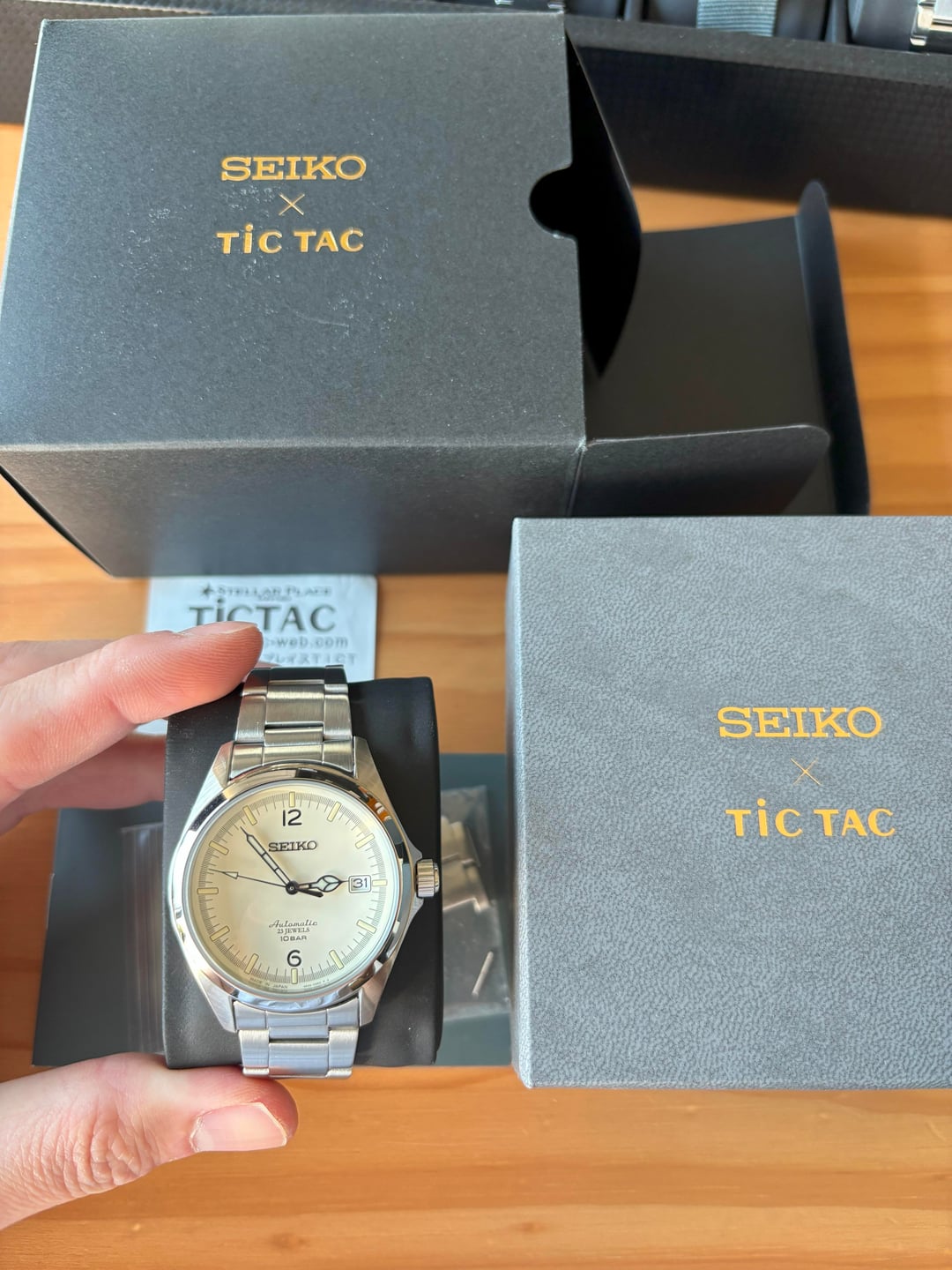 Please see the details below. I am the original owner and purchased directly from the TiCTAC store in Sapporo. Model: Seiko JDM TiCTAC 40th Anniversary Limited Edition Color: Ivory Reference Number: SZSB032 Specs: * Case Size: 40mm * Automatic Caliber: 4R35 * Power Reserve: \~ 41 hours * Accuracy: +45 to -35 seconds per day * Lug width: 20mm * Crystal: Hardlex * Water Resistance 10bar Purchase Year: Dec 2024 Purchase History: TiCTAC retailer Includes: Full Kit (box, papers, full links) Condition: : 9.5 / 10; Do not see any blemishes on the watch. Very minor marks on lugs from occasional strap changes. **Asking Price: $540 + shipping.** **No Trades** **Shipping CONUS only** **Local Pick Up OK**