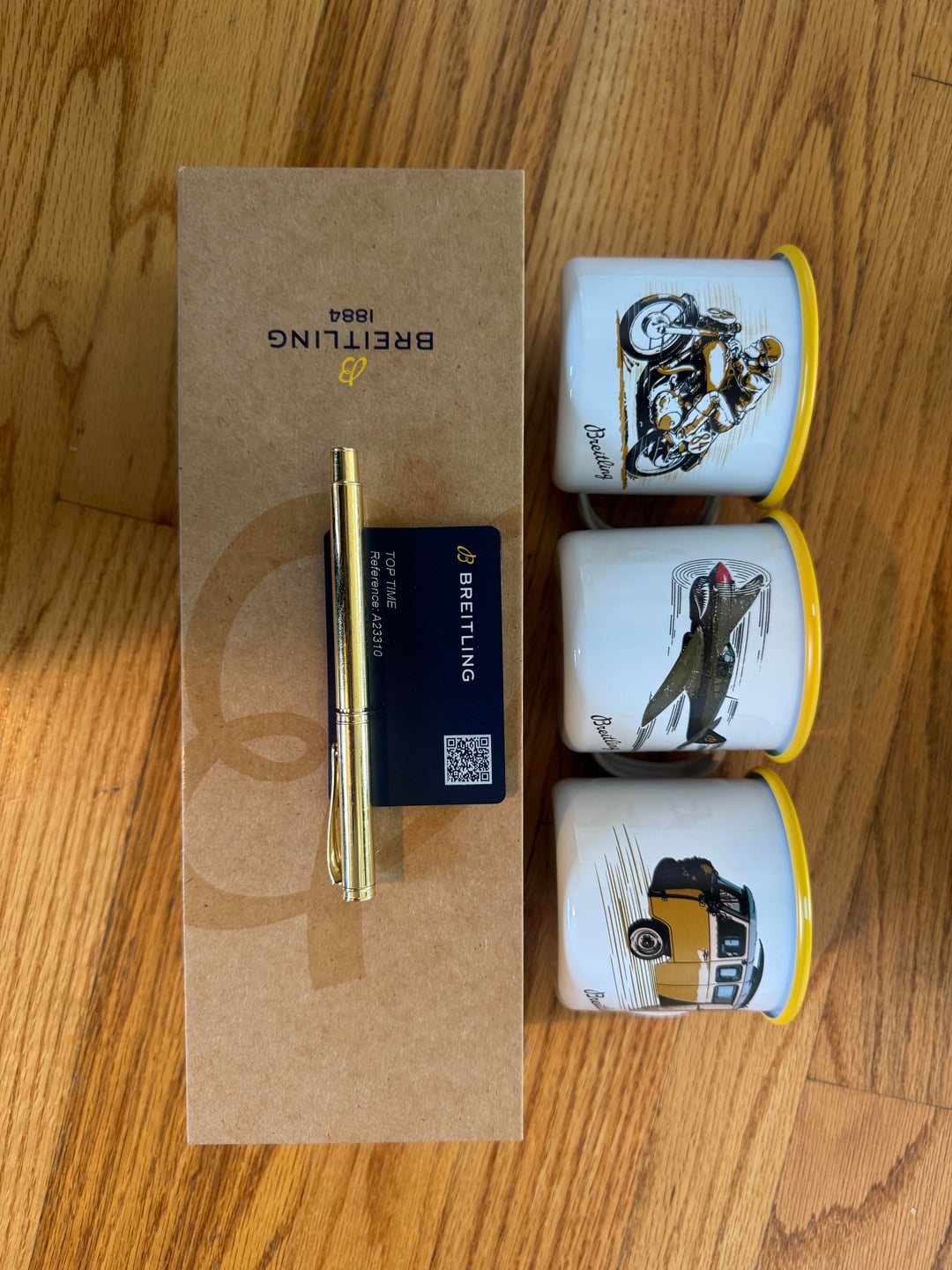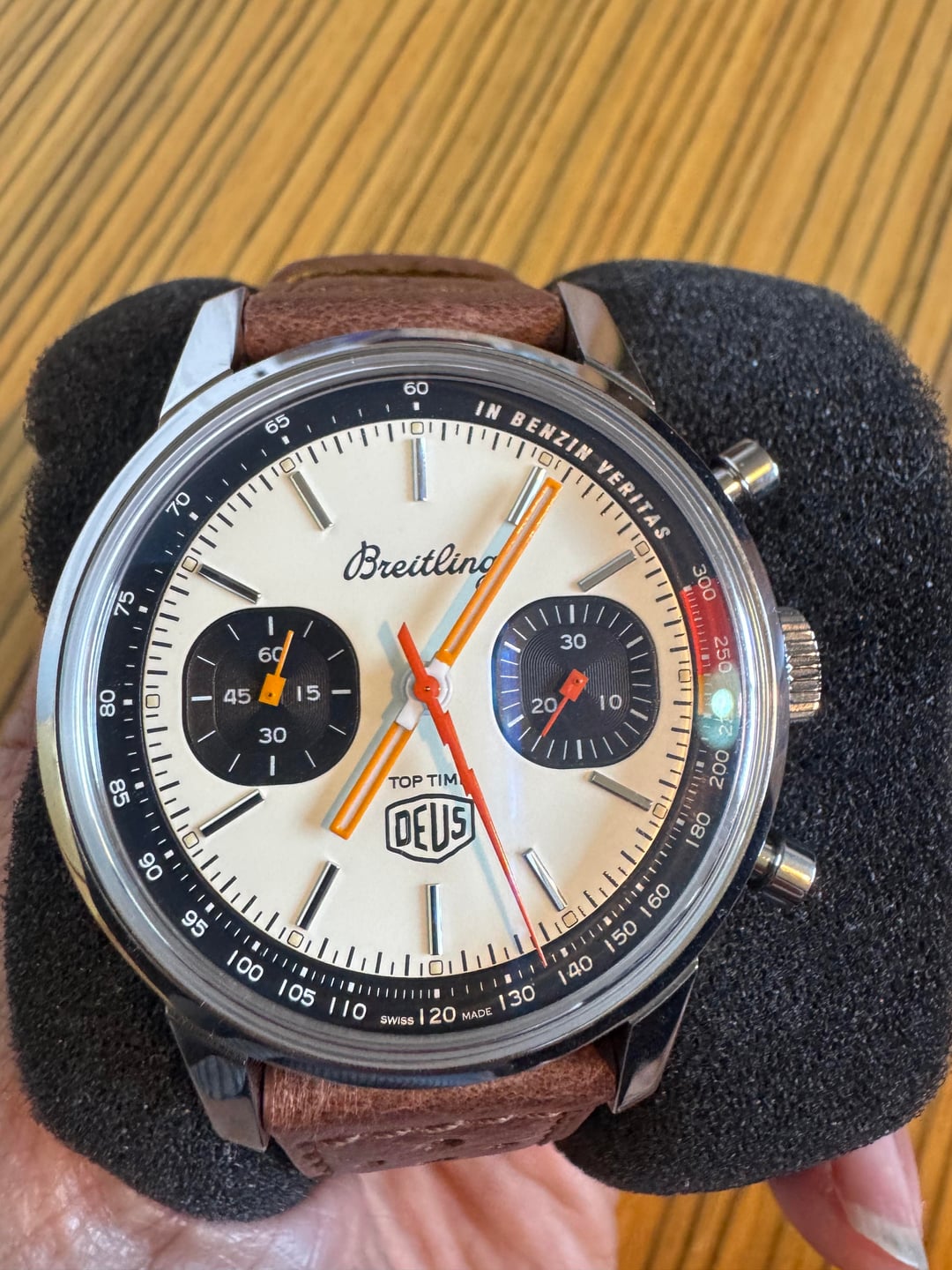 Hello Shiney Thing Chasers! Breitling A233101A1A1X1 [https://www.breitling.com/us-en/watches/top-time/top-time-cal23/A233101A1A1X1/?srsltid=AfmBOopI1PUL-20iO\_suEMtNyeX6pxFCfrRt1ECErlPqTmKEDfnaOb6o](https://www.breitling.com/us-en/watches/top-time/top-time-cal23/A233101A1A1X1/?srsltid=AfmBOopI1PUL-20iO_suEMtNyeX6pxFCfrRt1ECErlPqTmKEDfnaOb6o) Location: Bay Area, CA I'm new to the 'exchange, but can meet at a Breitling Boutique location to validate the watch or ID it remotely for you if that helps! For right now, I'd like to only ship within the continental US. Price: $6200 shipped (firm); Accept Zelle or Wire. (Includes insurance.) || || |**Movement**|Automatic| || || |**Case diameter**|41 mm| Trades: I'm not in the market for anything, but to keep the thread spicy feel free to share a vintage chrono that is burning a hole in your pocket. I only wore the watch honestly once, and then put it away after I bought it from the boutique in San Diego, CA in March of 2021. I have a very dainty wrist, and honestly thought I'd "bulk up" during the pandemic, yet I still am the same frail man. This includes the original receipt, warranty card, leather watch case, a clear plexiglass case, and 3 steel mugs from the boutique. At the time, the boutique could't locate the branded deus ex machina book. Feel free to send me a DM if you would like additional images (back, front, etc.)