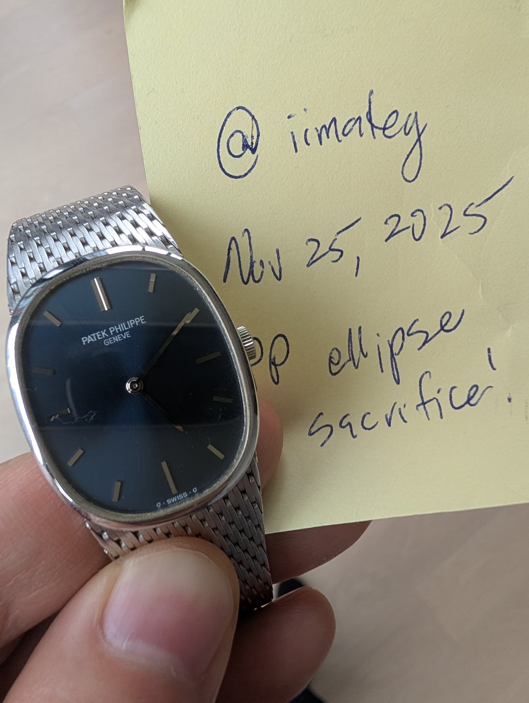 Hello all - selling this Patek Ellipse. Running great and description from the dealer I bought it from in 2024: A striking Patek Philippe Ellipse ref. 3748 in 18K white gold with a sky blue sunburst sigma dial and Milanese integrated bracelet. The Ellipse is one of the most famous iterations of dress watches from not just the house of Patek Philippe, but across the entire canon of horology. It is primarily found on a leather strap and more often in yellow gold. This rarer example is a treat to behold in white gold with a blue sigma dial, which shifts its hue depending on its mood and angle. Measuring 7.25 inches in length, its 32x28mm case wears larger than its dimensions suggest. It’s manual wind caliber is running well and keeping accurate time." I am about to trade it in for $7k 😱 which is a sacrifice so I thought to stop by here in case anyone wants a deal. A steal in fact. Looking for 8.5k. I paid 10,500. Comps are $15k+ [https://www.chrono24.com/search/index.htm?dosearch=true&query=patek+3748](https://www.chrono24.com/search/index.htm?dosearch=true&query=patek+3748) I am trading it in this week. Would prefer to meet in person in NYC. Willing to entertain offers that make it low friction for me. Payment can be cash, crypto, wire. Thanks! Happy hunting! Feel free to contact me with any questions. Happy to do a facetime, etc. cheers