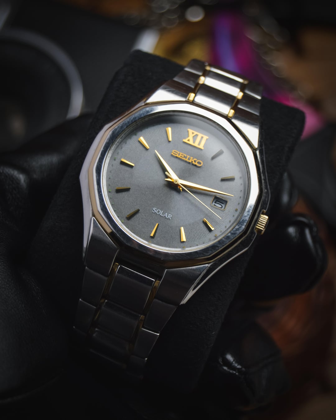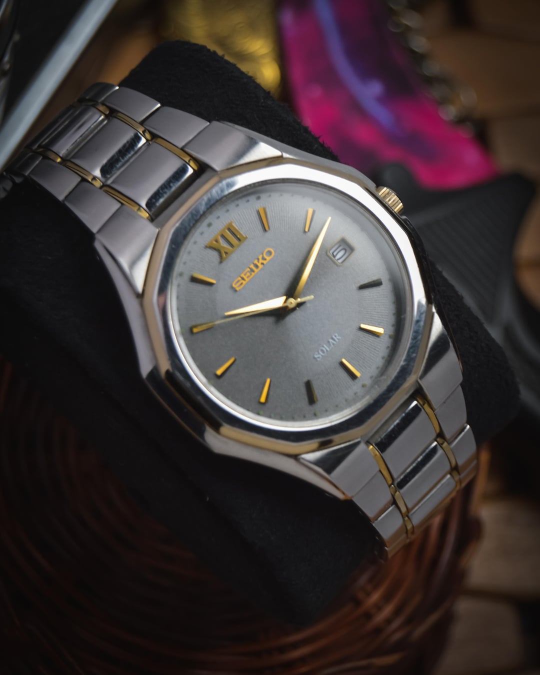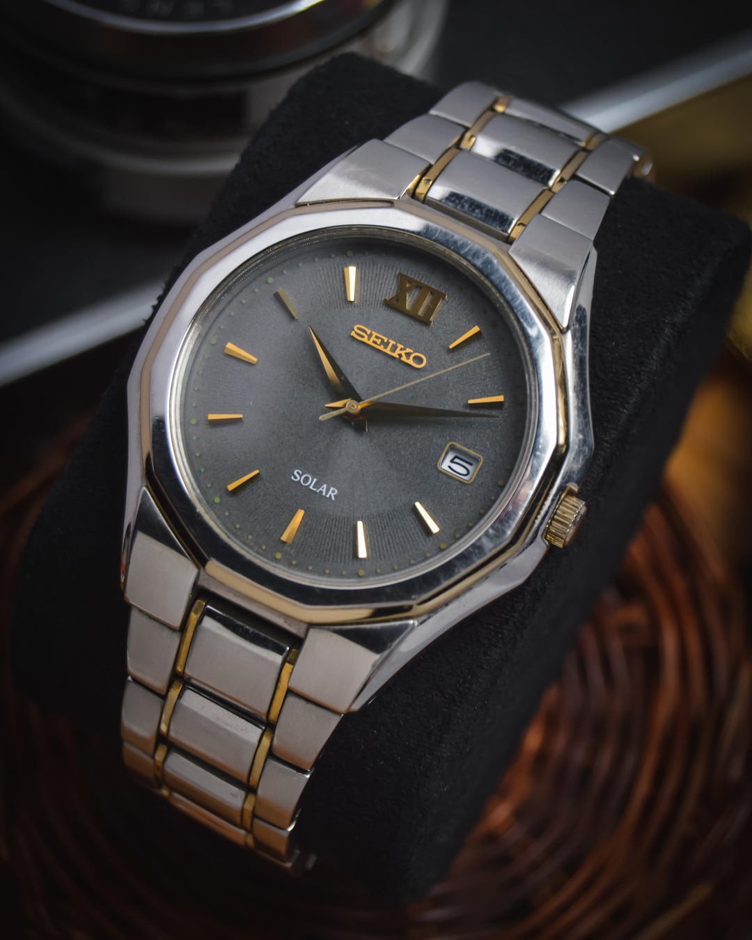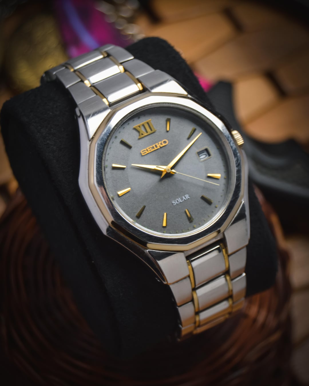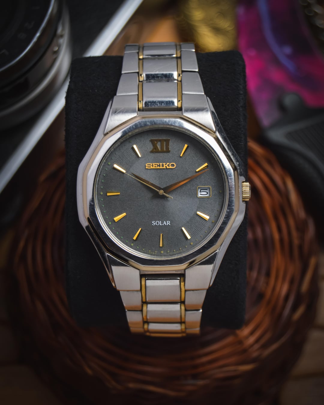 [Timestamp](https://postimg.cc/ygxSmht8) Hey Watchexchange! Seiko has always been a master of crafting everyday watches that strike the perfect balance between style, function, and reliability. This **Seiko Solar SNE166** is a fantastic example. Its two-tone case and bracelet bring a refined touch, while the dial really steals the show. The face features a **rich slate-gray dial** (not a sunburst one — mistakenly written in the title, which I can’t edit). Applied gold-tone baton indices mark the hours, while **dauphine hands** deliver sharp clarity and elegance. At 12 o’clock, a bold Roman numeral **XII** adds classic refinement, complemented by a framed date window at 3 o’clock and a clean minute track around the perimeter. Understated yet elevated, it wears with effortless versatility — casual, business, or dressy. Crafted from **stainless steel with gold-tone accents**, the case and bracelet strike the right balance of shine and subtlety. Topping it off is **Seiko’s Hardlex crystal**, with a solid caseback beneath. Inside ticks the **solar-powered Cal. V157 quartz movement**, freshly fitted with a **new capacitor**, ensuring reliable and eco-friendly performance. 🔹 **Dimensions** • Case Diameter: 42mm • Lug-to-Lug: 48mm • Thickness: 10mm • Band Width: 18mm 💵 **Price:** $145 shipped 🚢 **Shipping:** UPS (Worldwide) 📦 **Payment:** PayPal F&F, PayPal G&S (+4.5% fee paid by buyer), or **bank wire (US banks accepted)** 📩 DM me for more pics or a custom timestamp. If you’re after a sleek, eco-friendly daily wearer with a classic two-tone finish, the **SNE166** is a perfect choice. Follow my **Instagram** through the link in my **Reddit** **profile** to see more of my collection and upcoming listings.