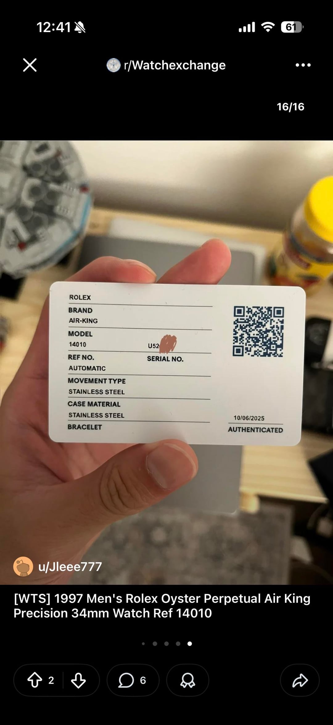 Hi, this is my first post on here. I’m selling a previously owned 1997 Men's Rolex Oyster Perpetual Air King Precision watch reference 14010. This vintage timepiece has an amazing rose gold/salmon dial and a mix of bar and Roman numeral incides. There is some light surface marks around the lug and bezel. The crystal, dial, and hands are nice and clean. It weighs 90.6g and fits a max wrist size of 6.25 inches. Keeps and runs good time. This watch comes only with an eBay authentication card (pictured) and eBay box. Asking $3700 shipped CONUS! Because this is my first post, I accept PayPal goods and services, PayPal f&f (+3.5%), and Zelle.