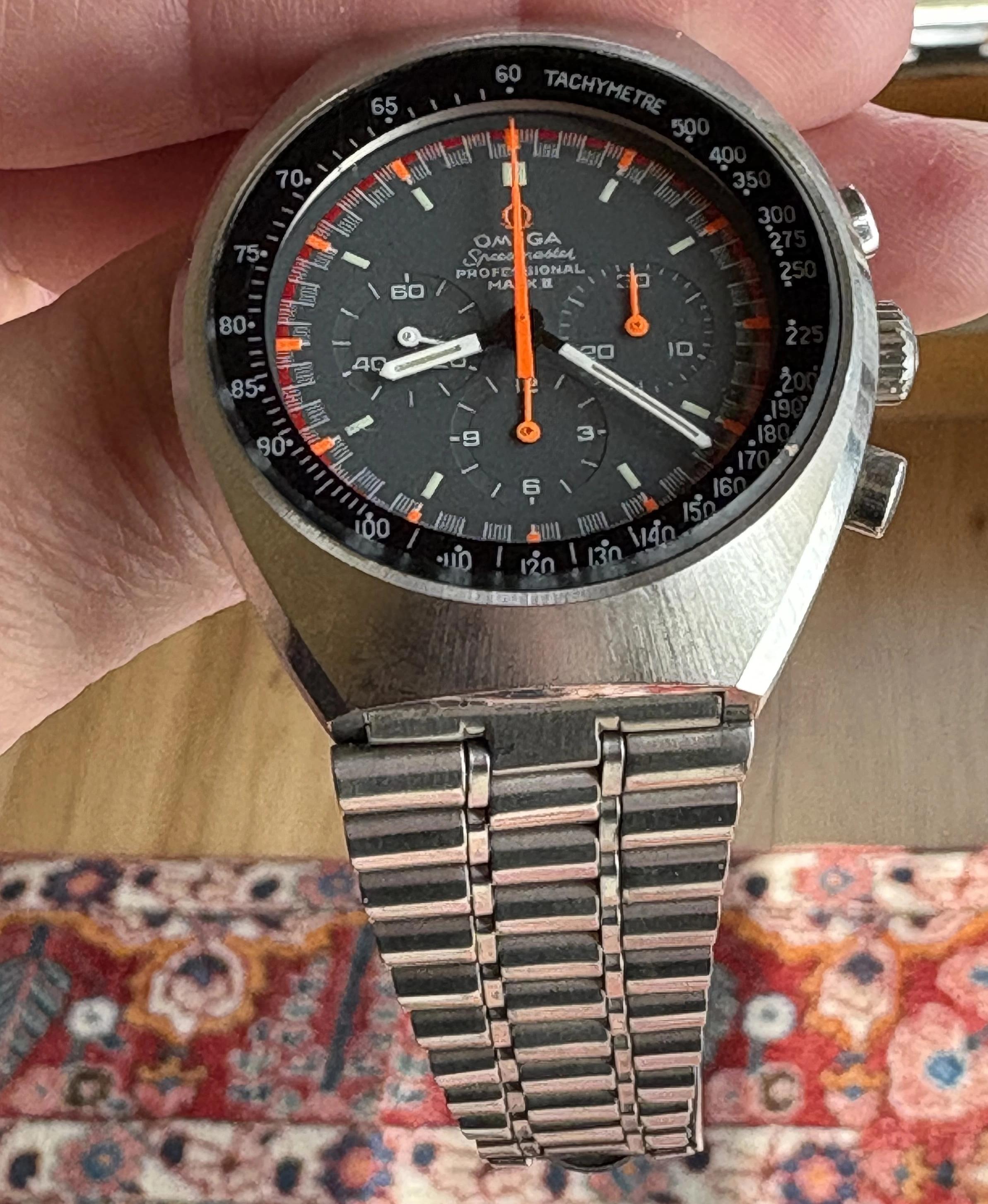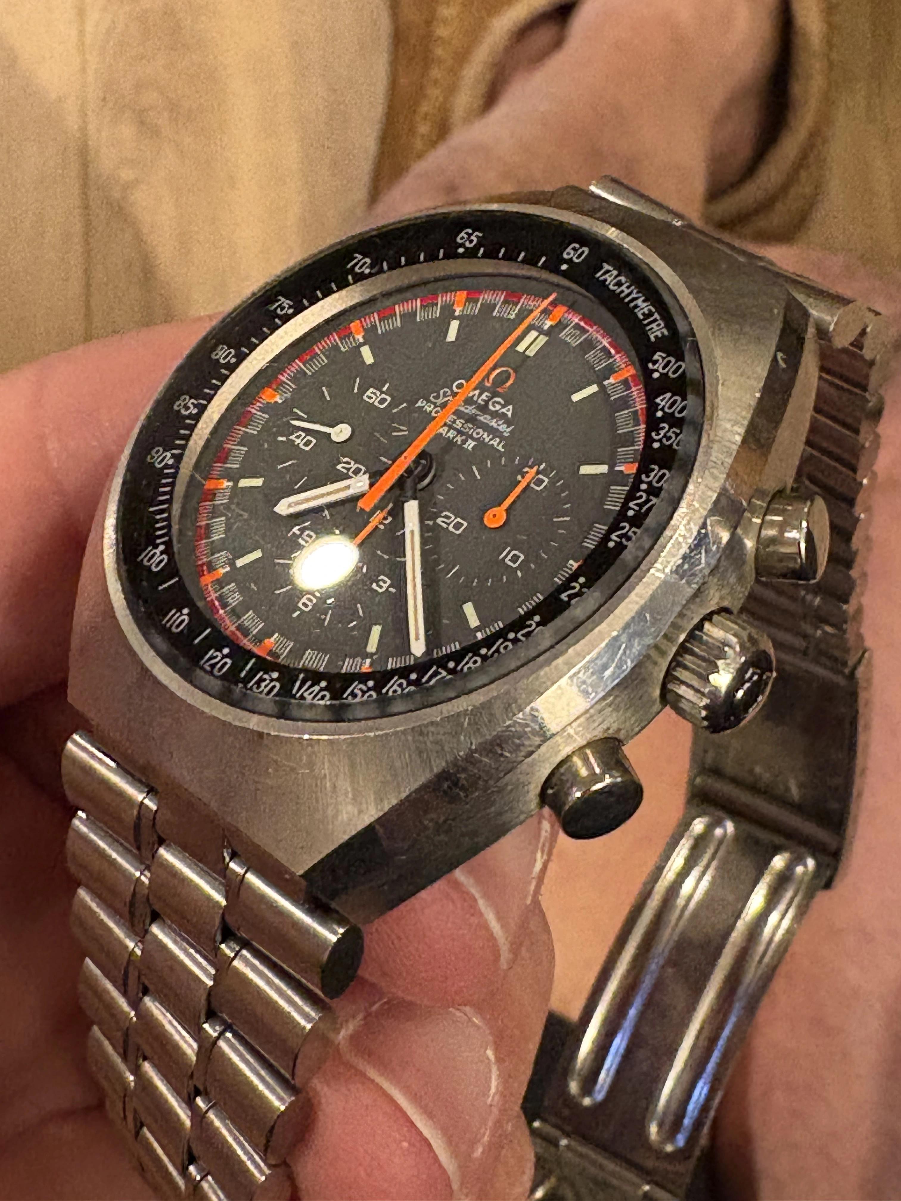 Nice honest Mk II Speedmaster 145.014 with racing dial. Notably, the dial and handset retain their vivid colors. The case shows some wear, but exhibits original finishes and sharp edges. Comes with original 21-link 1159 bracelet. This is a catch and release from a lot that I purchased locally from someone who had inherited a collection from a friend, and the condition of all the watches were similar - the owner clearly wore his watches, but maintained them and did not tamper with or polish them.