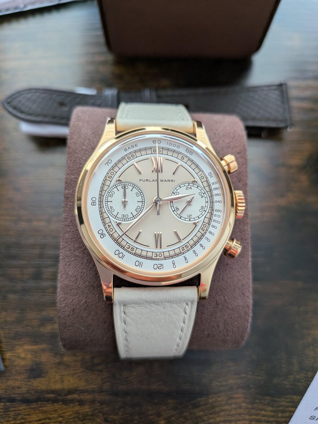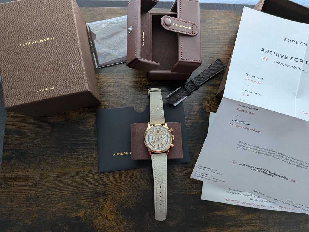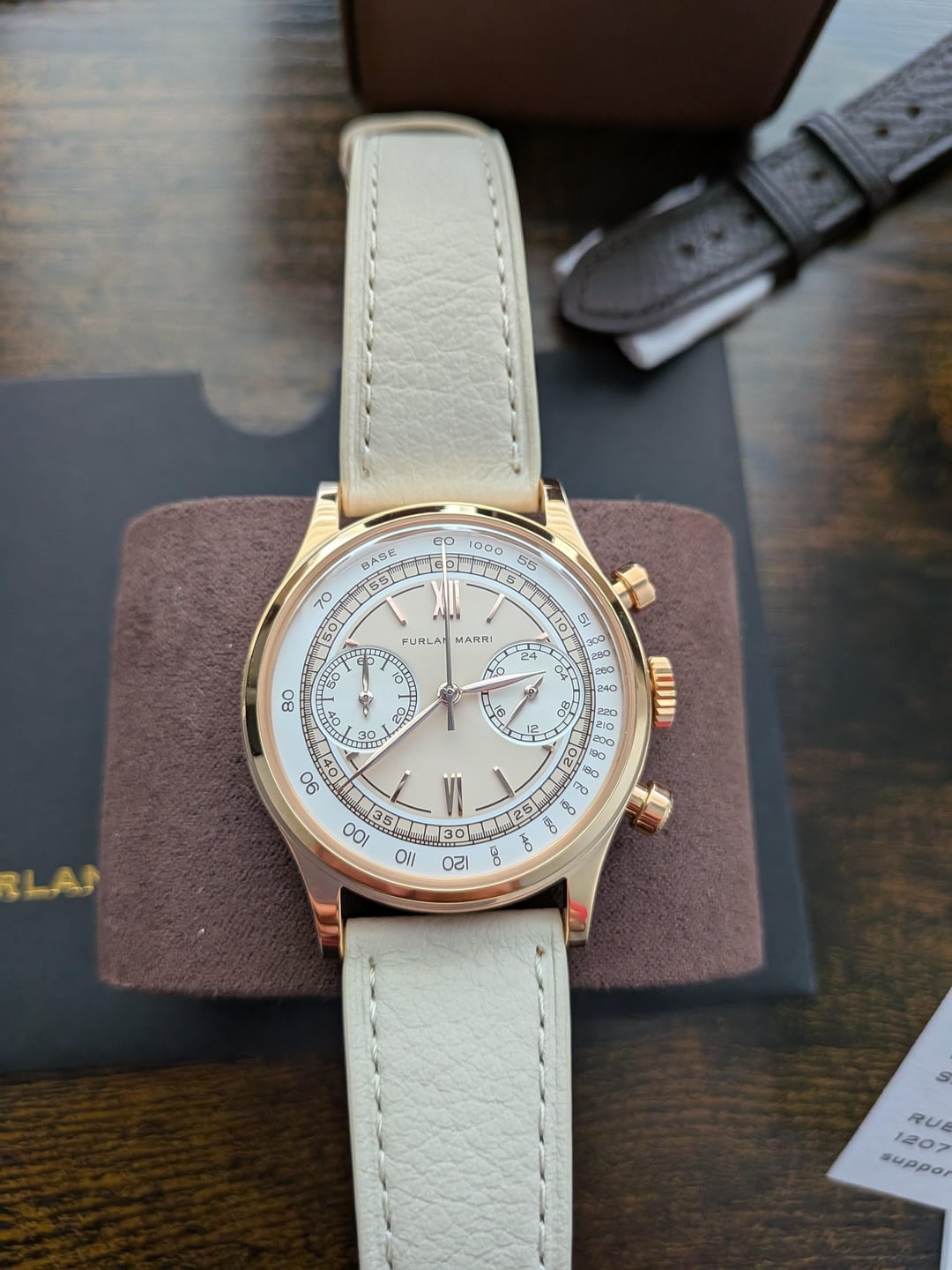 For Sale: **Brand New Furlan Marri Sabbia Rosa NEVER WORN 38mm Full Set Box and Papers, 2 leather straps Beige and Brown** Brand New 2025 Never Worn Straps: Furlan Marri Beige Leather and Furlan Marri Brown Leather Diameter: 38mm Movement: Seiko VK64 Mechaquartz Chronograph Height: 11.5mm Lug Width: 20mm Lug to Lug: 46mm Water Resistance: 50m **$1400** Shipped (CONUS). Ships from Texas. International Shipping on your label. Glad to do a FaceTime/video call or provide more photos if needed. Accept Zelle, Venmo, PayPal (Buyer pays fees). For Sale Only. No trades.