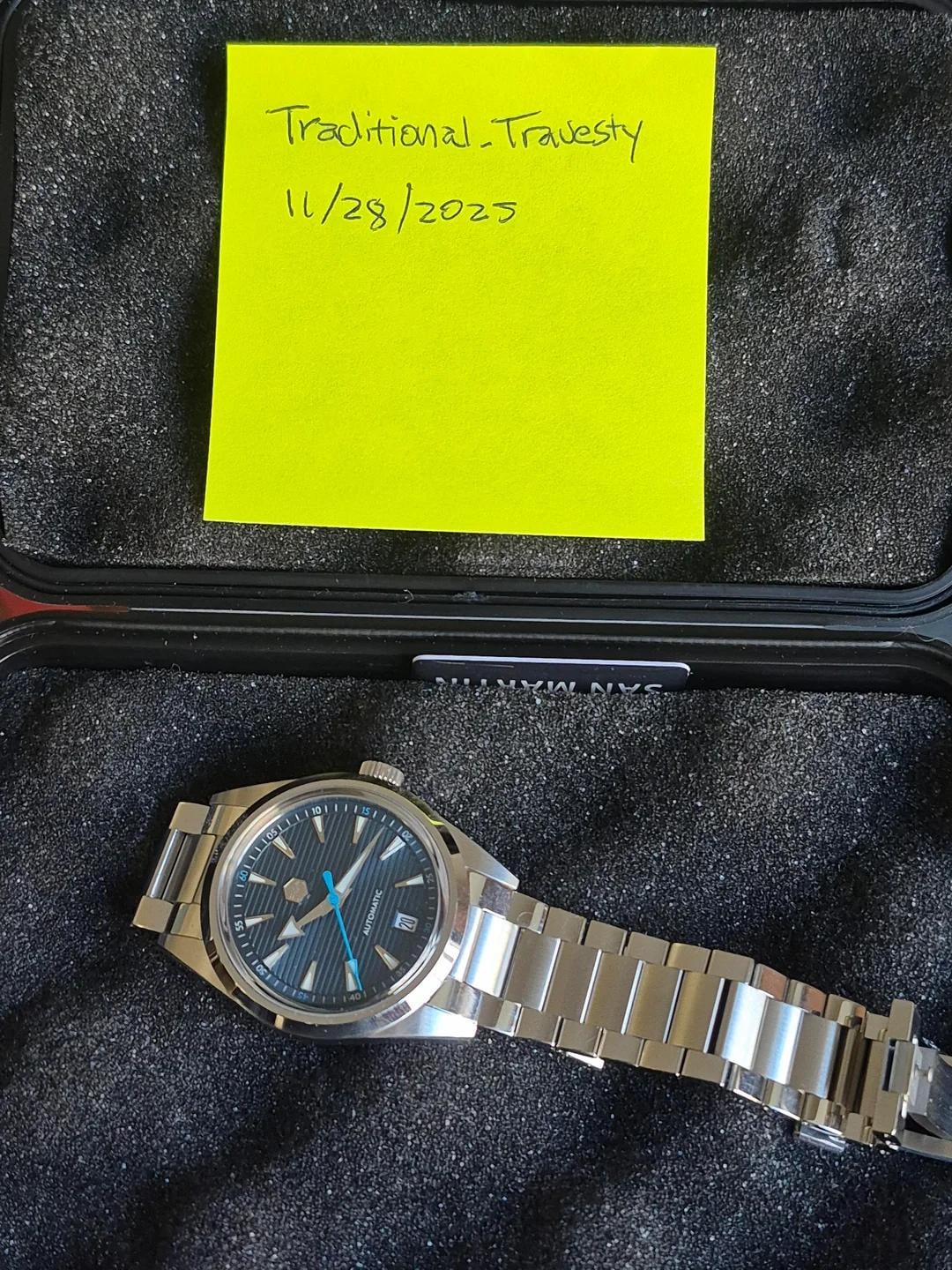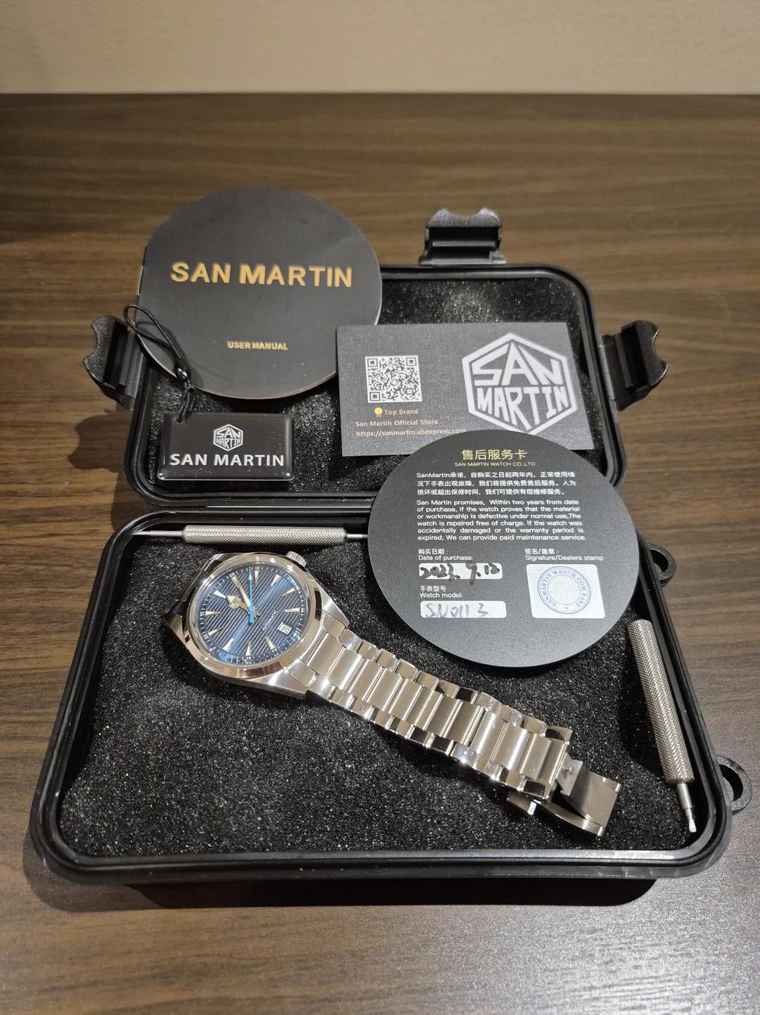 For sale is a gifted SM SN0113w v1 homaging Omega's Aqua Terra. The finishing and quality appears to be more in line with San Martin than Watchdives at the time. Please keep in mind this is the version 1 which comes with different case proportions and polished outer links as well as a butterfly clasp. Purchased in September of 2023 and still running great. 38mm case width 20mm lug width 47mm lug to lug Screw-down crown NH35 Asking $110 including shipping CONUS only. Condition is fair to good with light to moderate signs of wear. Apologies for the handwatch gaffe