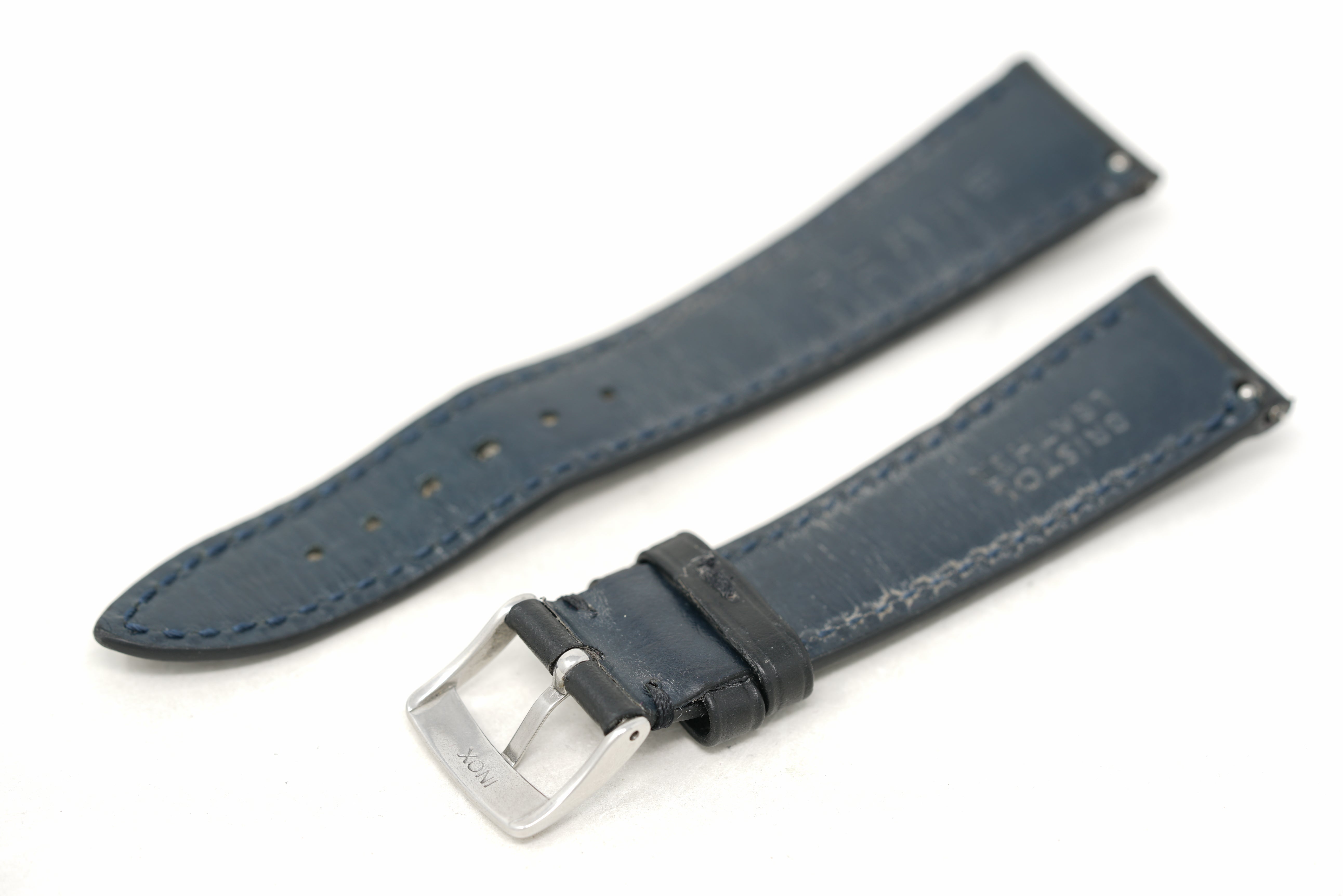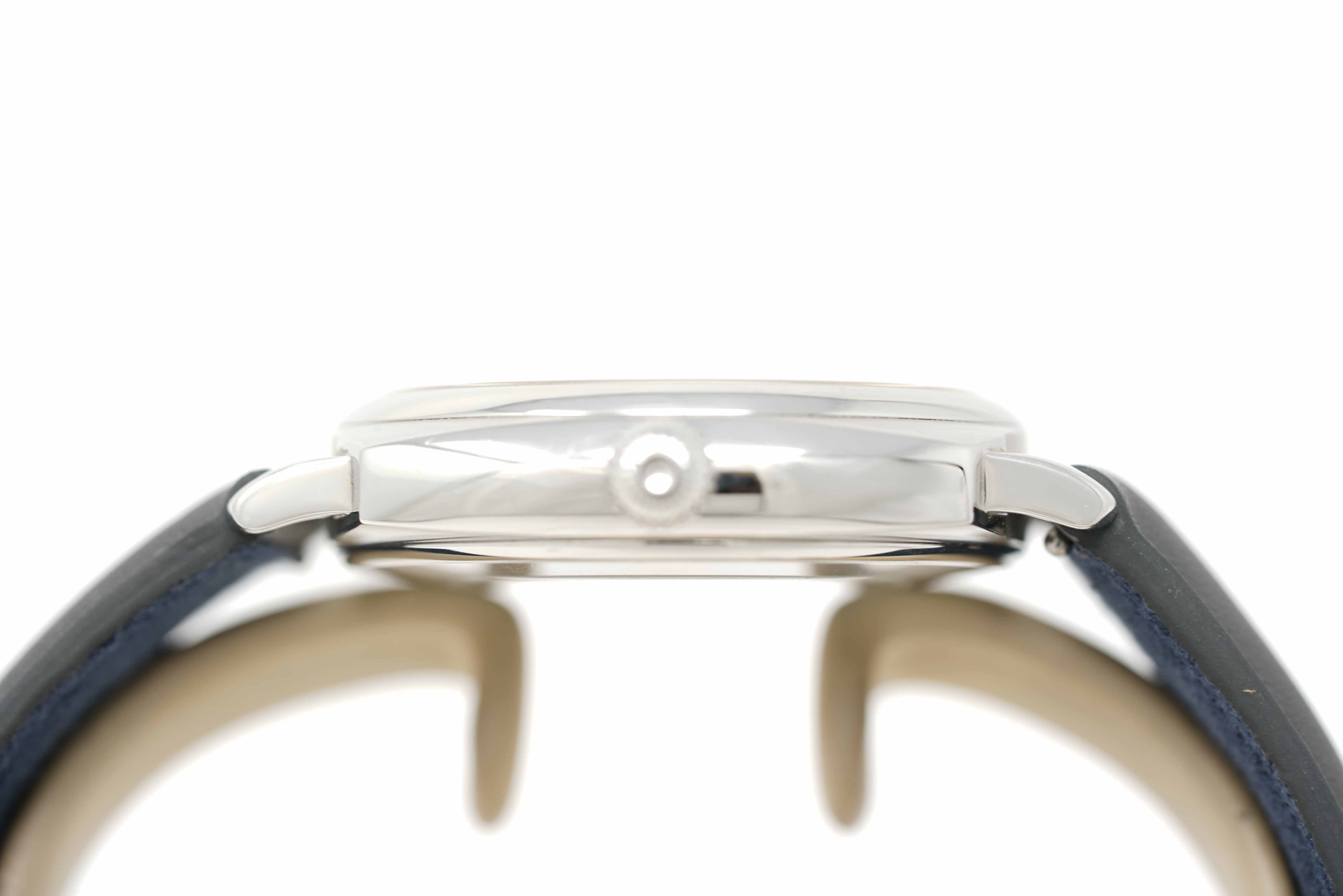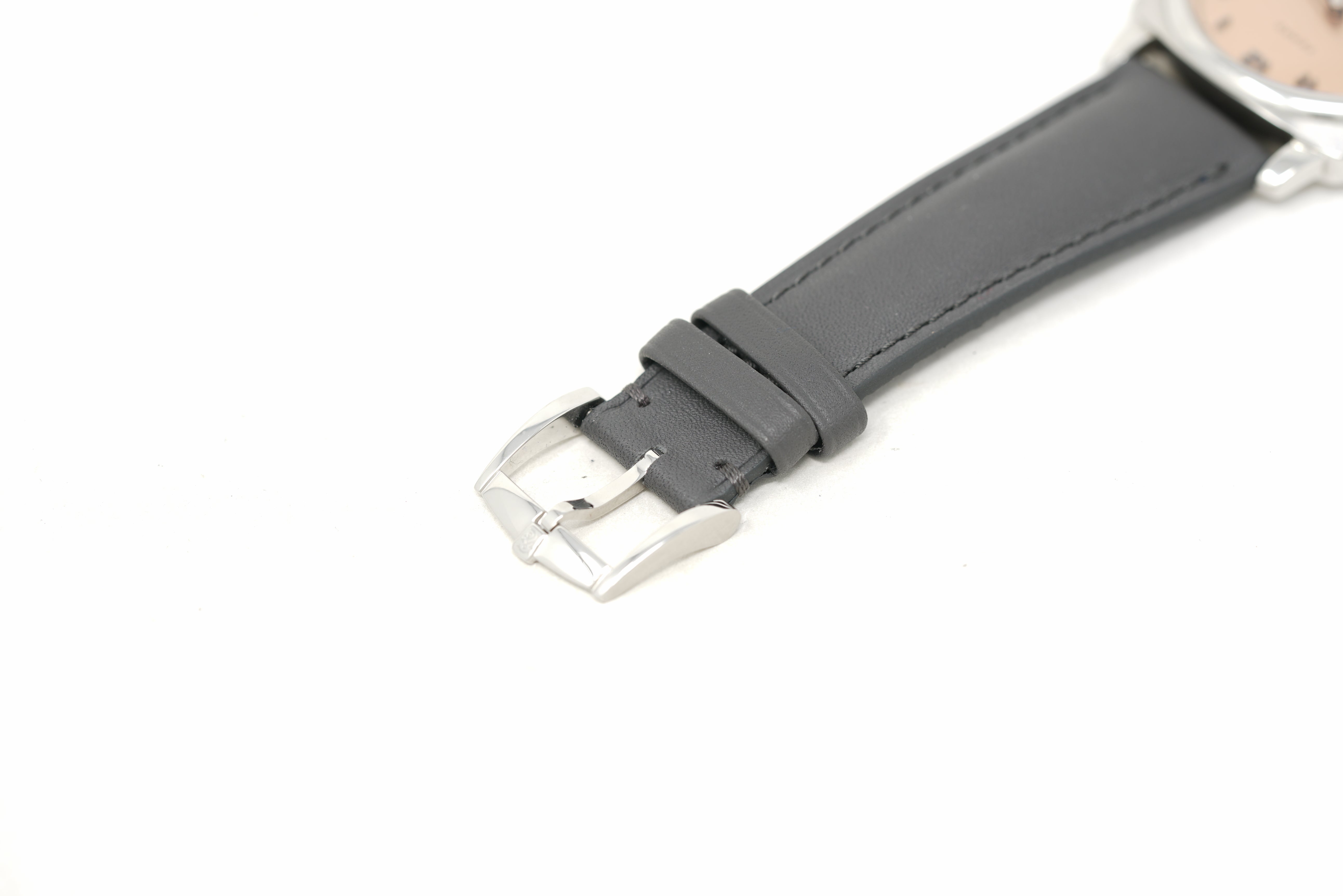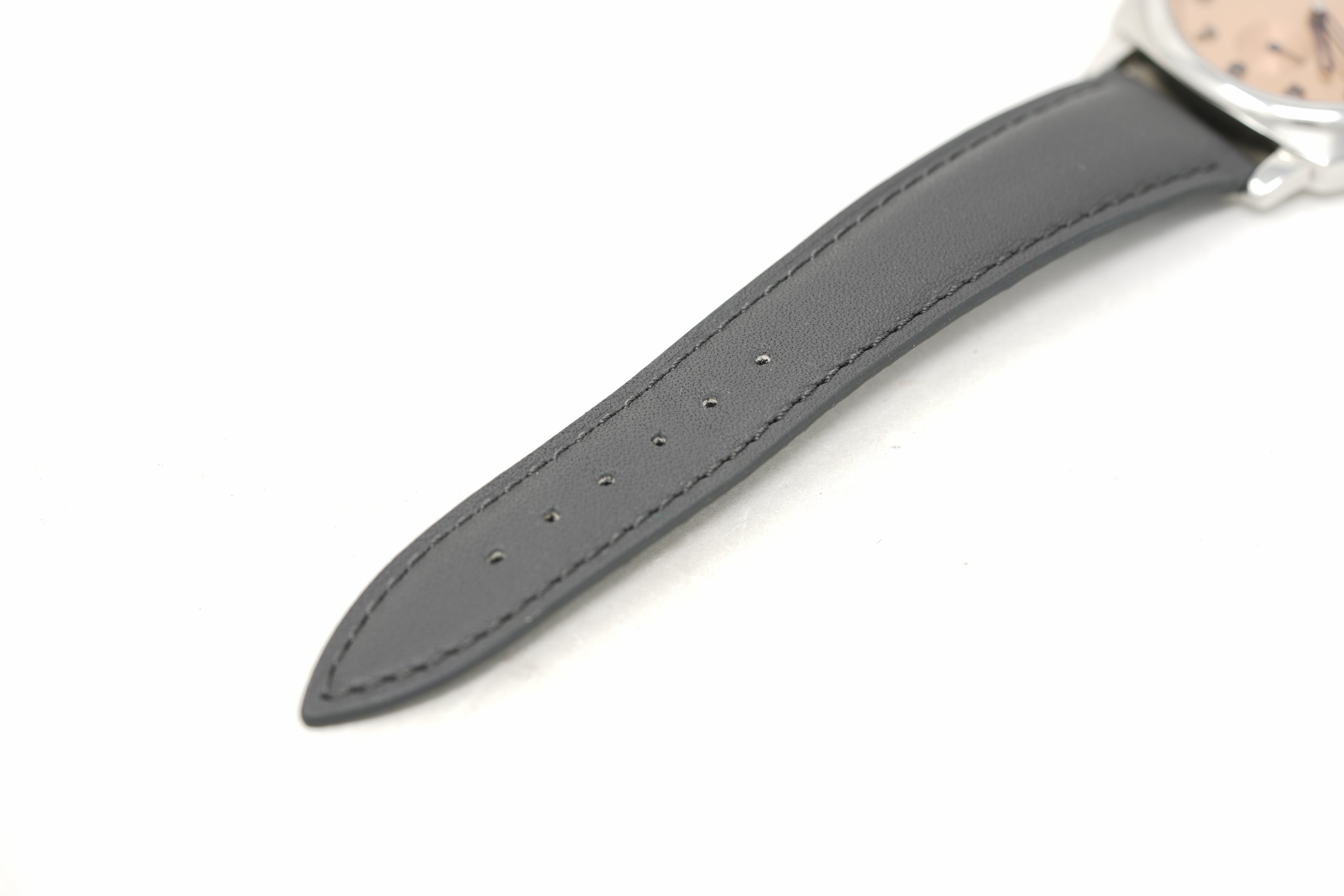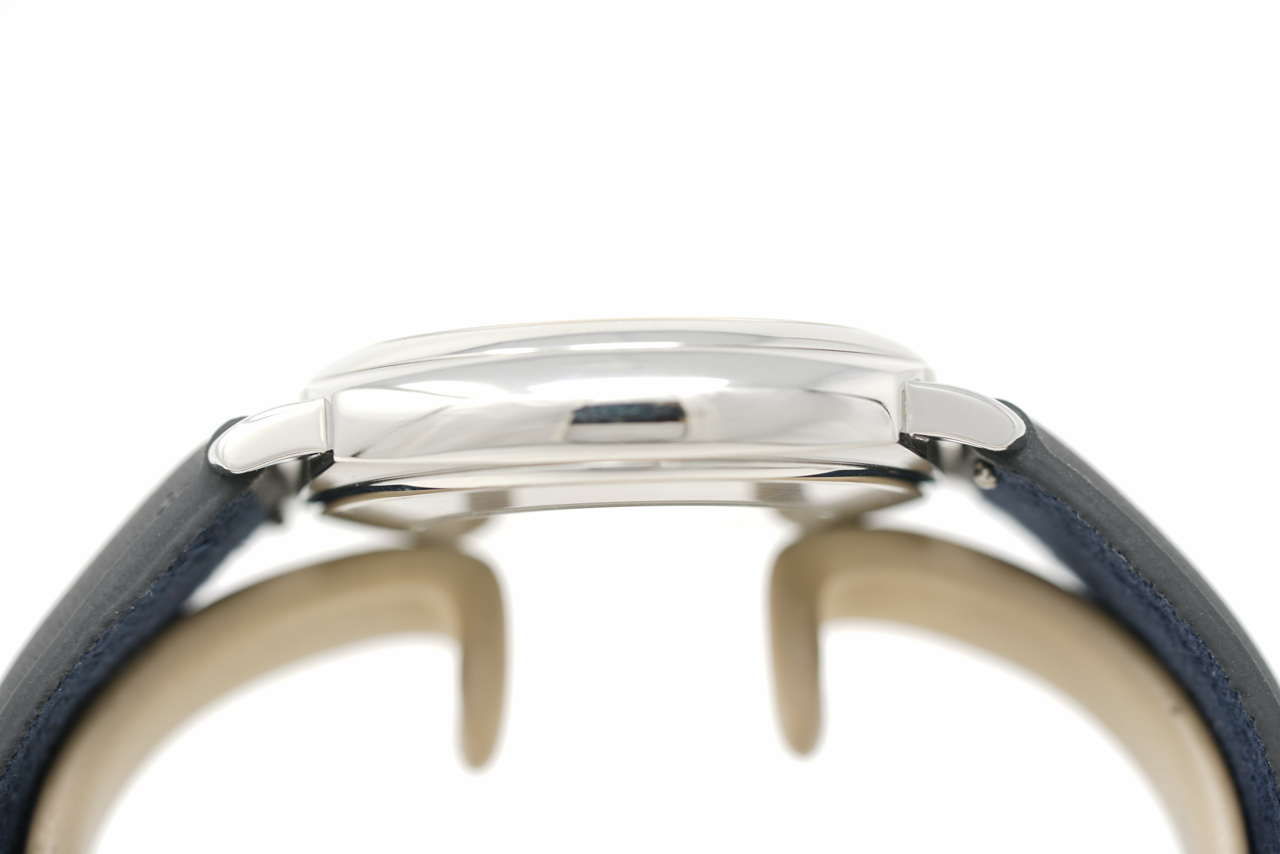 This pre-owned watch is in 87% condition due to slight marks on the lugs, bezel, and throughout the case. The strap is in 94% condition due to minor wear and creasing. Also included is an OEM strap in 86% condition due to slight creasing and marks on the clasp. Both straps will accommodate a wrist size up to 7 and 1/2 inches. Originally purchased in April 2021, this watch comes with its inner and outer box, warranty card, and the one-year Topper Pre-Owned Select warranty.